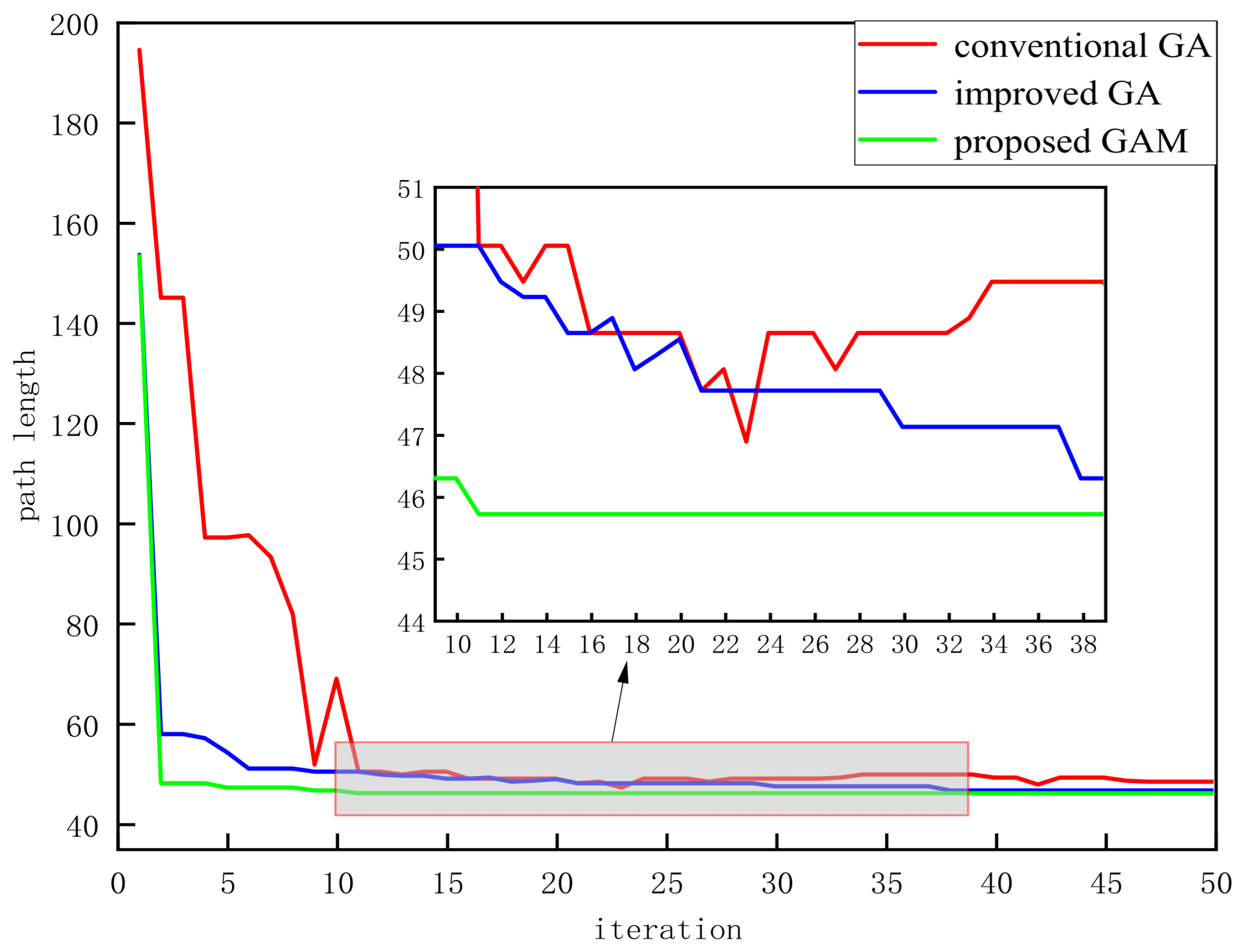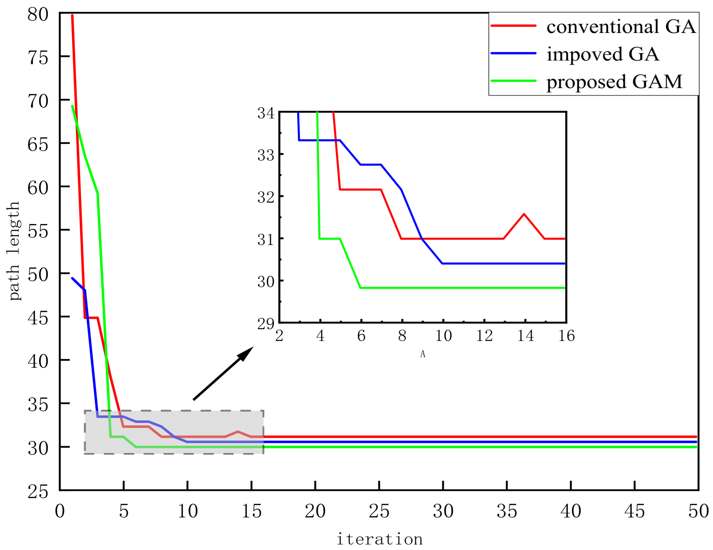The simulation results indicate that the proposed migration operator enables the GAM algorithm to find the optimal solution faster while also demonstrating superior performance in reducing the inflection points. It is noted that the inflection point is determined by comparing the two movement directions of the adjacent three nodes.