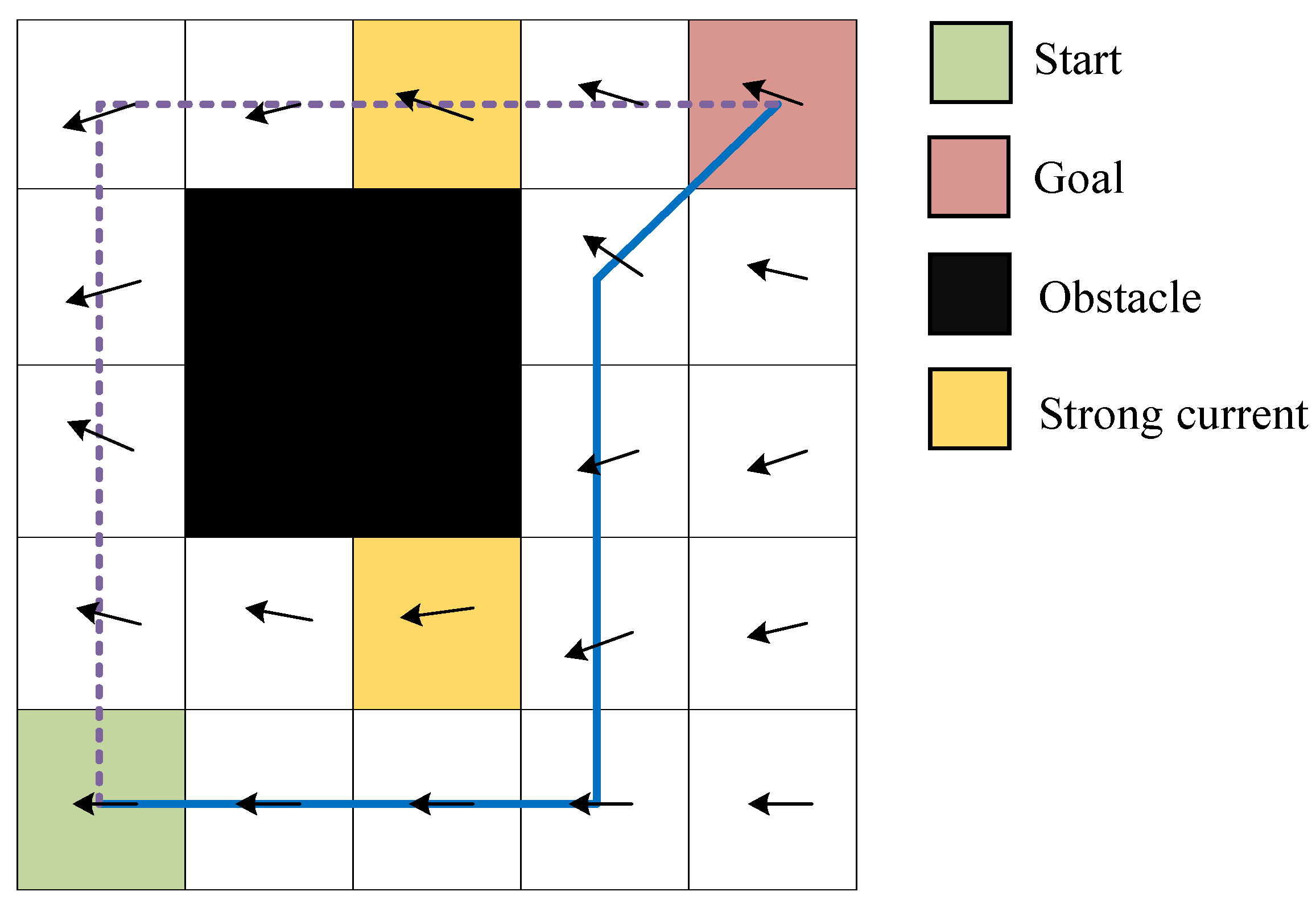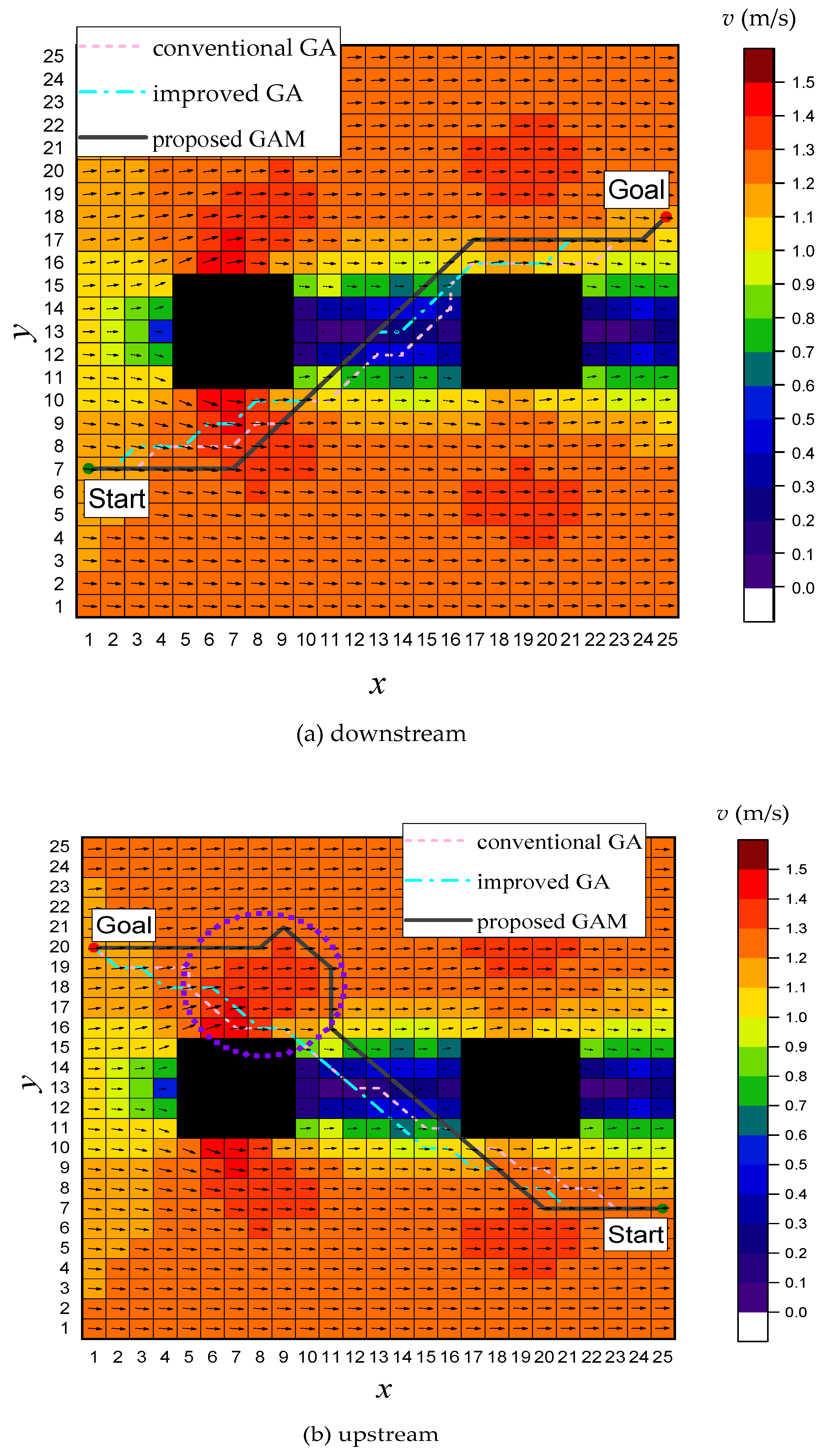 The pseudo-code of the proposed genetic algorithm combined with the migration (GAM) algorithm is shown in Algorithm 1. First, the initialization of population is performed. The obtained feasible solutions form a sequence of grid nodes. The fitness value of these feasible solutions is calculated by using a Euclidean distance-based evaluation function. Next, an elitist preservation strategy is employed. The feasible solution with the highest fitness value is selected and does not participate in subsequent operations. Afterwards, the migration operation is conducted to improve the fitness values of feasible solutions. The immigration and emigration rates are calculated and the paths for immigration and emigration are selected using the roulette wheel method. In the crossover stage, a random number within the range [0, 1] is generated to determine whether a crossover operation should be performed. The population is divided into three parts according to the fitness values and crossover is conducted within the same parts to reduce low-quality crossovers. First, all feasible solutions are ranked by their fitness values. Based on this ranking, they are categorized into three groups (good, medium, poor). Subsequently, within the same group, two feasible solutions are selected. A common node (excluding the start and end points) is randomly chosen as the crossover node to exchange their path segments. These solutions of intra-group crossover inherently impose a degree of constraint on the search direction. Compared to the traditional genetic algorithm, where two solutions are randomly selected from the entire population for crossover, our method substantially reduces the generation of low-quality offspring, thereby accelerating the convergence rate. Similar to the crossover operation, mutation is executed when the regenerated random number is less than the mutation probability. The population is sorted by fitness values. The top fifth is classified as elite solutions that do not undergo mutation, while the remaining solutions undergo mutation. Following the mutation stage, the fitness values of the population are updated and the optimal solution is recorded. When the maximum number of iterations has been reached, the iteration stops and the optimal path is obtained.
