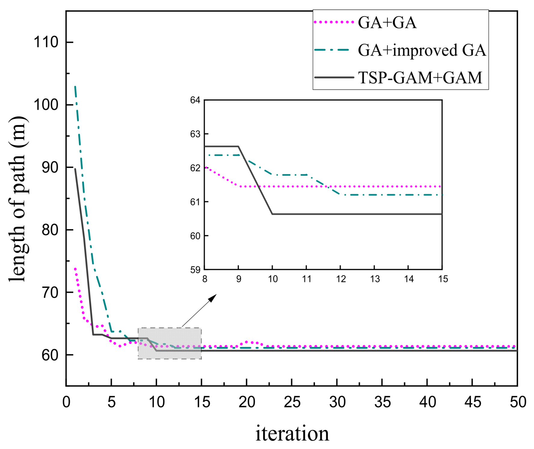 Table 1, the proposed GAM algorithm demonstrates superior performance across all evaluated metrics. Specifically, it achieves reductions of 58.57% and 12.78% in the average number of iterations, and 56.76% and 54.6% in the average number of turns, compared to the traditional genetic algorithm and the improved algorithm, respectively.