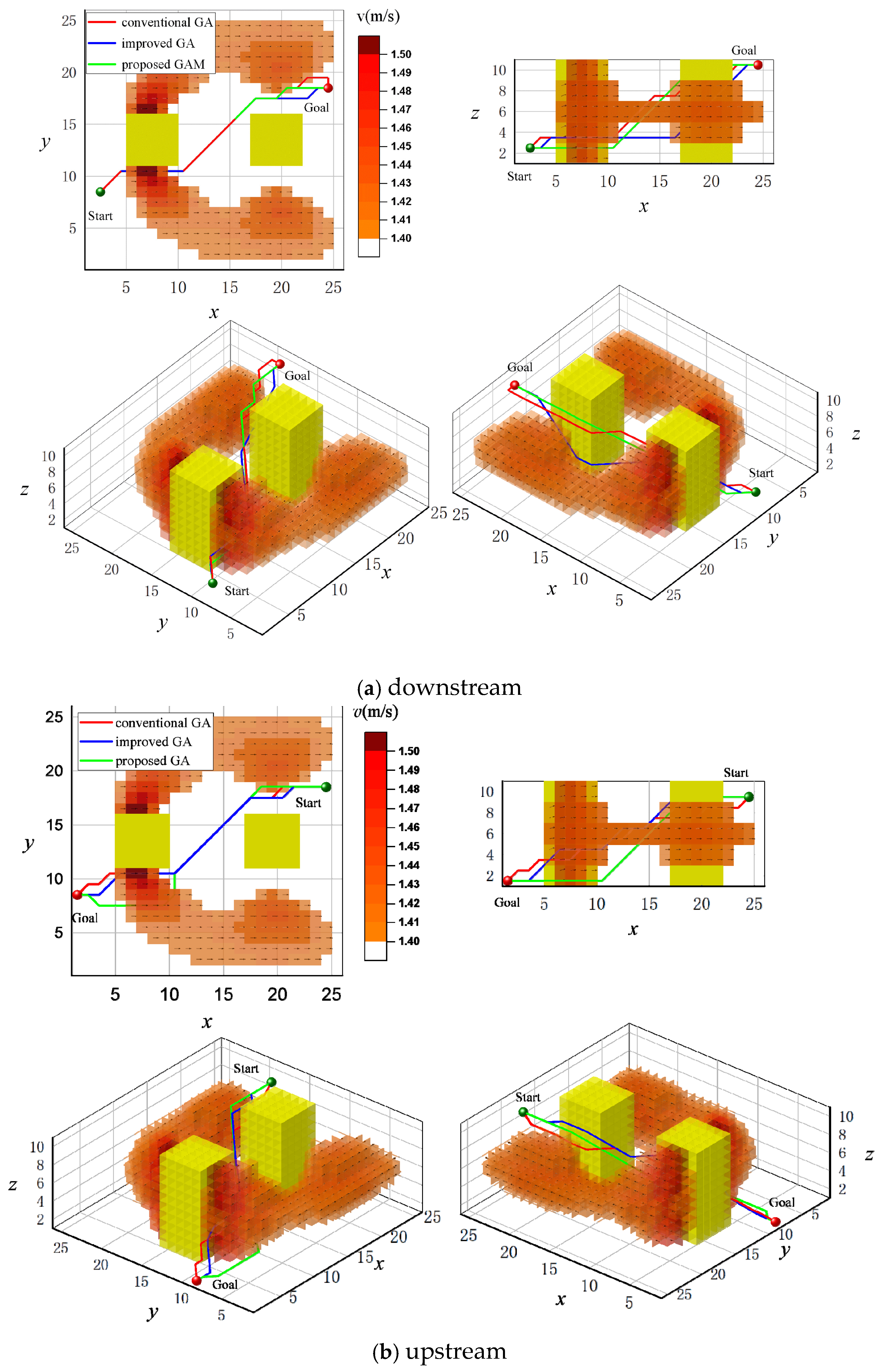 Figure 1, the underwater vehicle’s starting point is set at coordinates (1, 1), with target points at (a) (20, 20) and (b) (30, 30).