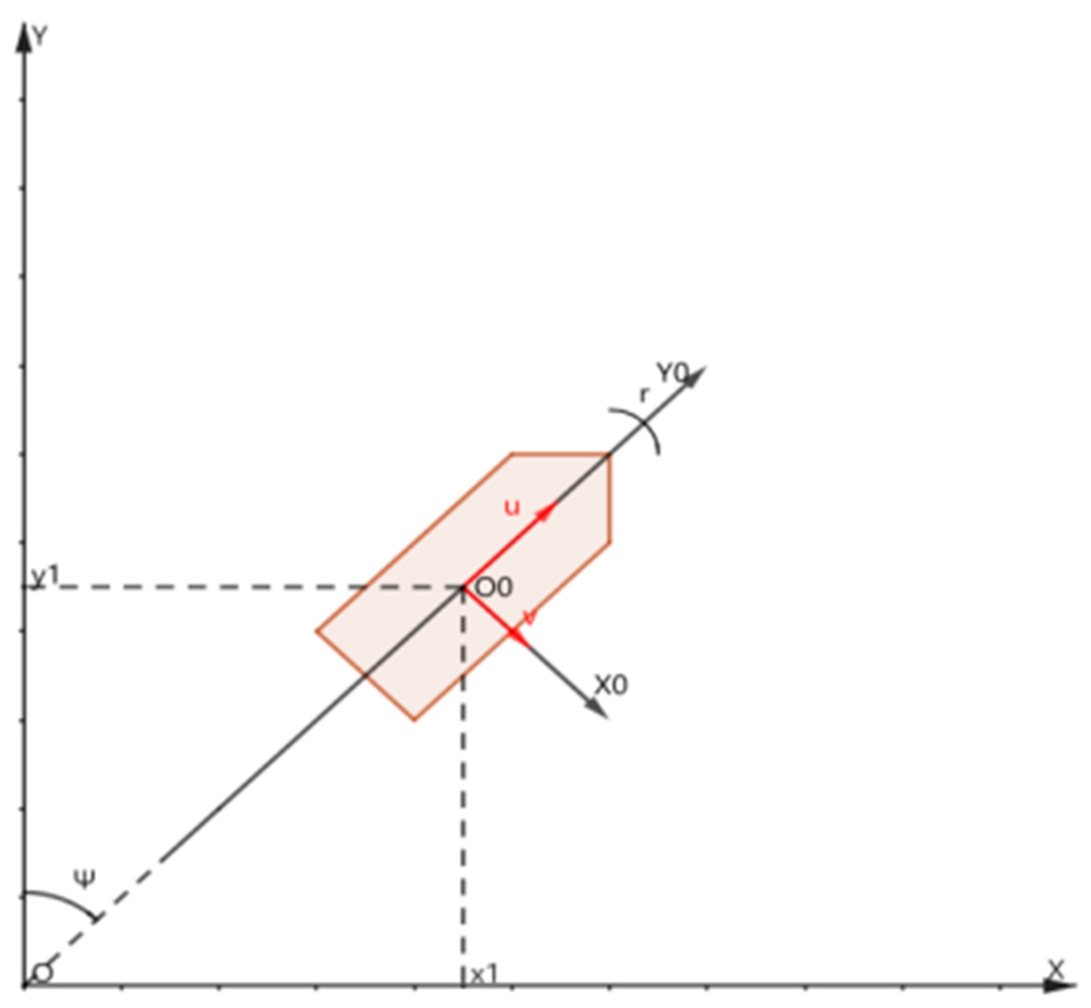 To focus on the path tracking control problem and reduce design complexity, this study simplifies the USV’s six-degree-of-freedom motion to a three-degree-of-freedom (3-DOF) motion in the horizontal plane, encompassing surge, sway, and yaw. To characterize the motion posture and dynamic relationship of the USV, this study defines two coordinate systems: the earth-fixed reference coordinate system (O-X-Y) and the body-fixed coordinate system (O0-X0-Y0). The 3-DOF dynamics and kinematics model of the USV is expressed as Equation (1), with the coordinate diagram depicted in Figure 1.