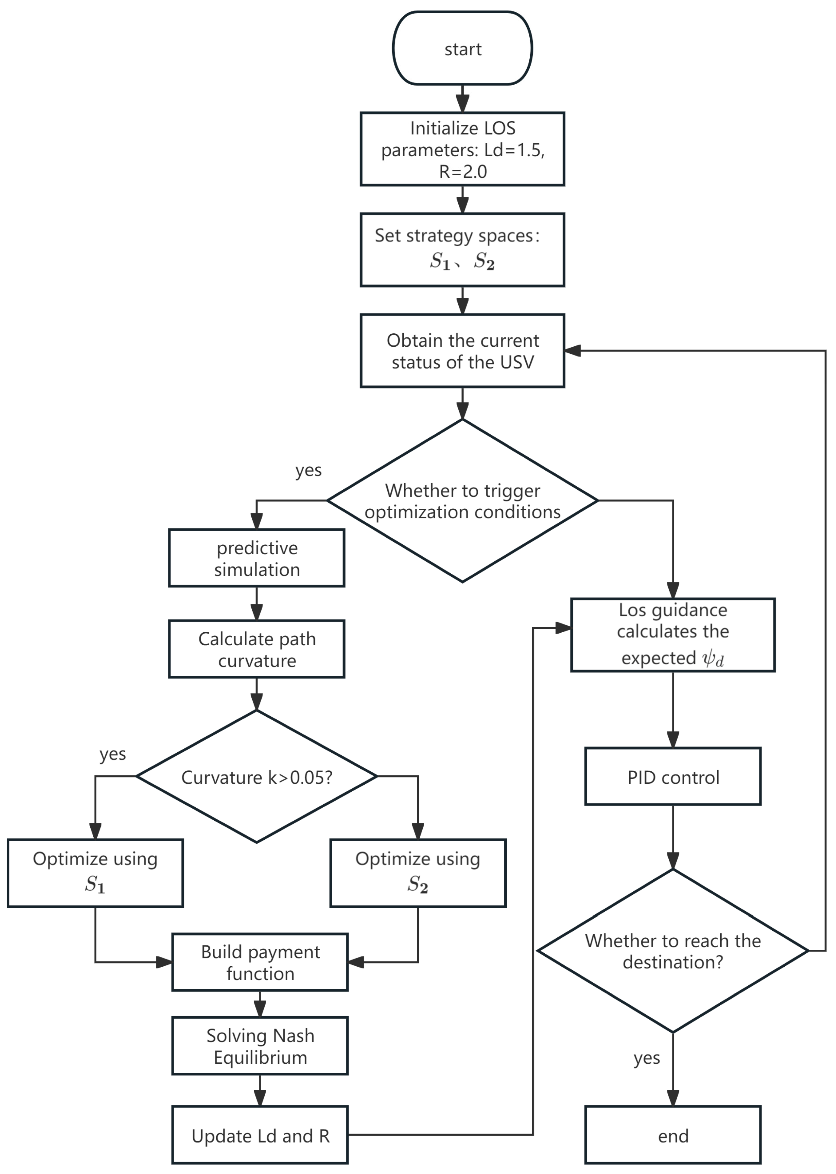 The fixed L d and R fail to achieve an ideal balance among tracking accuracy, motion smoothness, and control energy consumption. To address this, this paper proposes an adaptive LOS algorithm based on game theory, designated as the GTLOS (Game-Theoretic Line-of-Sight Algorithm, GTLOS) algorithm. The GTLOS algorithm builds upon the LOS algorithm by incorporating the strategy optimization concept from game theory, thereby enhancing the USV’s capability for coordinated optimization of multiple objectives under complex conditions.