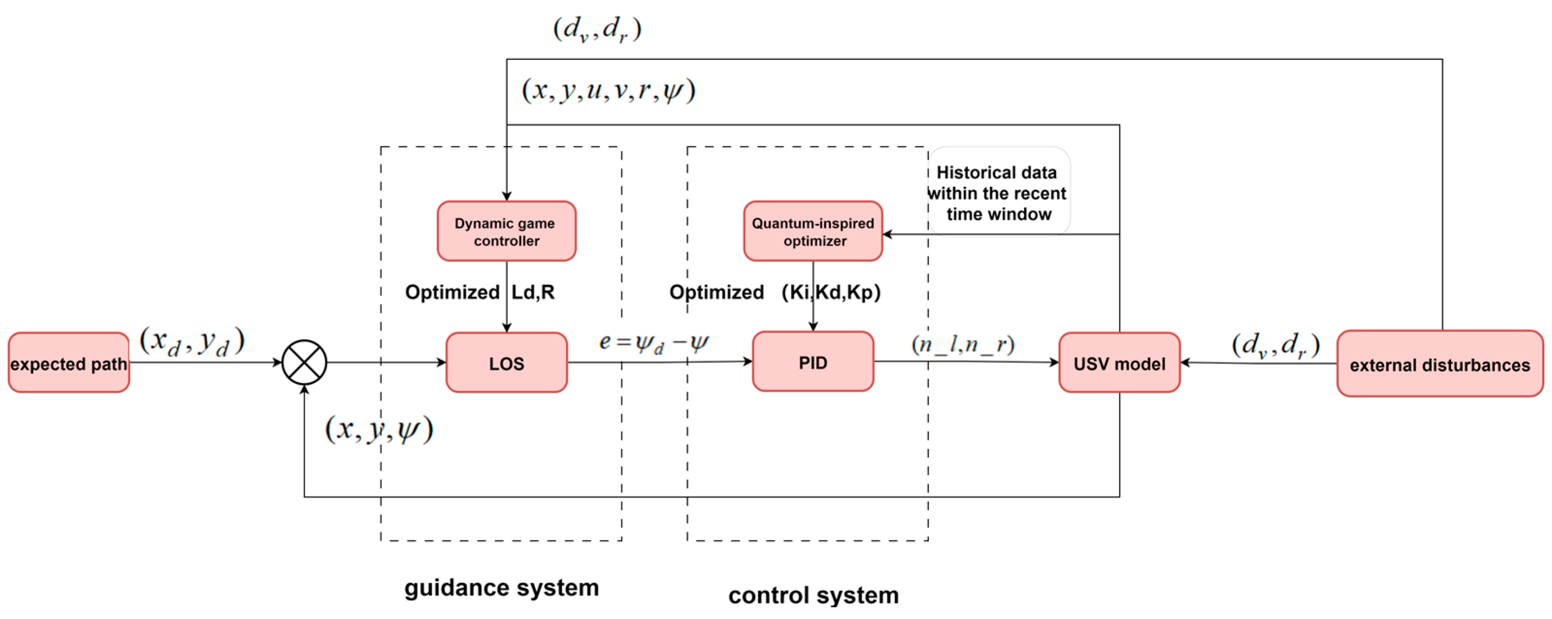 Addressing the aforementioned problems, this paper proposes an anti-disturbance path tracking control method integrating quantum-inspired optimization and dynamic game theory. This method comprises a two-layer optimization architecture: the upper layer, based on dynamic game theory, optimizes the guidance process by modeling the optimization problem of the look-ahead distance ( L d ) and switching radius ( R ) in the LOS guidance algorithm as a non-cooperative game, achieving adaptive adjustment to path changes and environmental disturbances through the solution of its Nash equilibrium. The lower layer, based on a quantum-inspired optimization algorithm, enhances the control process by employing quantum bit probability amplitude encoding for the PID parameter space and utilizing a quantum rotation gate mechanism for efficient global search, achieving online self-tuning of PID parameters under environmental disturbances.