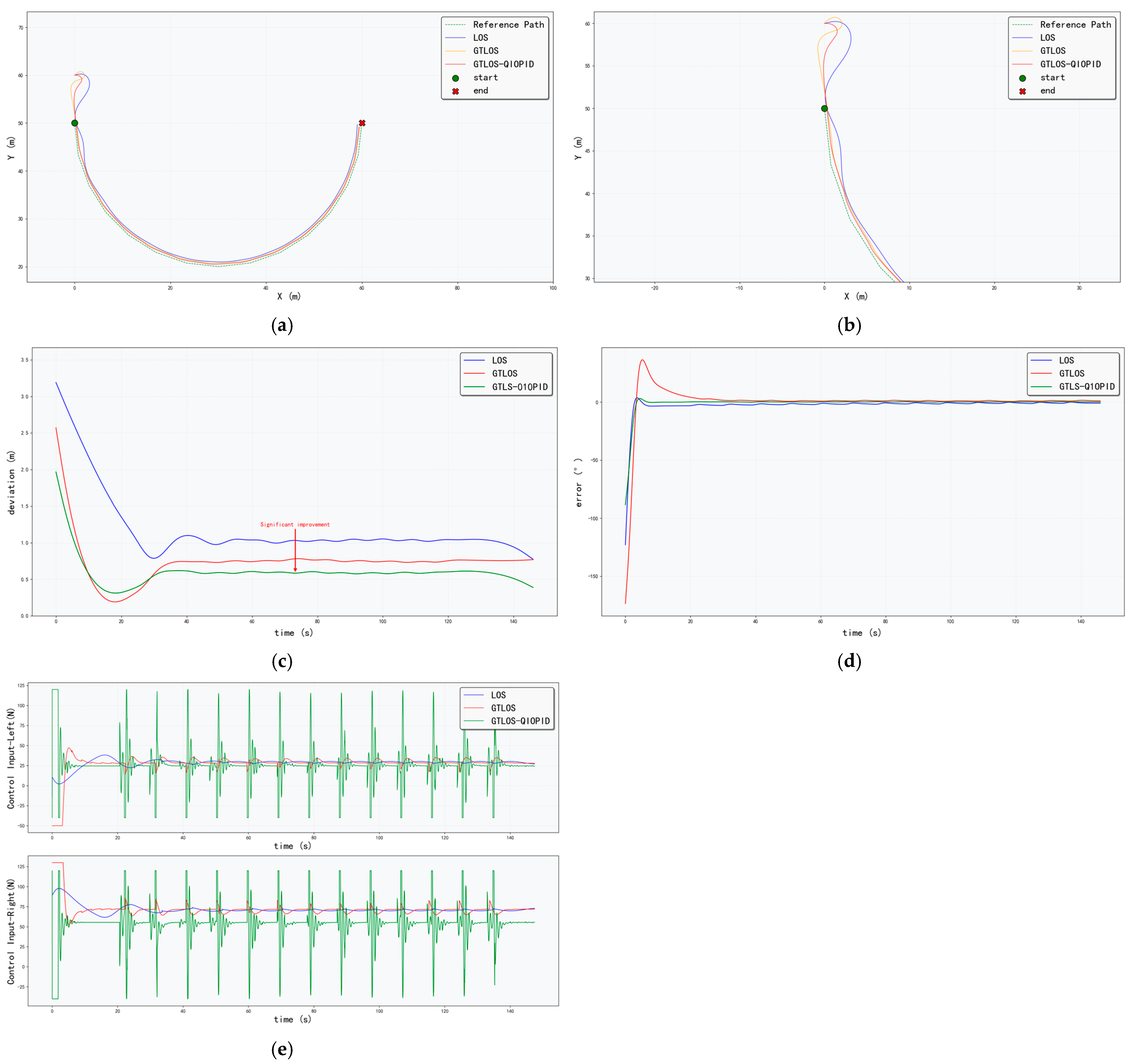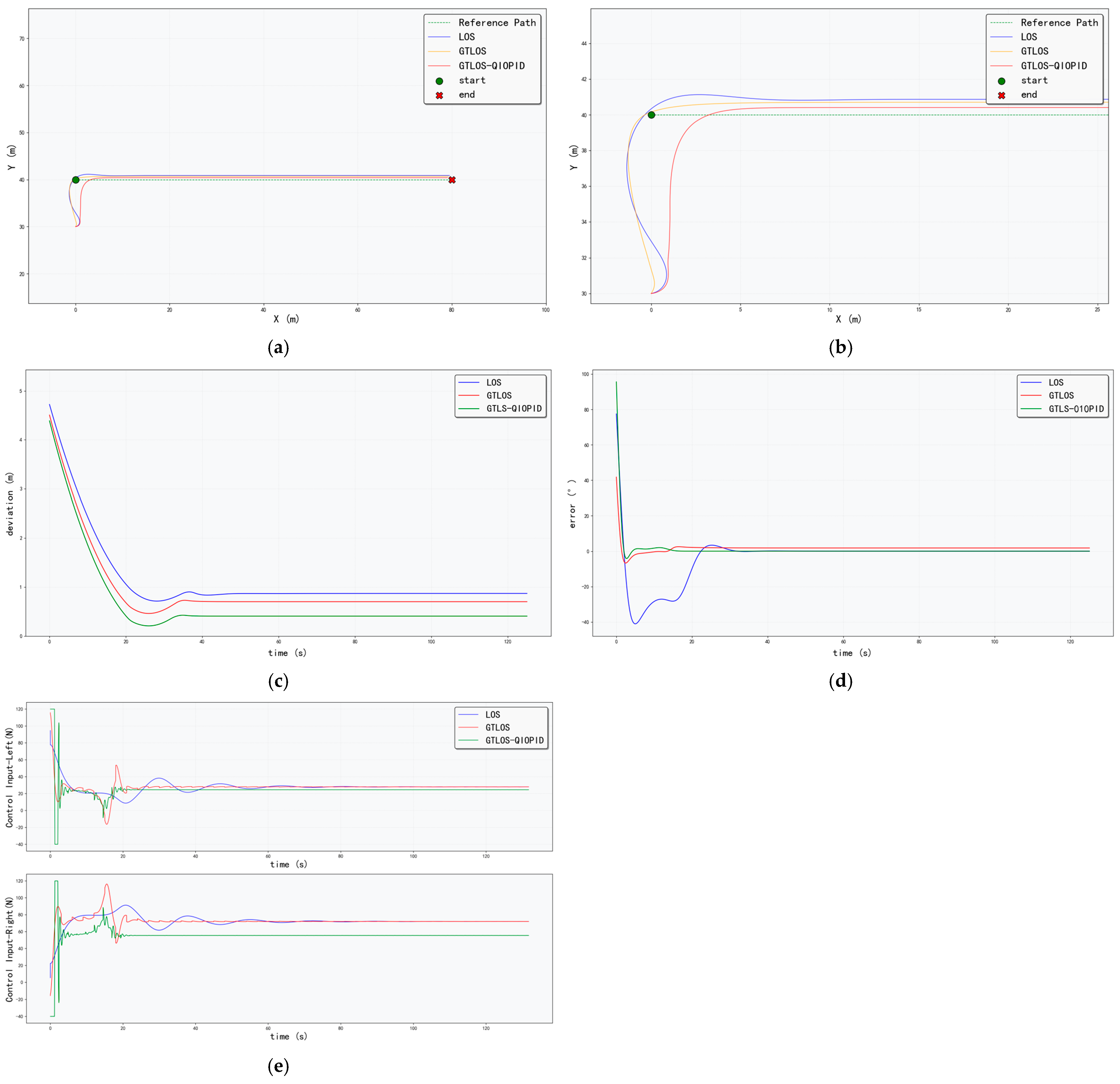 In terms of path-tracking accuracy, the GTLOS-QIO-PID method outperforms all other approaches, with a mean path deviation of 0.437, representing a 54.2% reduction compared with the conventional LOS-PID method (0.954). Additionally, it demonstrates superior error stability, with a path deviation variance of only 0.202, the smallest among all methods.