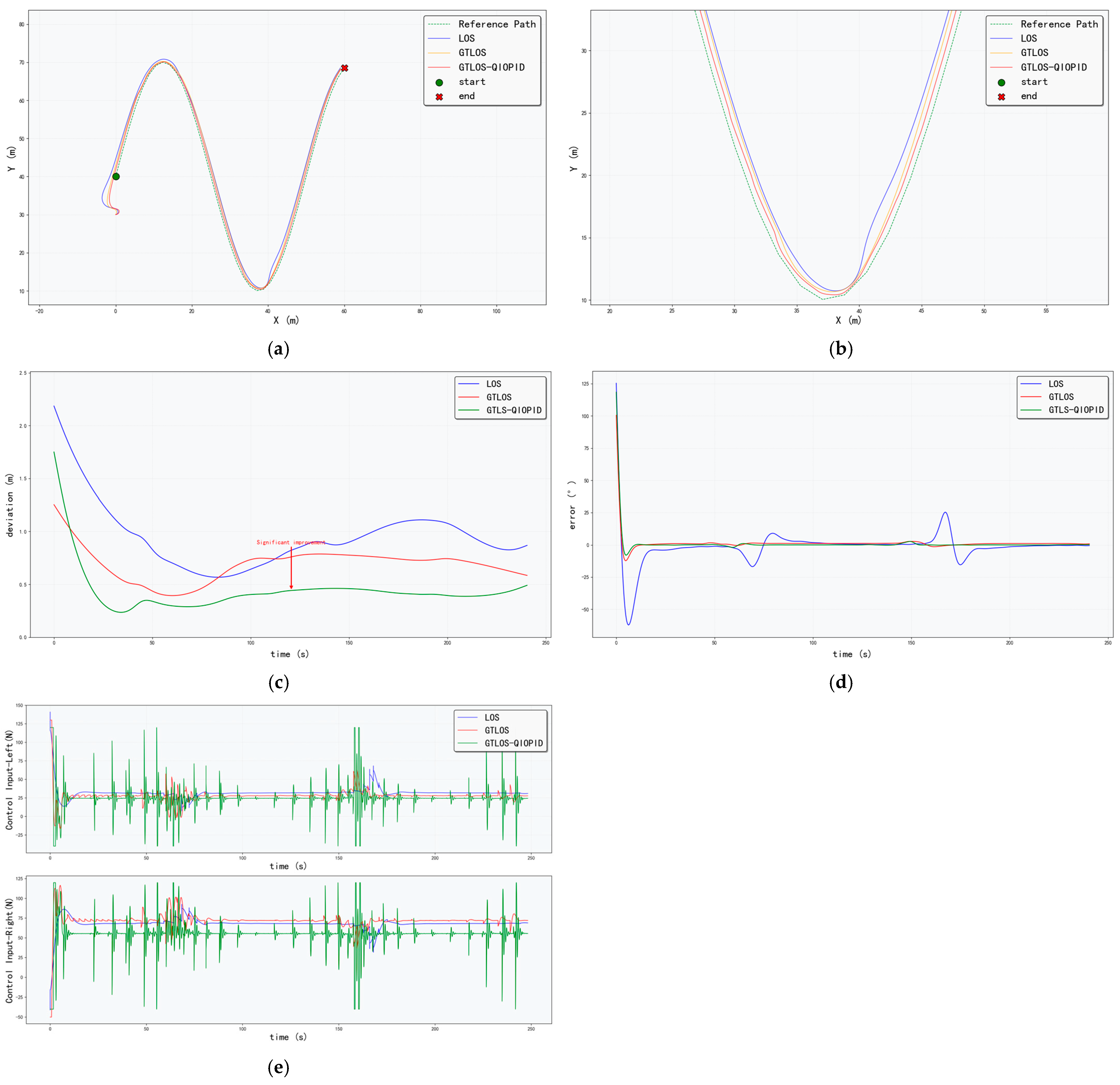 Figure 7. Simulation results for sine path. (a) compares the path-tracking trajectories of the conventional LOS-PID, GTLOS-PID, and GTLOS-QIO-PID methods. (b) shows a local zoomed-in view of the trajectory comparison. (c) presents the path deviation comparison. (d) shows the heading error comparison. (e) displays the comparison of control inputs.