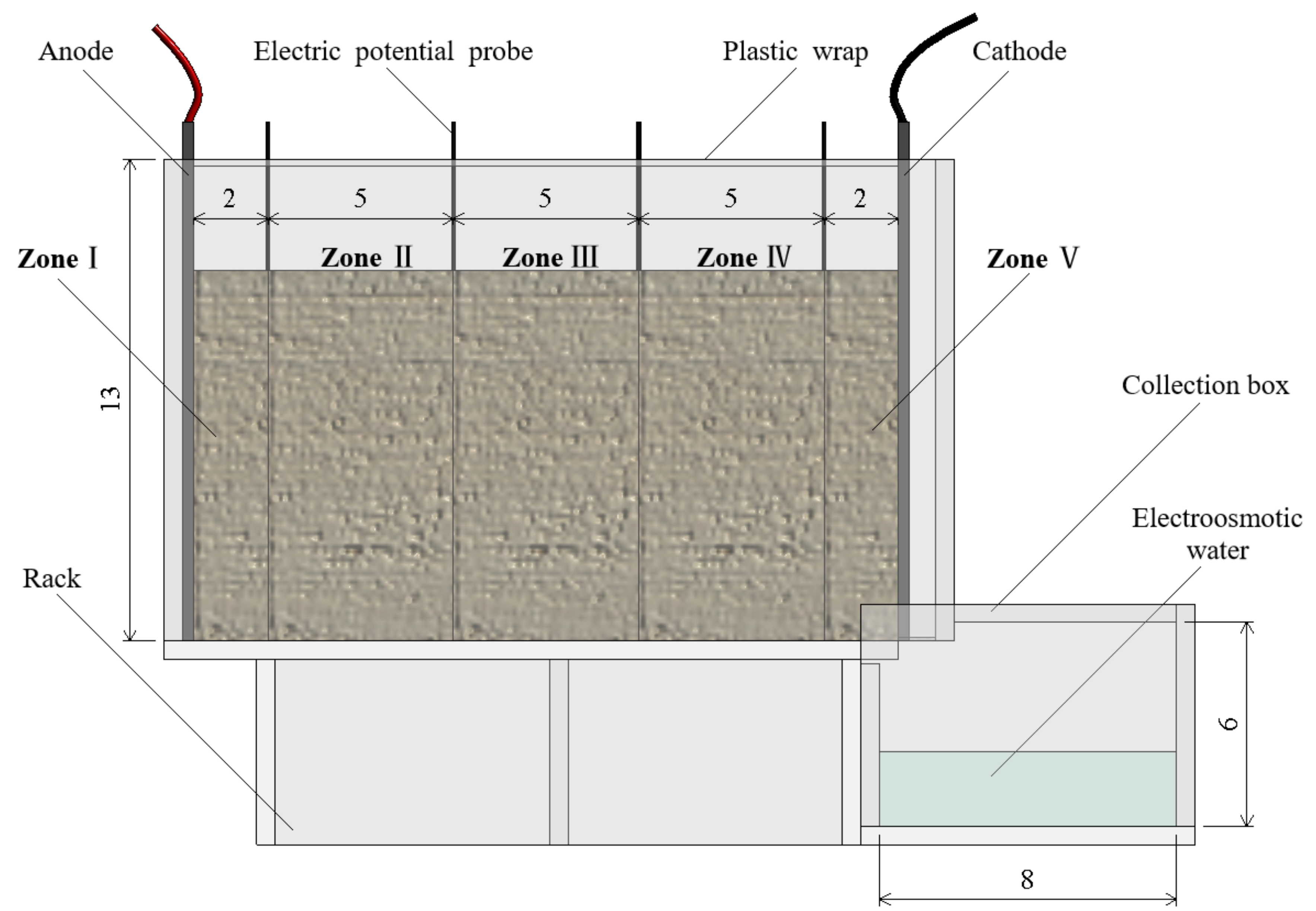 - Xue, Z.; Xiong, Q. Electro-Osmotic Chemical Behavior of Clayey Soil under Various Boundary Conditions. J. Cent. South Univ. 2021, 28, 1493–1504. [Google Scholar] [CrossRef]