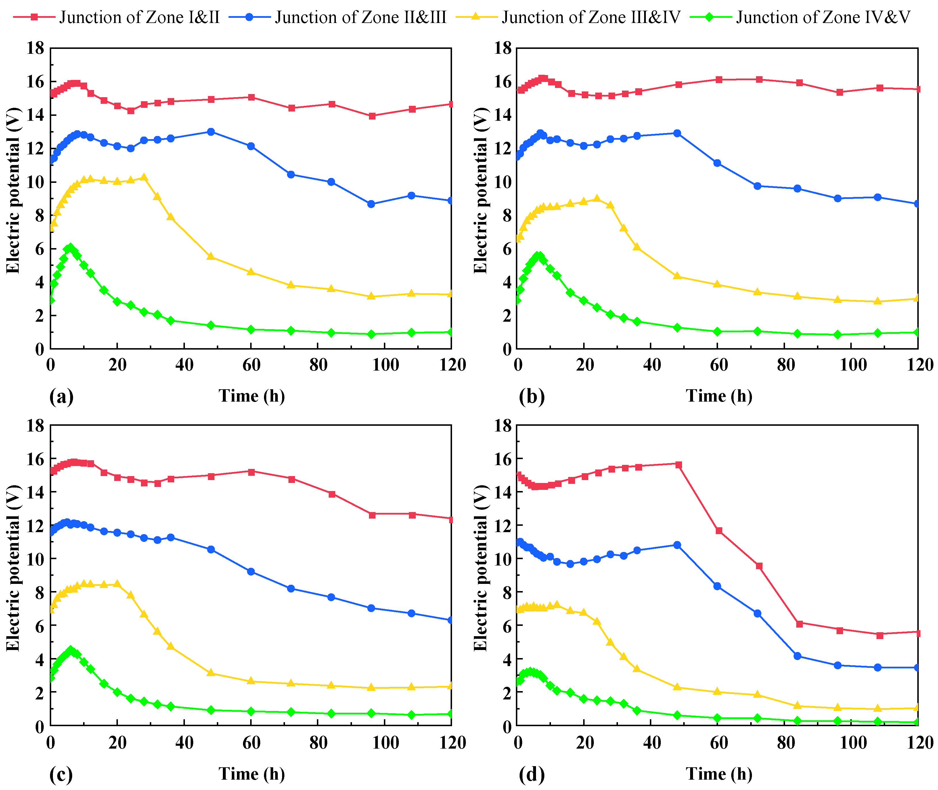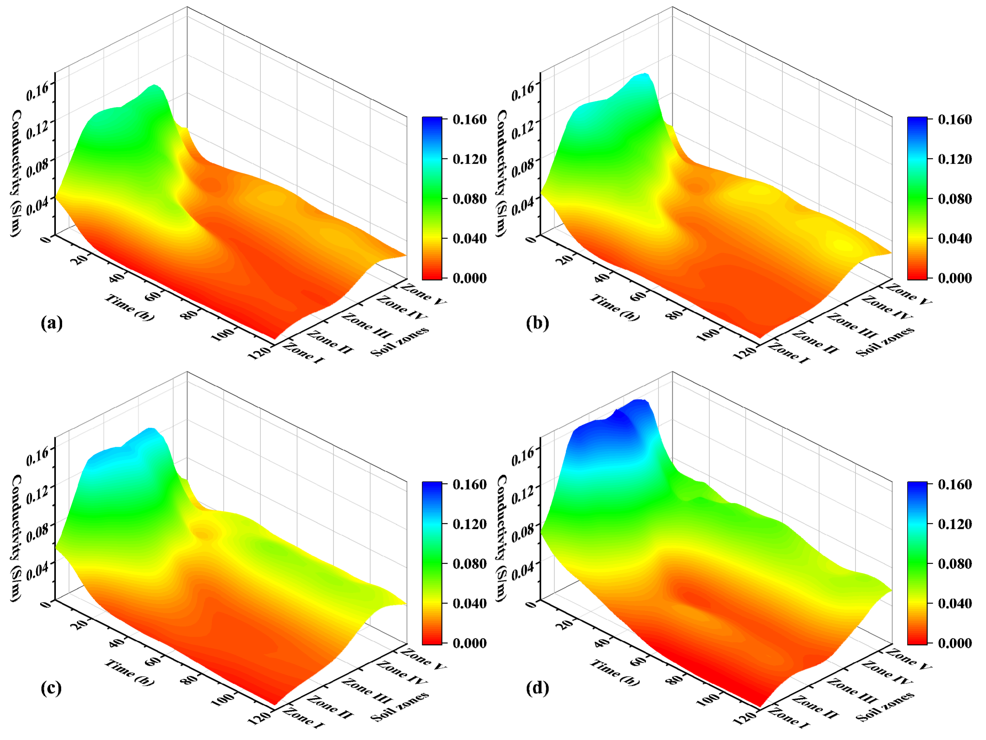 - During the electroosmotic dewatering process, distinct spatiotemporal variations in electrical conductivity were observed. Pore water was first expelled from the cathode in Zones IV and V, causing a decrease in soil conductivity in these zones. As pore water migrated from Zones I to III towards the cathode, the conductivity in Zones I to III decreased in the order of Zone I, Zone III, and Zone II, while the conductivity in Zones IV to V slightly recovered during the mid-phase of the experiment and remained essentially unchanged towards the end.
