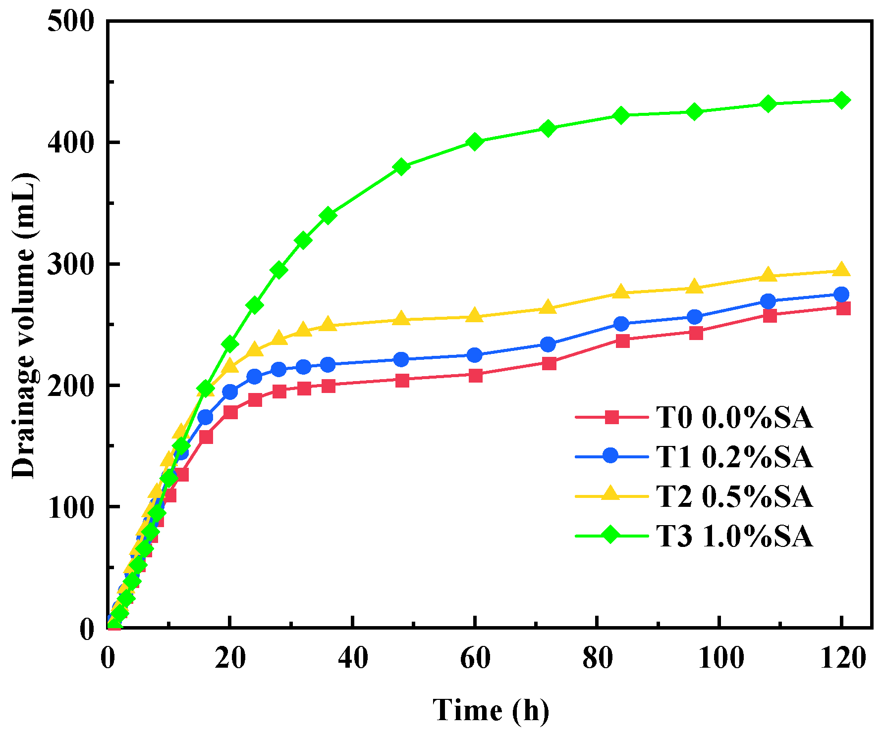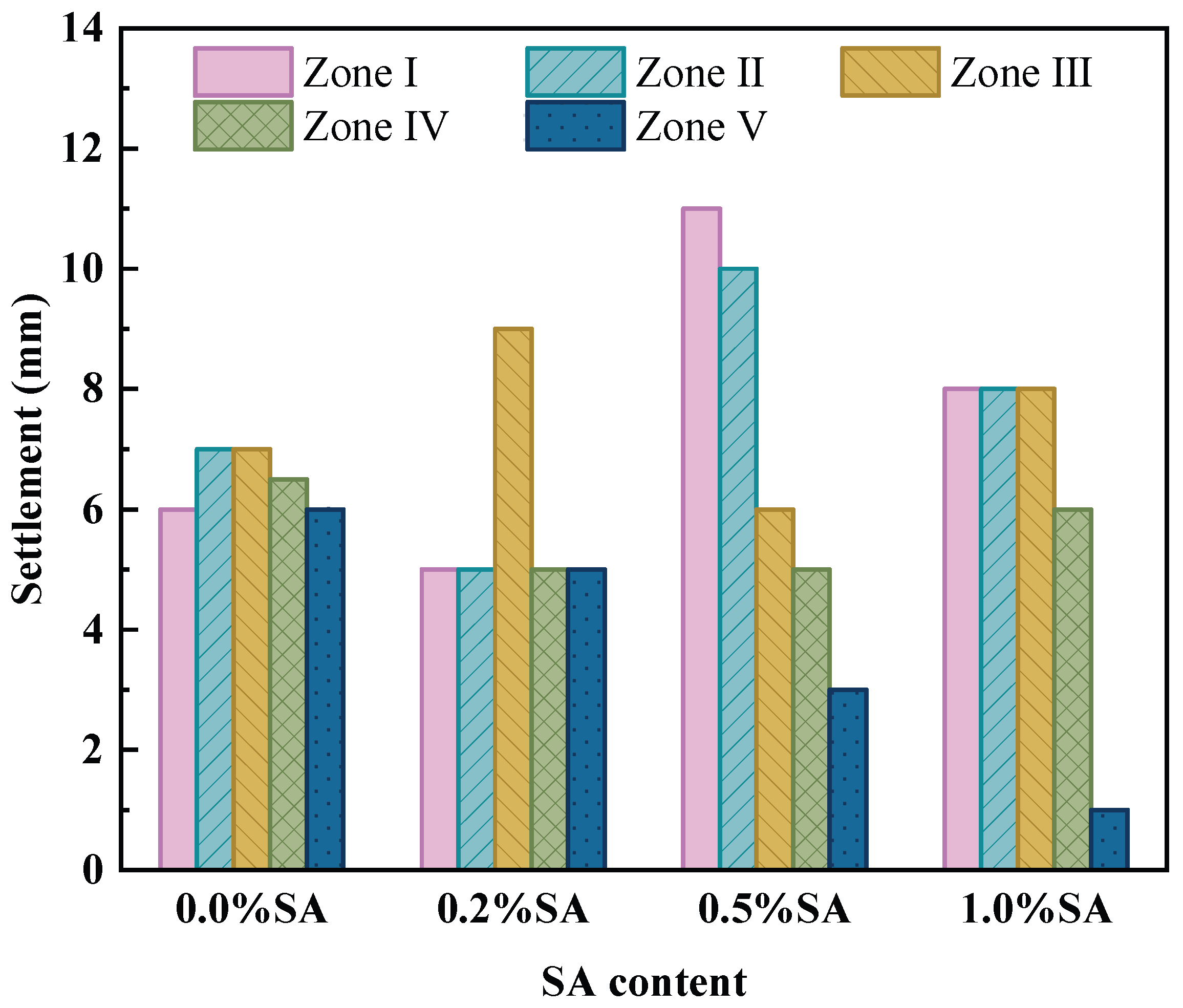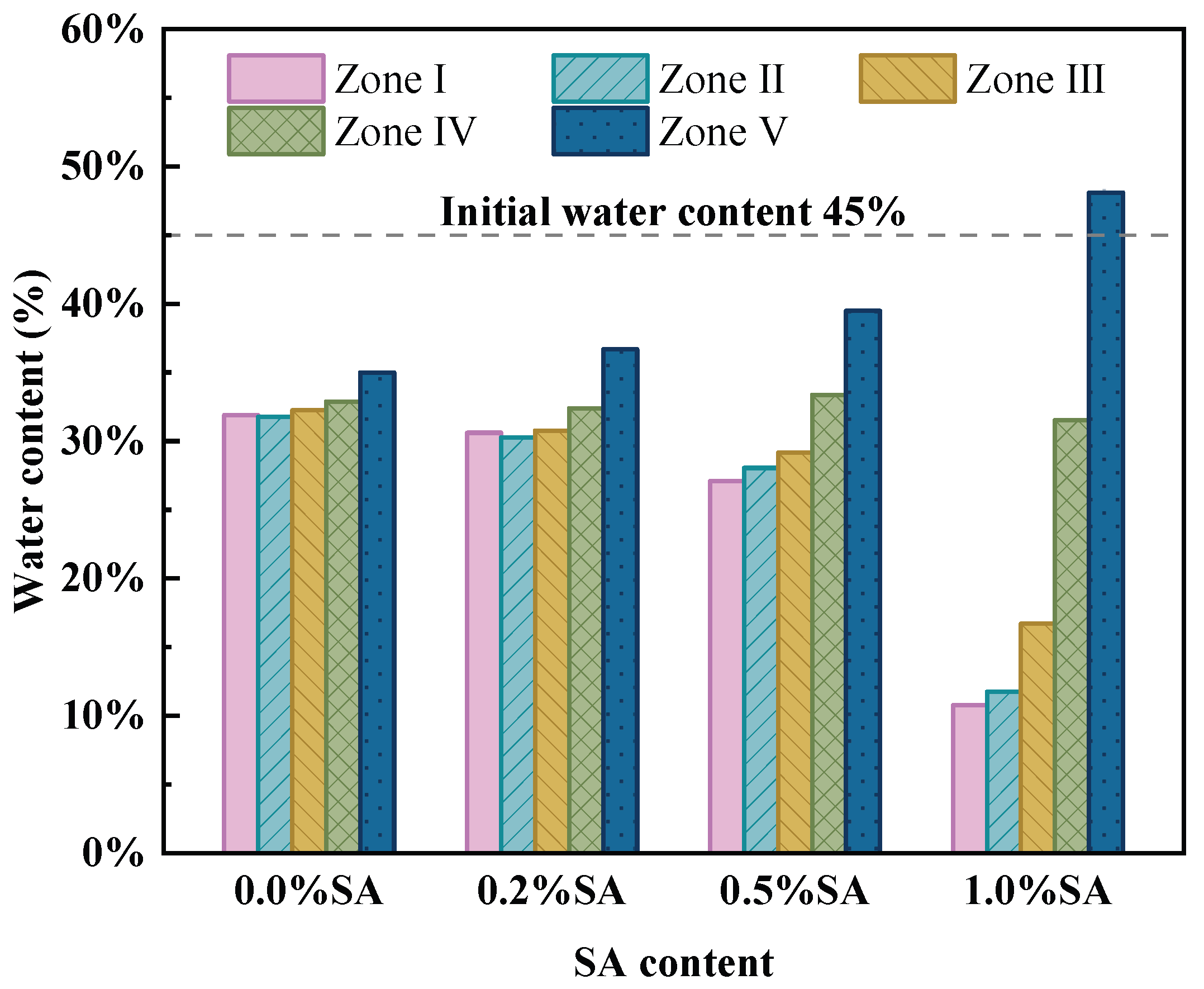 - SA increases soil conductivity, accelerates the drainage rate, and prolongs the effective electroosmotic dewatering time. The total drainage volume increased with higher SA content. Specifically, for SA contents of 0.0%, 0.2%, 0.5%, and 1.0%, the average water content decreased by 12.78%, 13.18%, 14.18%, and 20.86%, respectively. Notably, in the 1.0% SA group, the water content in the anode region (Zone I) decreased by approximately 35%, demonstrating a significant promotion of drainage.