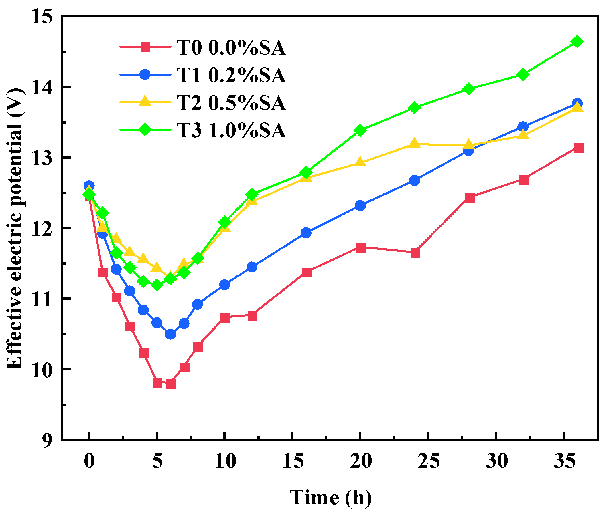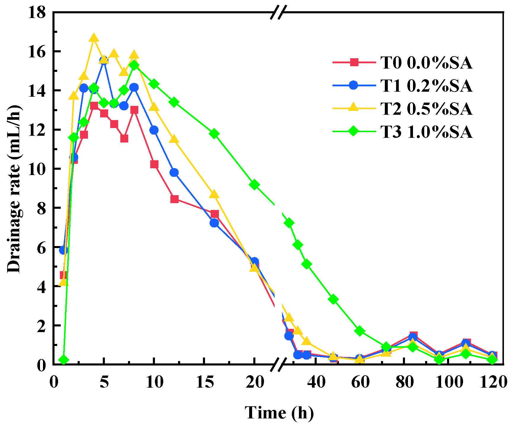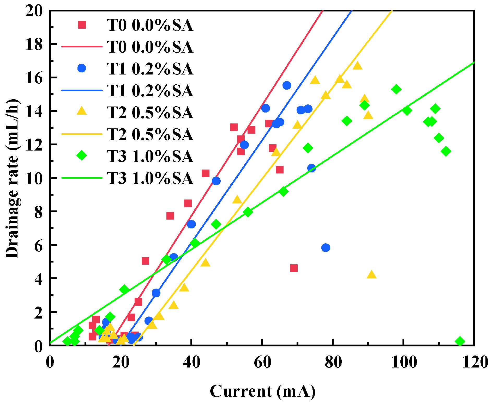 - SA increases soil conductivity, accelerates the drainage rate, and prolongs the effective electroosmotic dewatering time. The total drainage volume increased with higher SA content. Specifically, for SA contents of 0.0%, 0.2%, 0.5%, and 1.0%, the average water content decreased by 12.78%, 13.18%, 14.18%, and 20.86%, respectively. Notably, in the 1.0% SA group, the water content in the anode region (Zone I) decreased by approximately 35%, demonstrating a significant promotion of drainage.