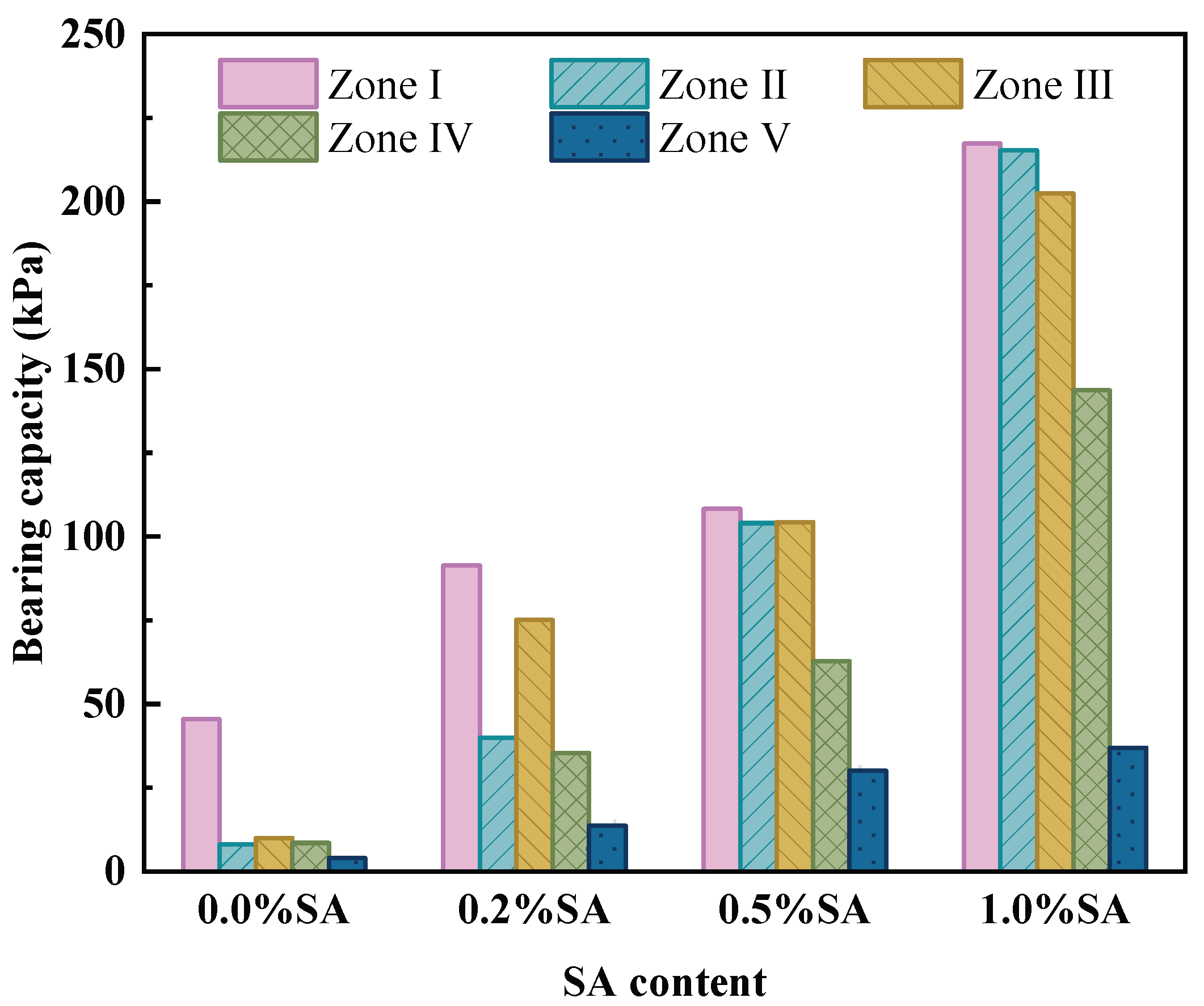 - The bearing capacity of the soil after electroosmotic reinforcement was markedly improved by SA addition. The average bearing capacity of the 0.5% SA group reached approximately 86 kPa, which is about 7 times that of the control group (0.0% SA). From an engineering-economic perspective, this substantial strength gain was achieved with a relatively controlled cost, as the energy consumption coefficient increased by only 21% compared to the control.