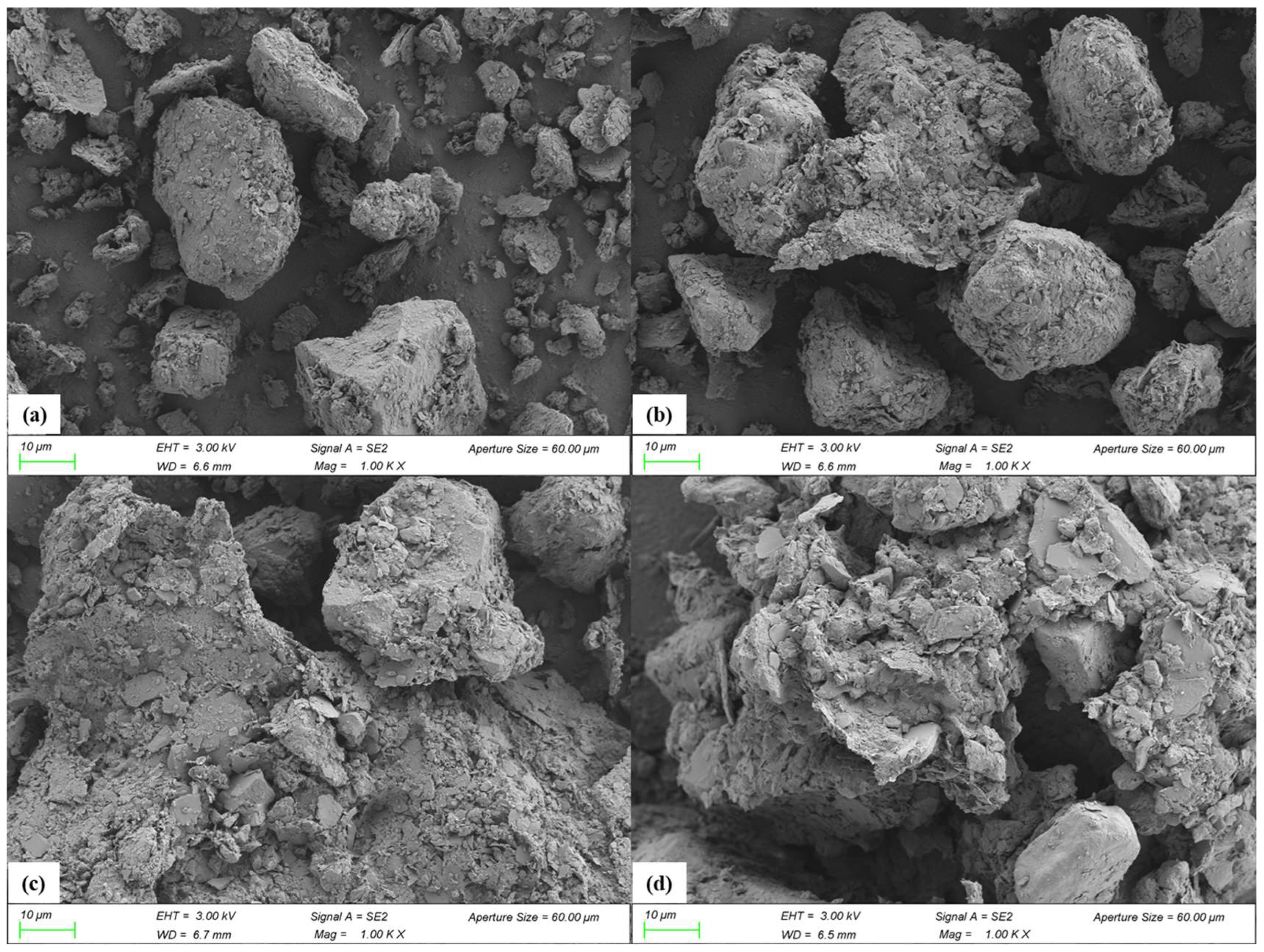 - The addition of SA significantly alters the inherent properties of the soil. SEM analysis confirmed the formation of the SA cross-linked structure, which bridges soil particles and fills inter-particle pores, as well as enhances the soil’s water retention capacity. Quantitatively, for soil with 1.0% SA, the liquid limit increased significantly from 32.34% to 49.15%, while the plastic limit showed a minor increase from 18.45% to 23.52%.