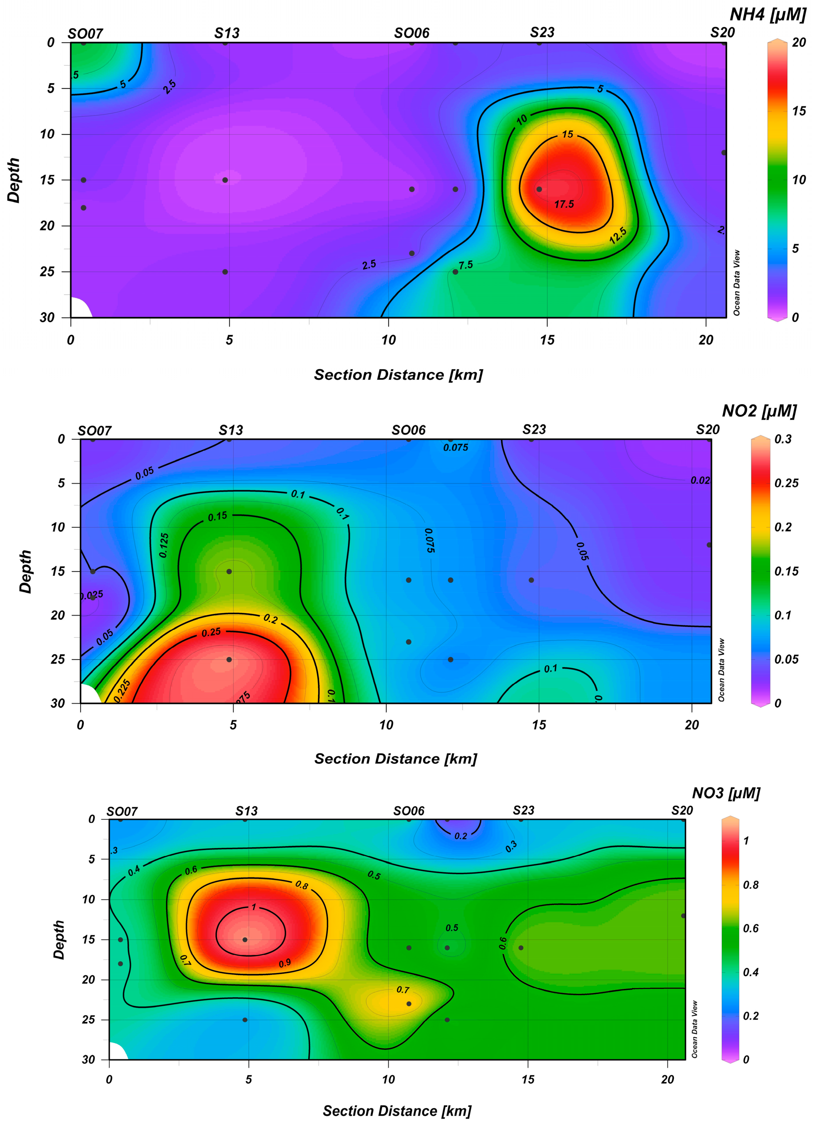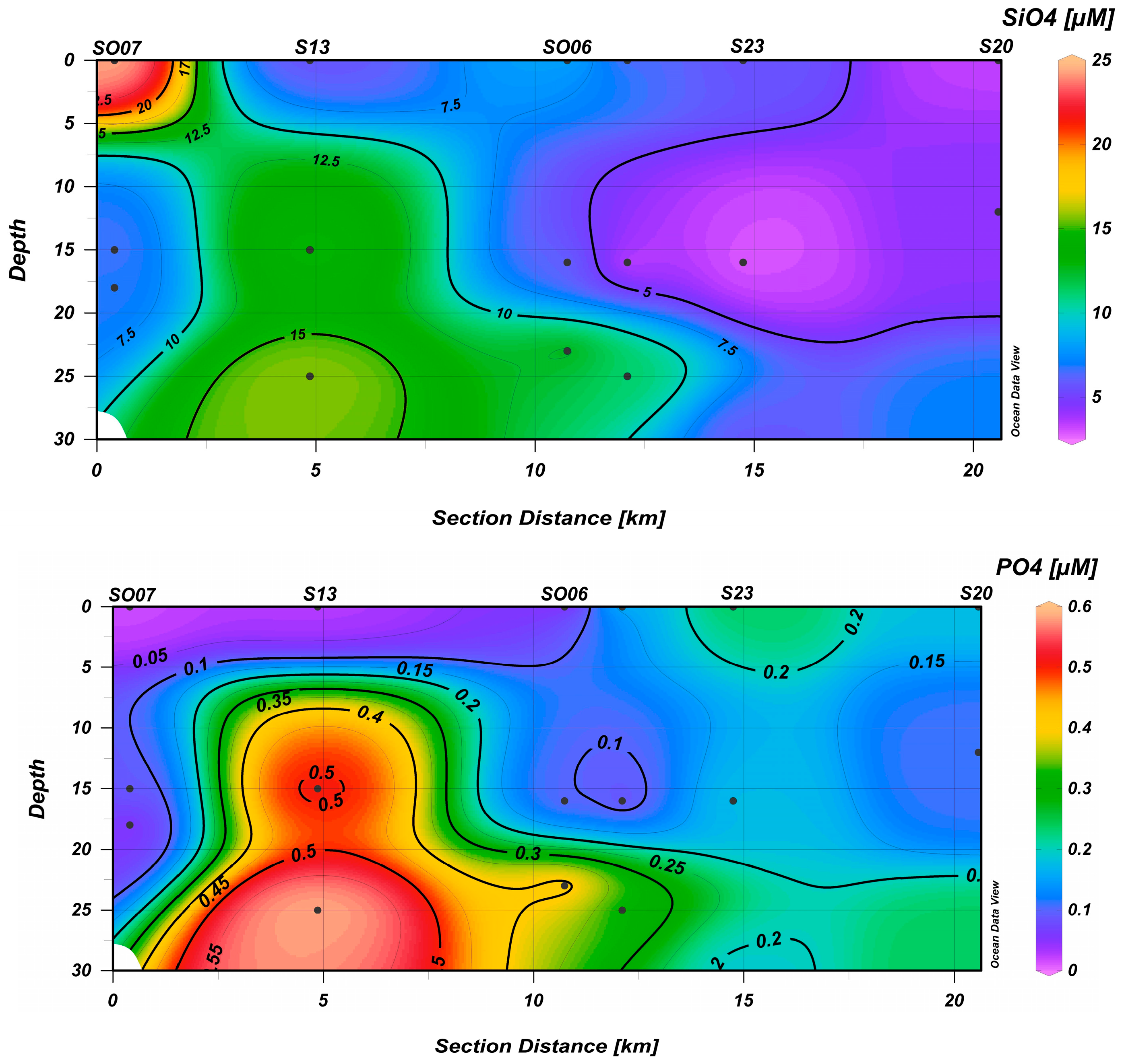 2.3.1. Nutrients (PO43−, SiO44−, NO2−, NO3−, NH4+)