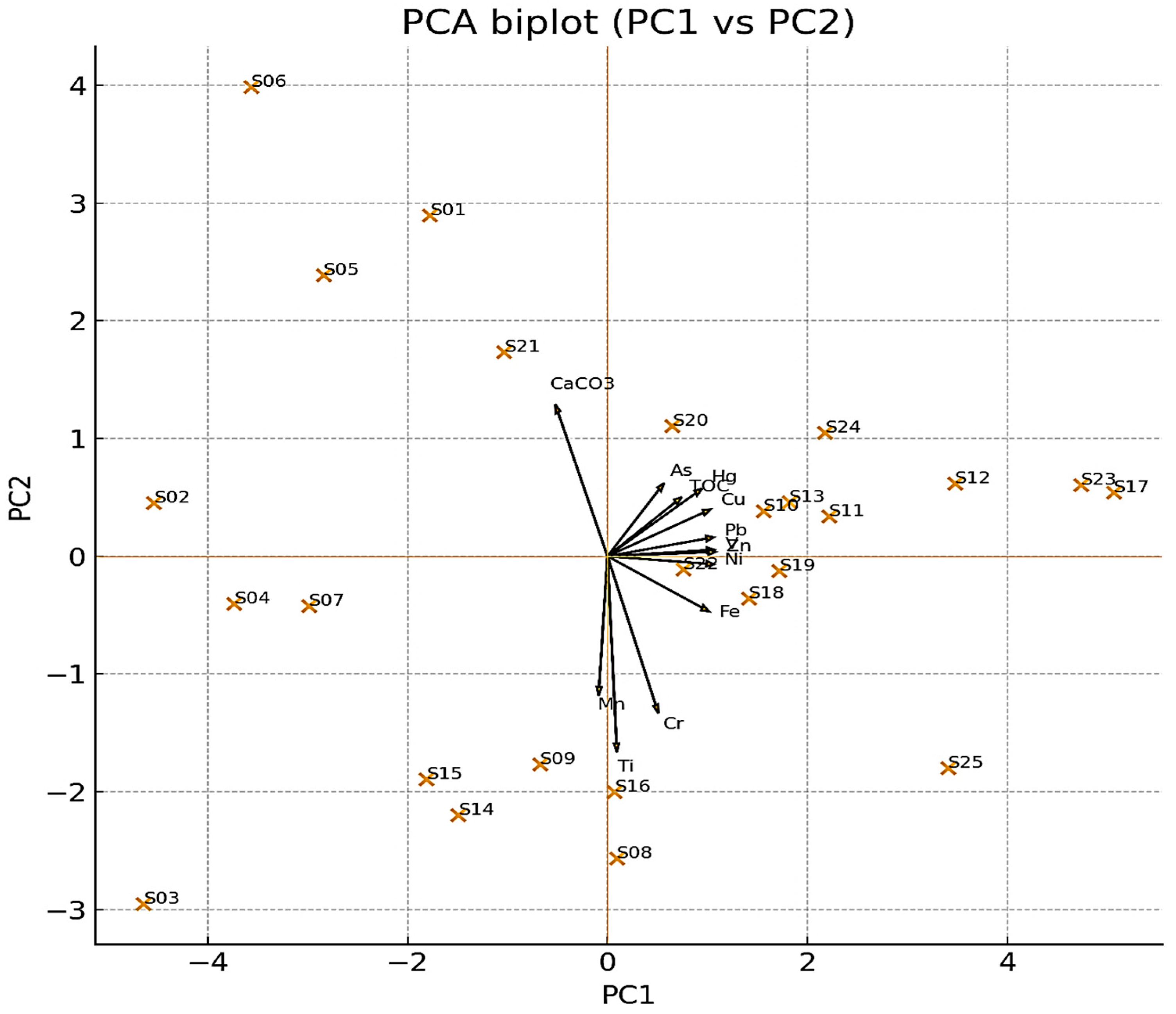 - Hg: 0.016–0.090 ppm, maximum at S23 (nearshore).