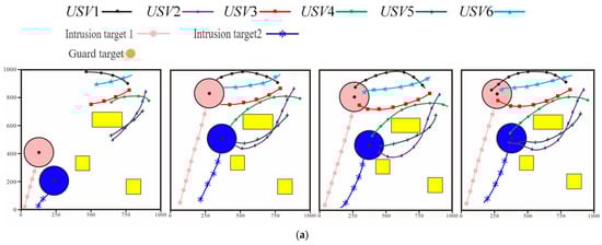 The success condition for the multi-USV system to intercept is defined as follows. For any intruder , there exists an unmanned surface vessel such that the distance to the intruder satisfies . The successful intrusion of an intruder is defined as follows: . Here, represents the dangerous radius of the guarded target, and represents the distance between the intrusion target and the guarded target at time . The calculation method of is shown in Equation (44).