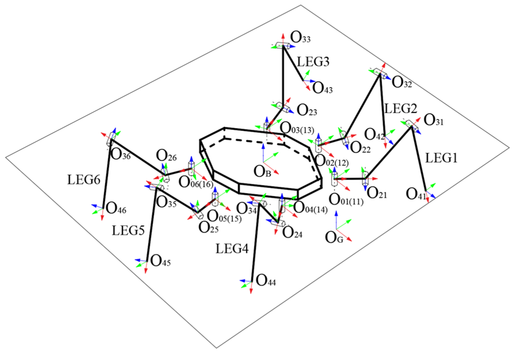 3.1. The Establishment of the Kinematic Modeling of the Underwater Hexapod Robot
