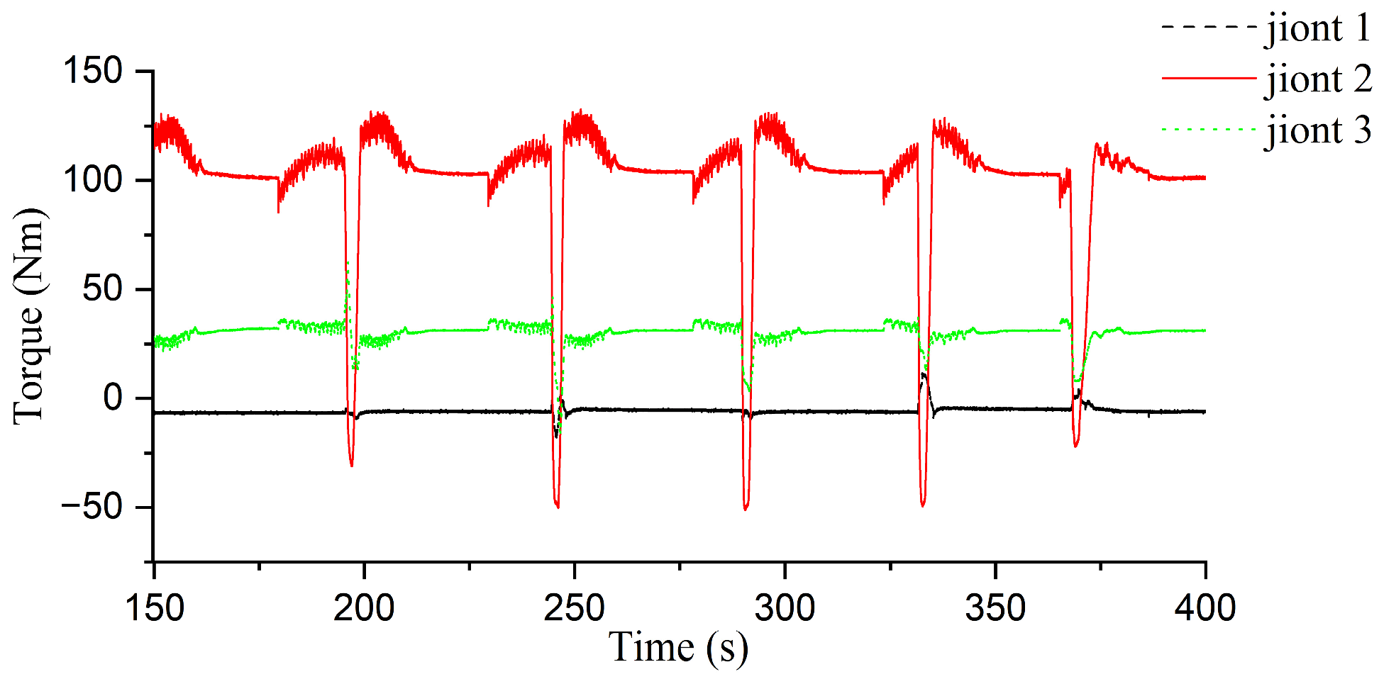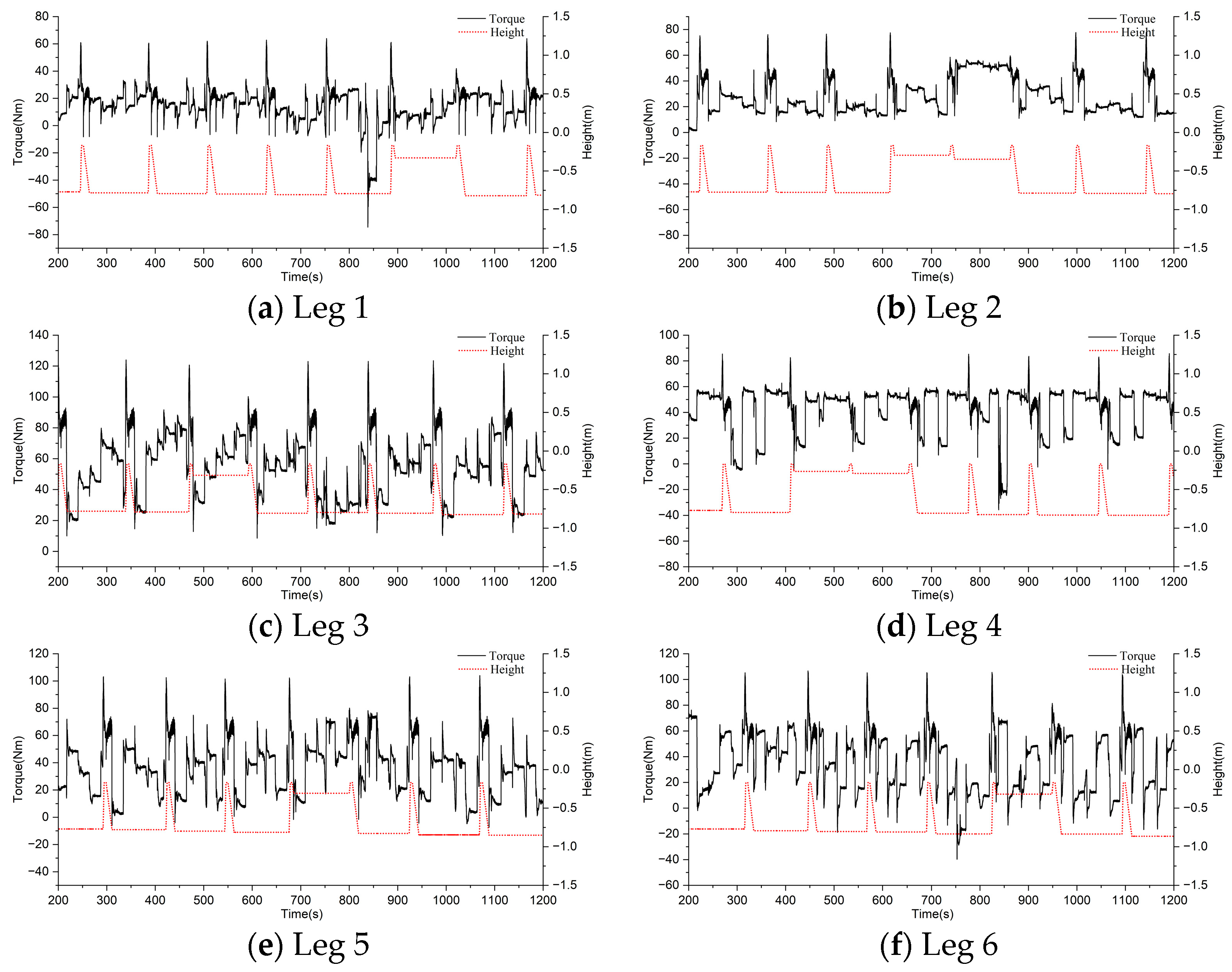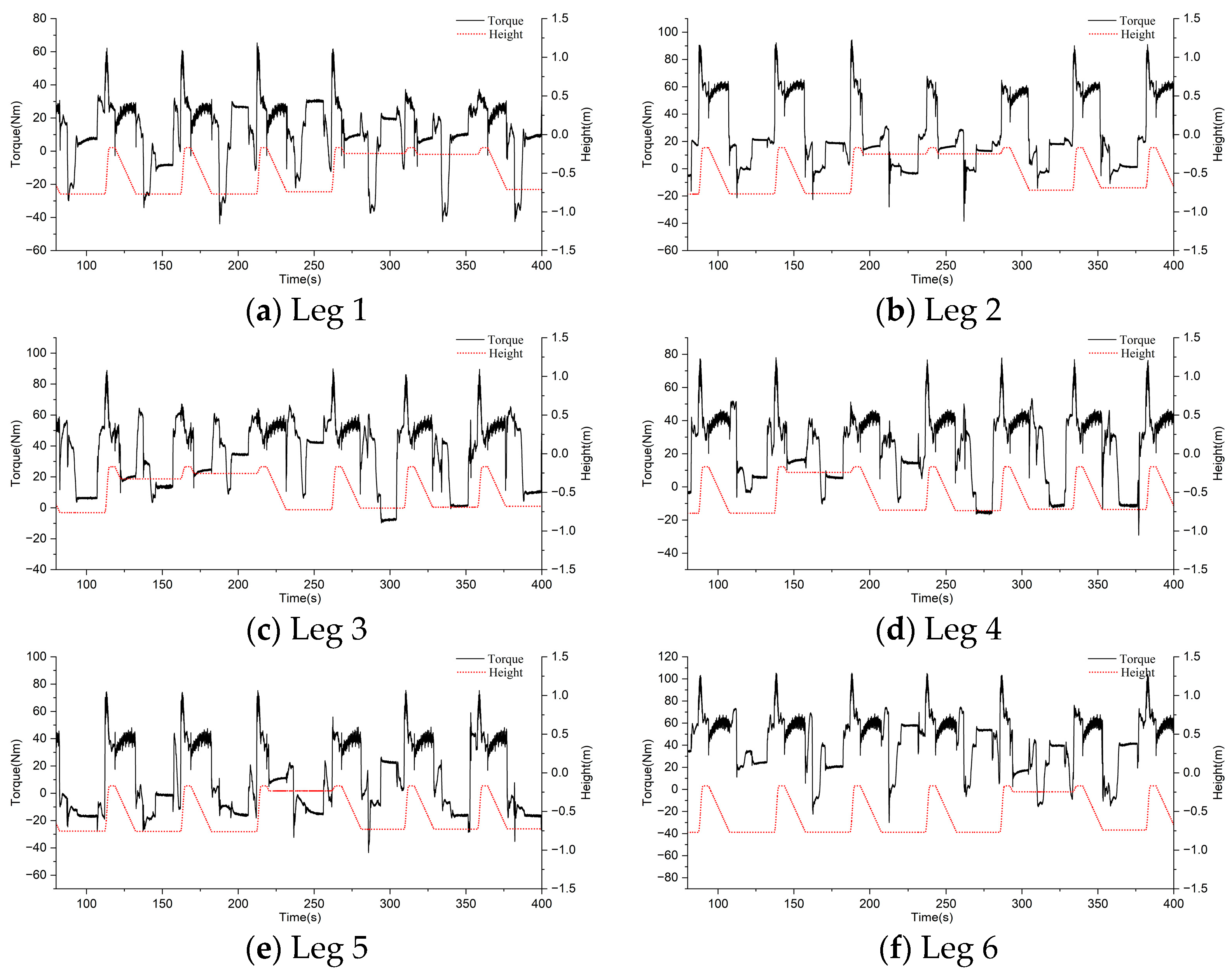 - Single-leg ground contact experiments were conducted to obtain joint motor torque variation curves. The drive motor torque of the hip joint exhibited significant fluctuations (far exceeding the stable values during the swing phase) at the instant of foot-contact. This torque surge characteristic serves as the core basis for ground contact determination, demonstrating consistent and stable detection response, thereby preliminarily validating the method’s feasibility.