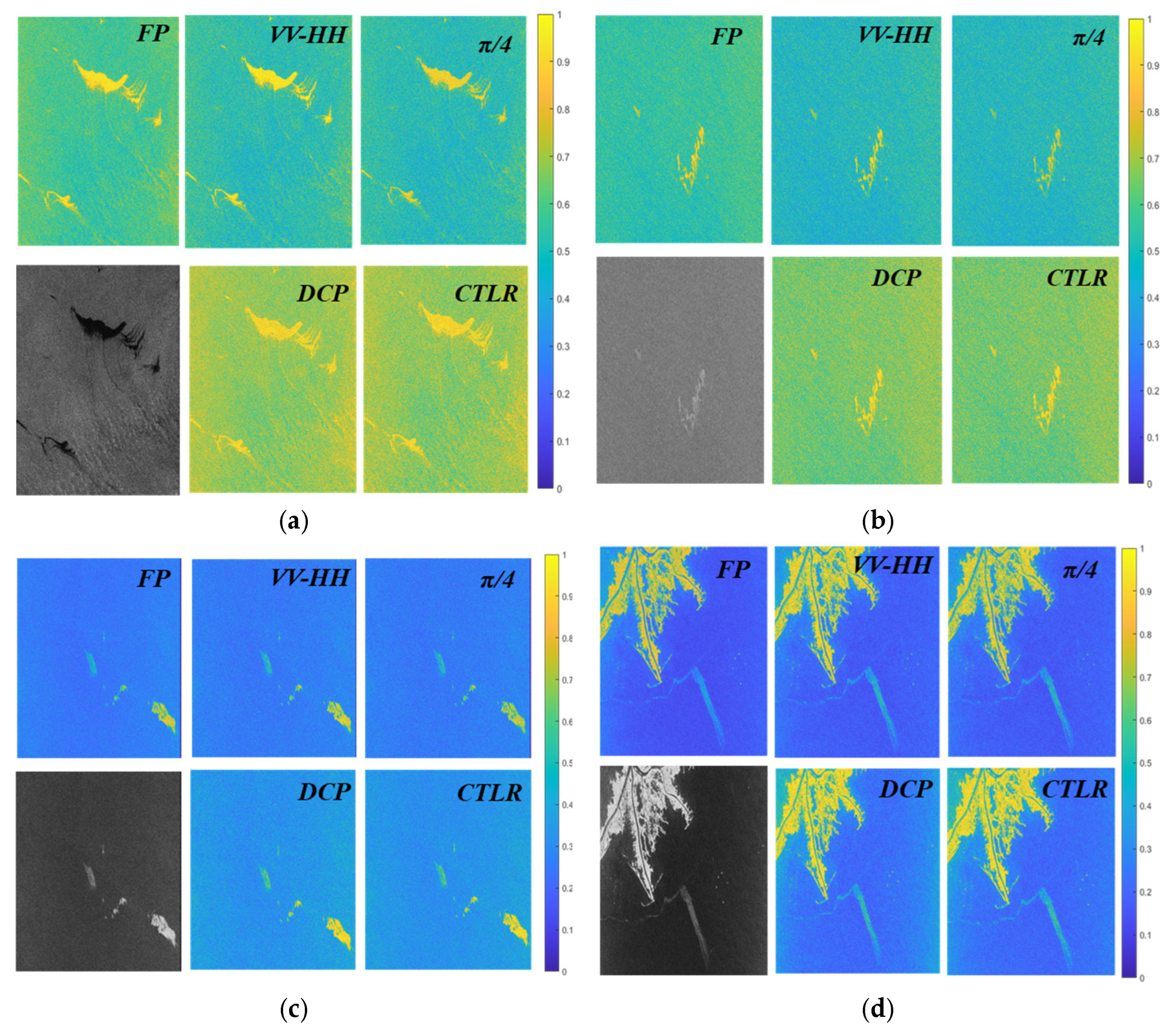 4.3. Oil Spill Identification Capability of Typical Polarimetric Features Under DP/CP and FP Modes