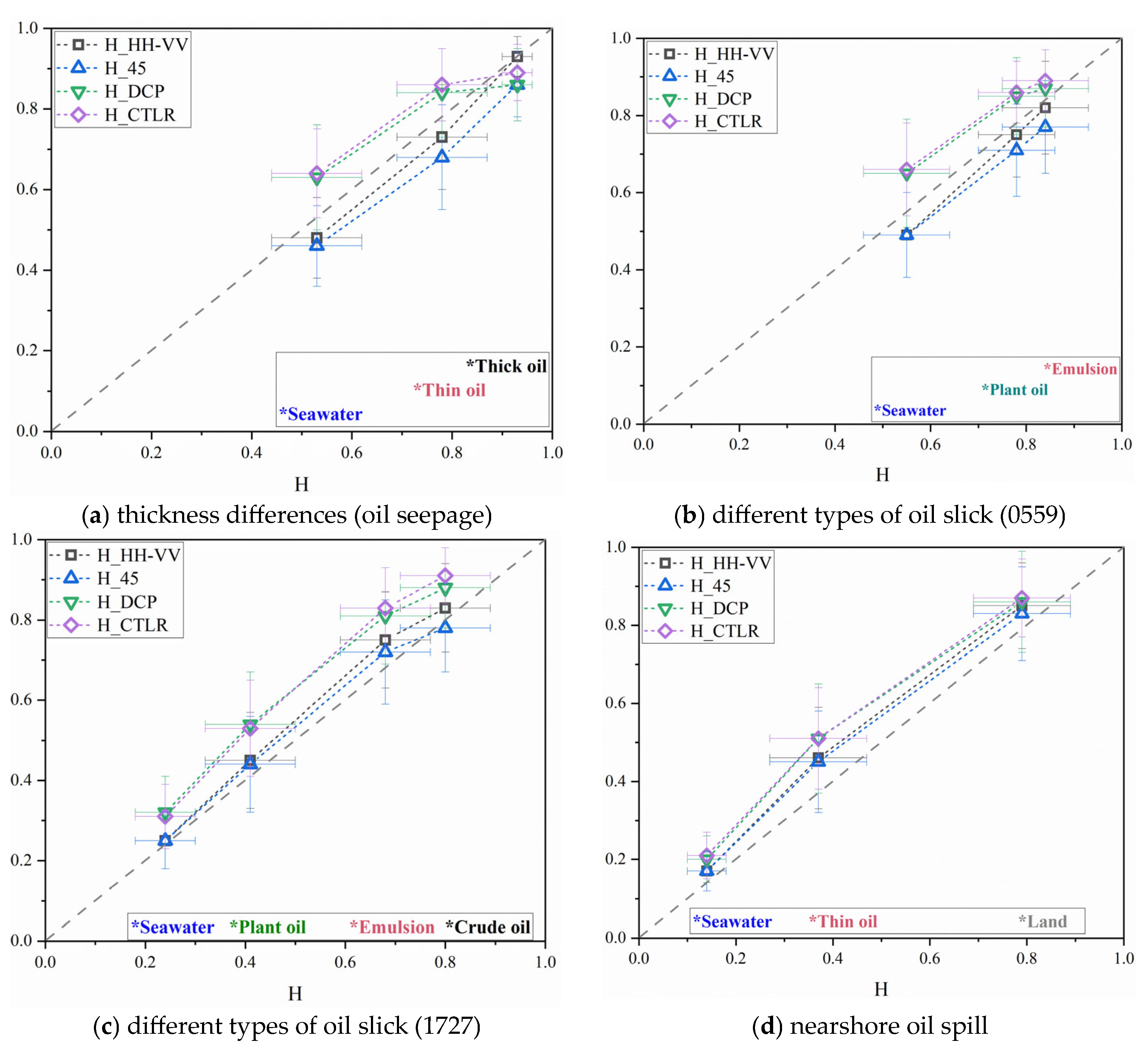 2.2. Oil Spill Scenario 2: Different Types of Oil Slick (Large Incidence Angle)