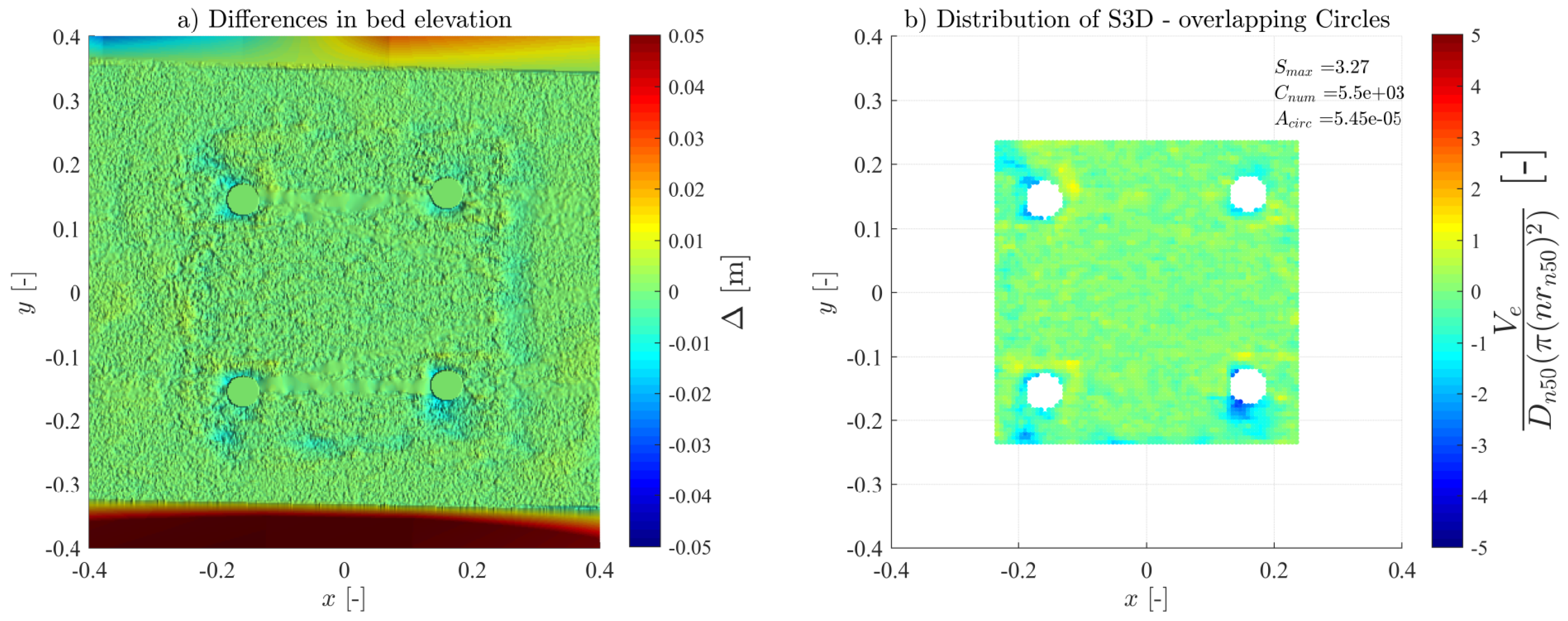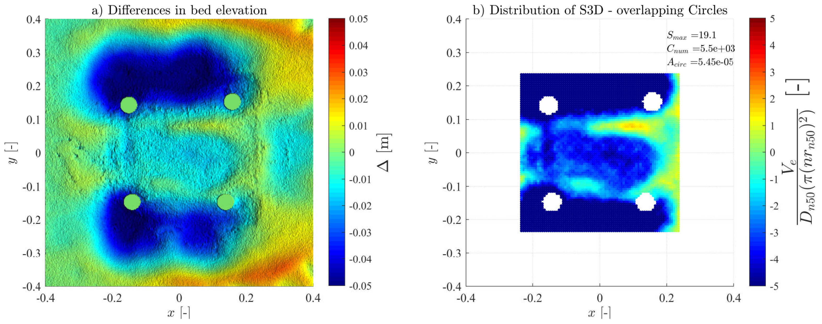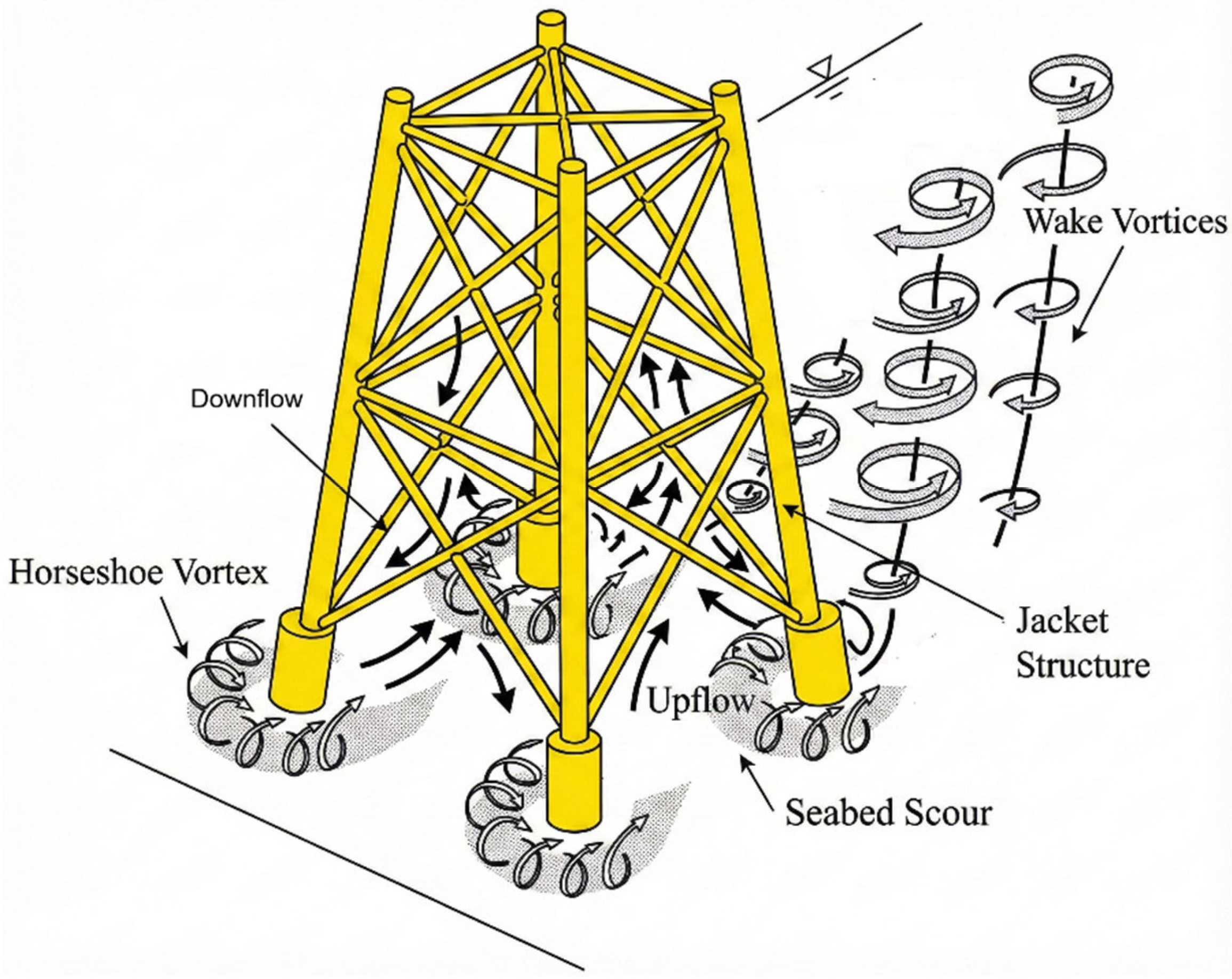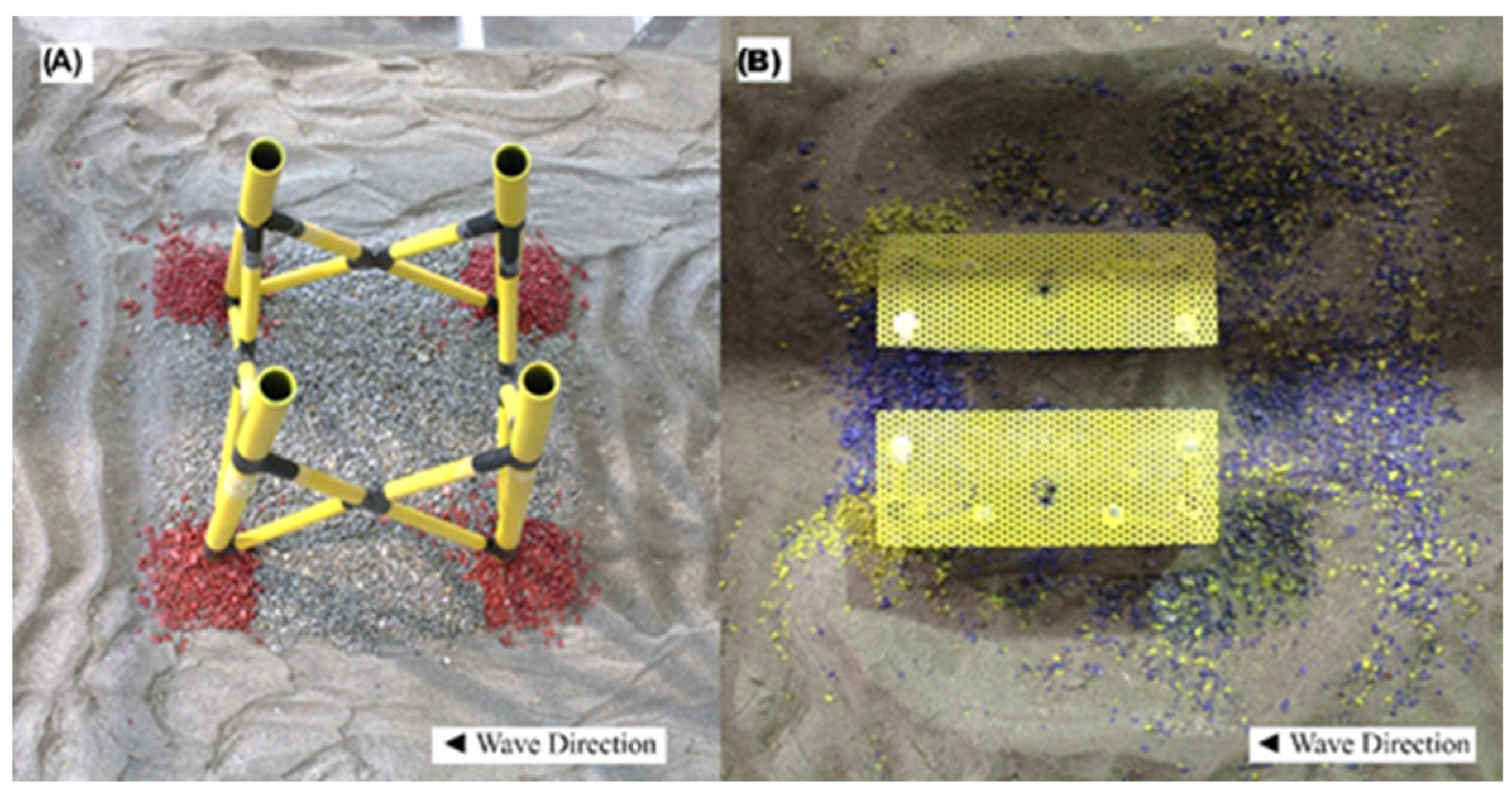 - Performs one of the first physical model tests on protected hybrid jackets, by coupling an OSWEC to the foundation, comparing them to the jacket results to highlight disparities, to demonstrate how the OSWEC paddle’s oscillatory motion can modify the governing mechanisms of scour, influence turbulence, hydrodynamics, and be a key driver of armour-layer damage.