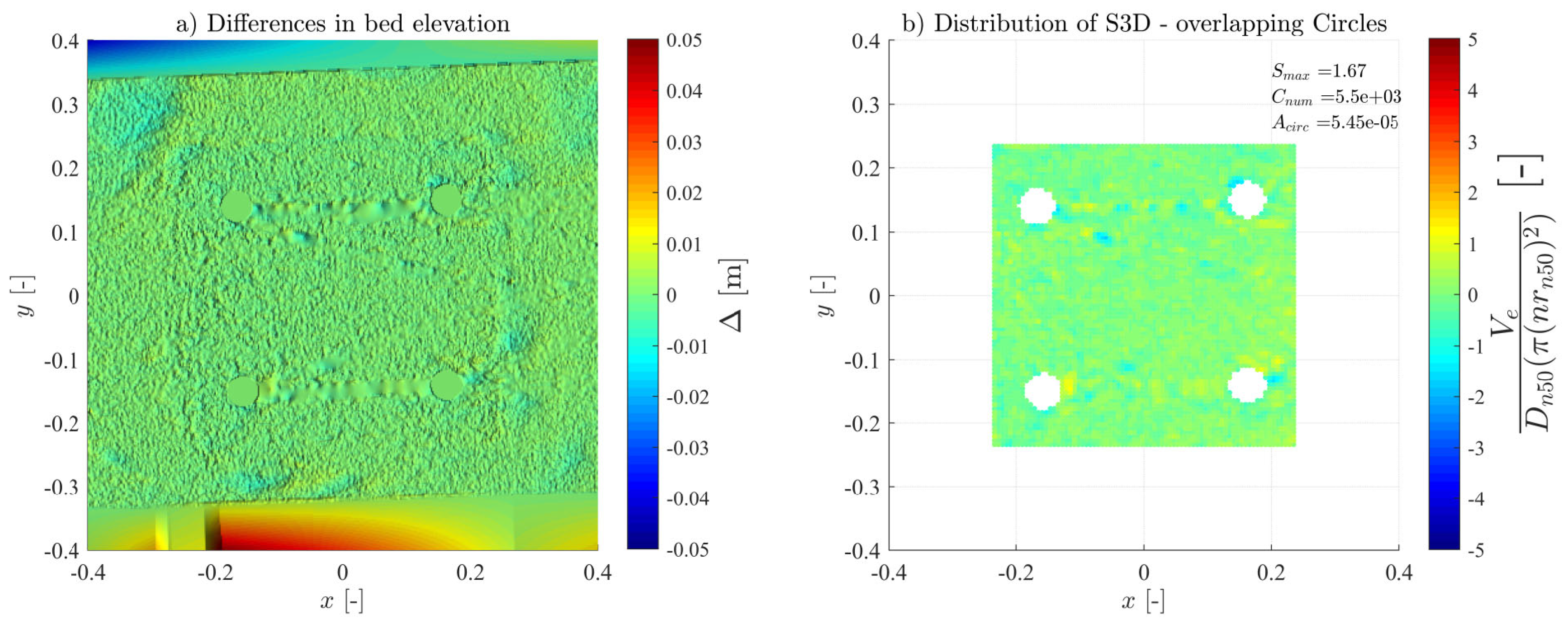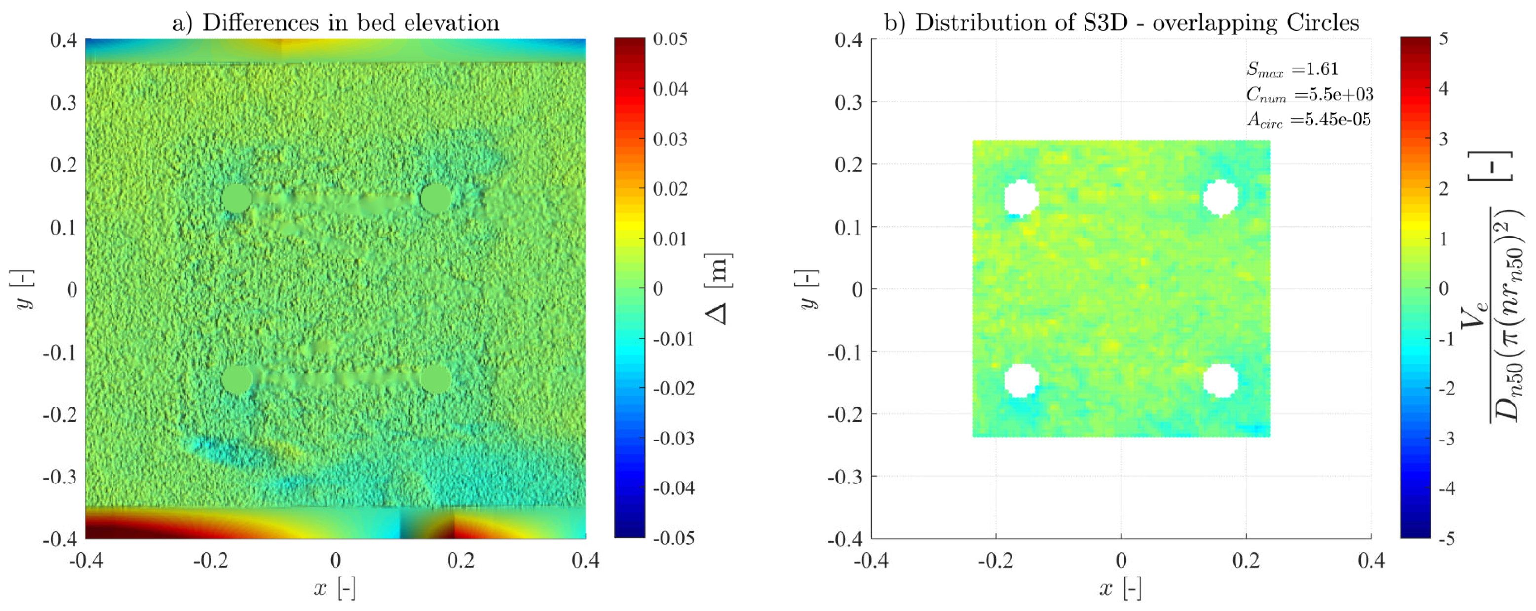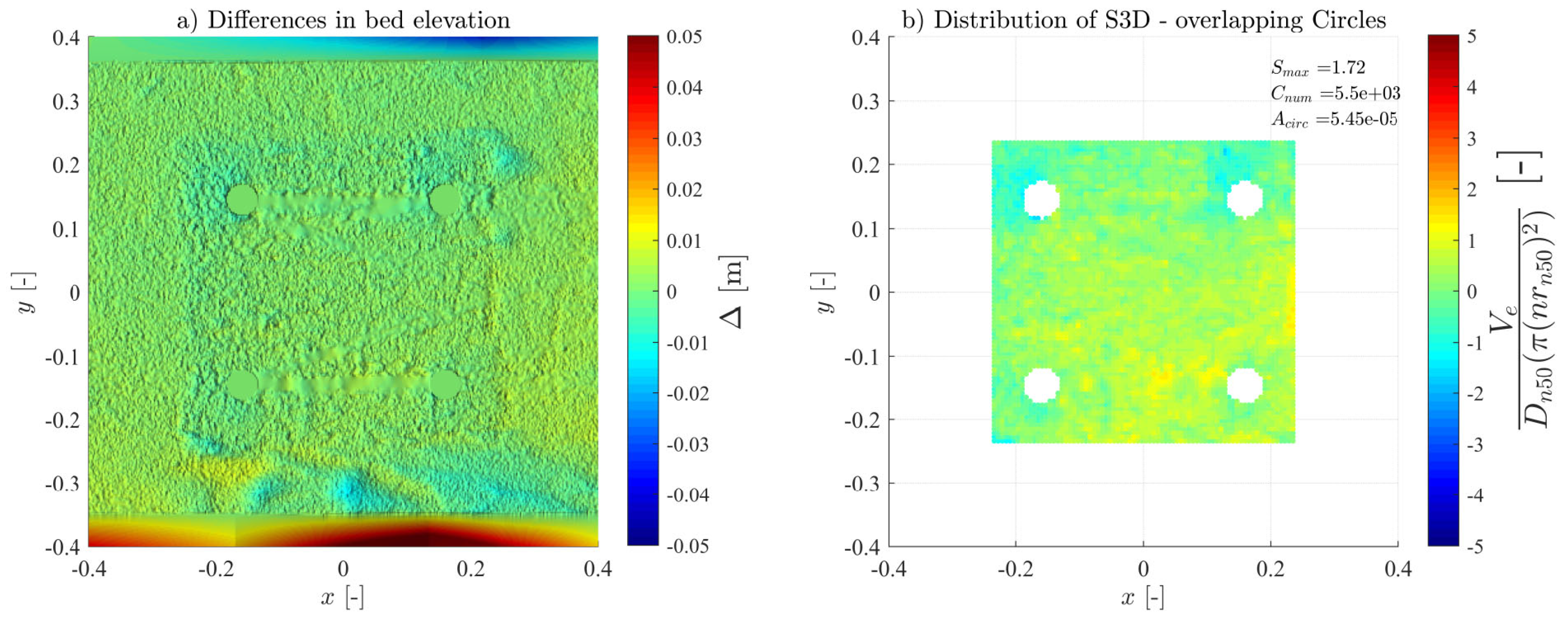 - Scale effects: the use of the Froude similitude with a 1:50 geometric scale inevitably introduces some scale effects regarding viscous forces and sediment size. While the Re number was maintained in a range to restrain vortex shedding discrepancies, as suggested by [35], the scaling of granular bed material may not perfectly replicate prototype sediment transport regimes.