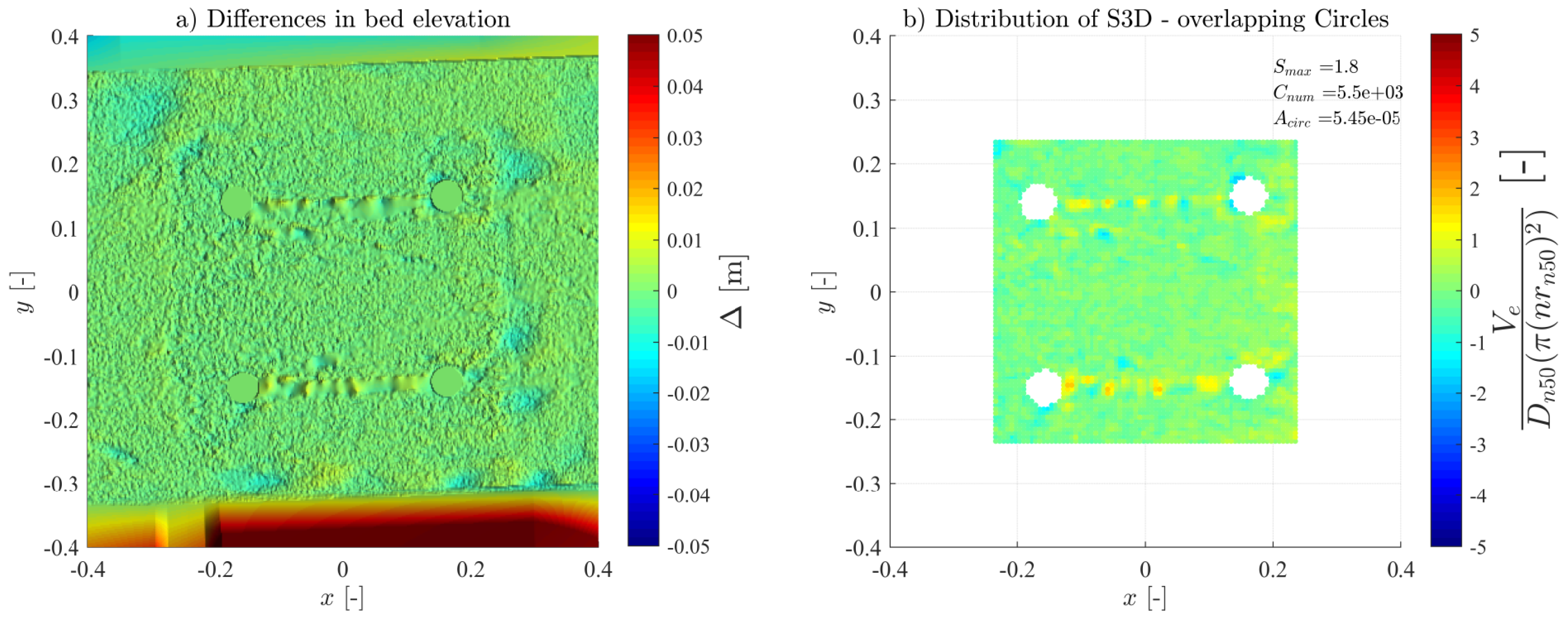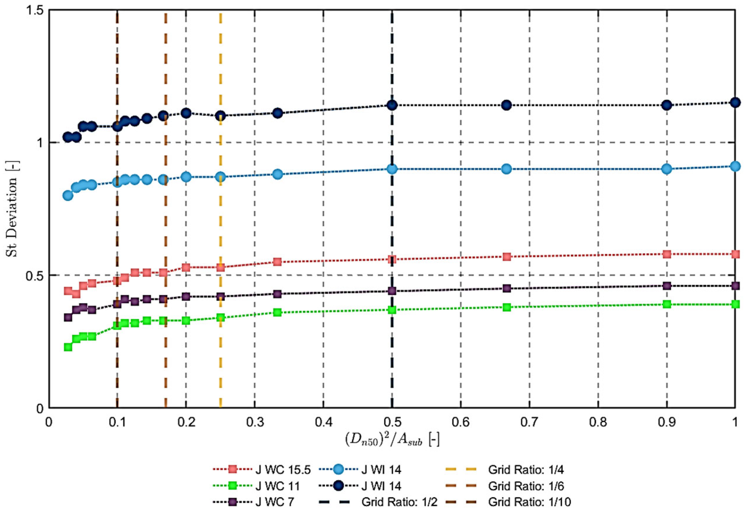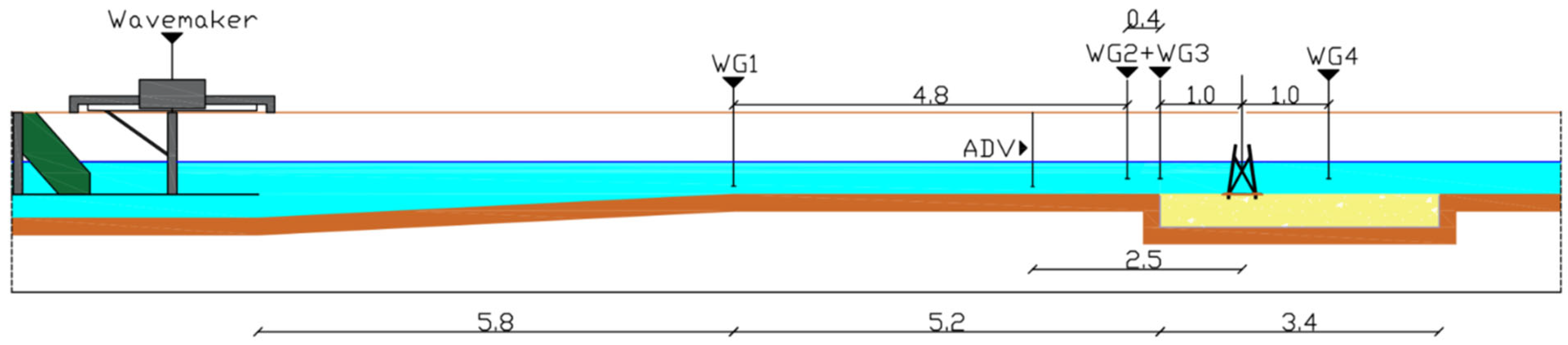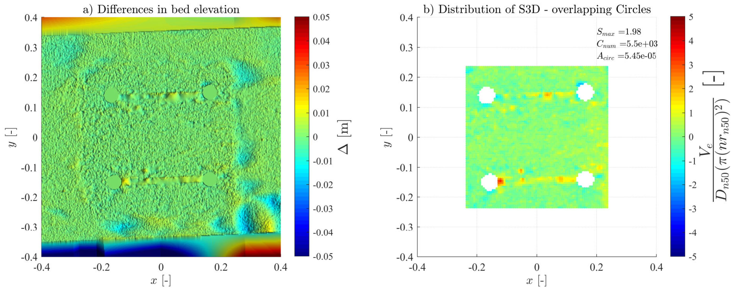 - Scale effects: the use of the Froude similitude with a 1:50 geometric scale inevitably introduces some scale effects regarding viscous forces and sediment size. While the Re number was maintained in a range to restrain vortex shedding discrepancies, as suggested by [35], the scaling of granular bed material may not perfectly replicate prototype sediment transport regimes.