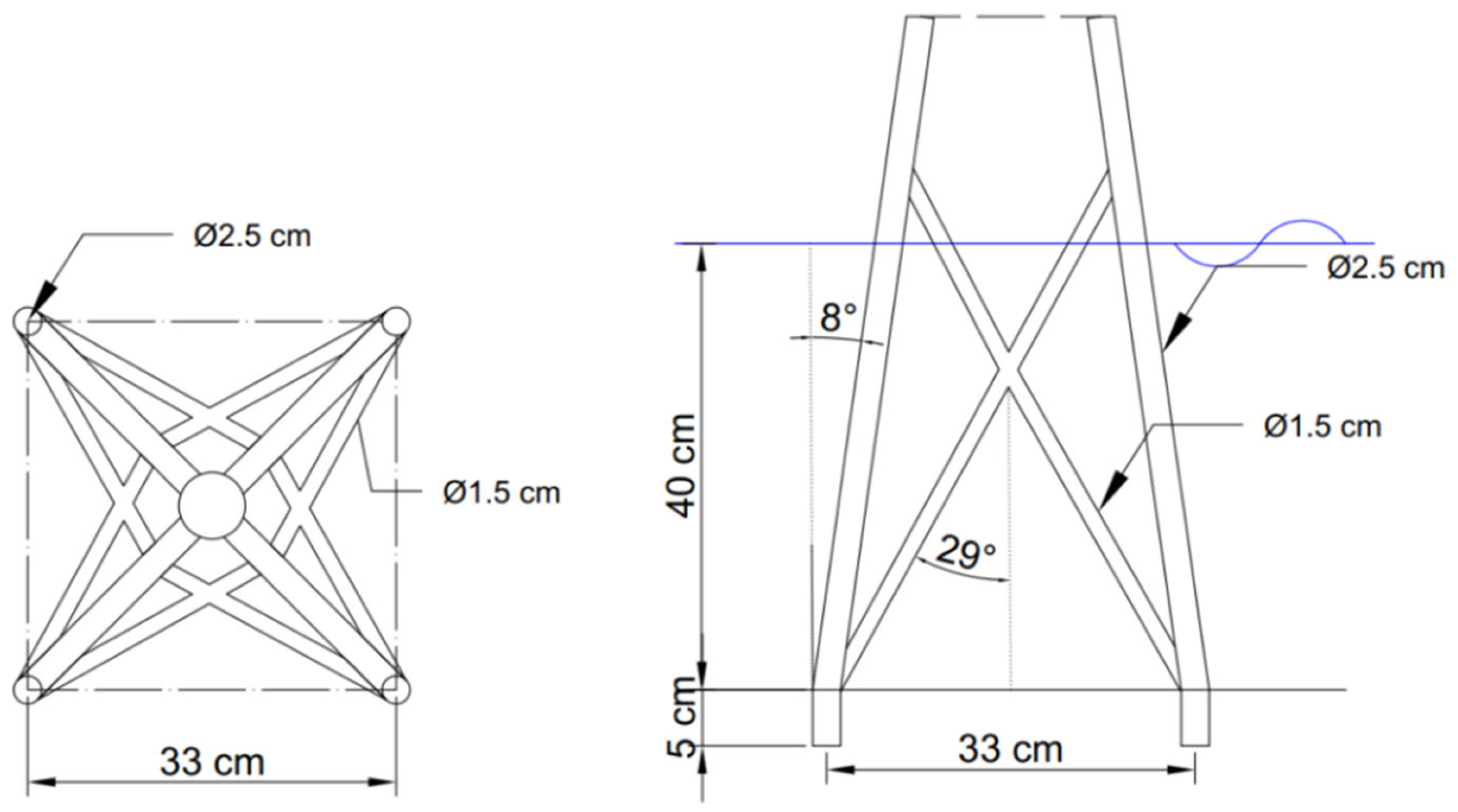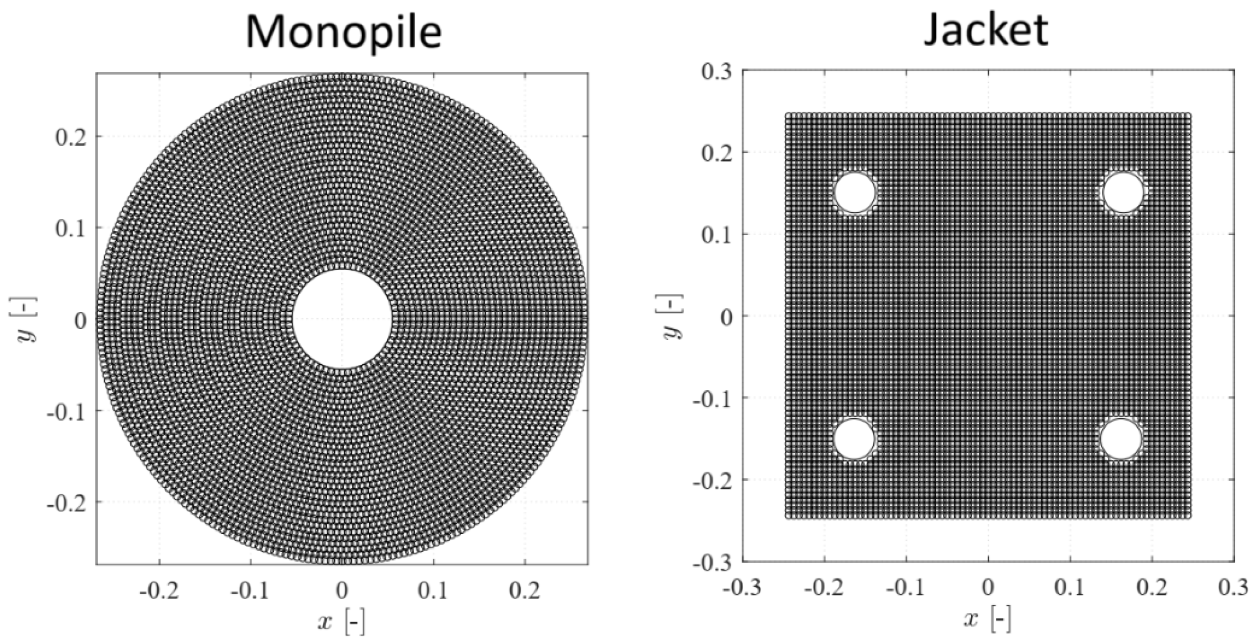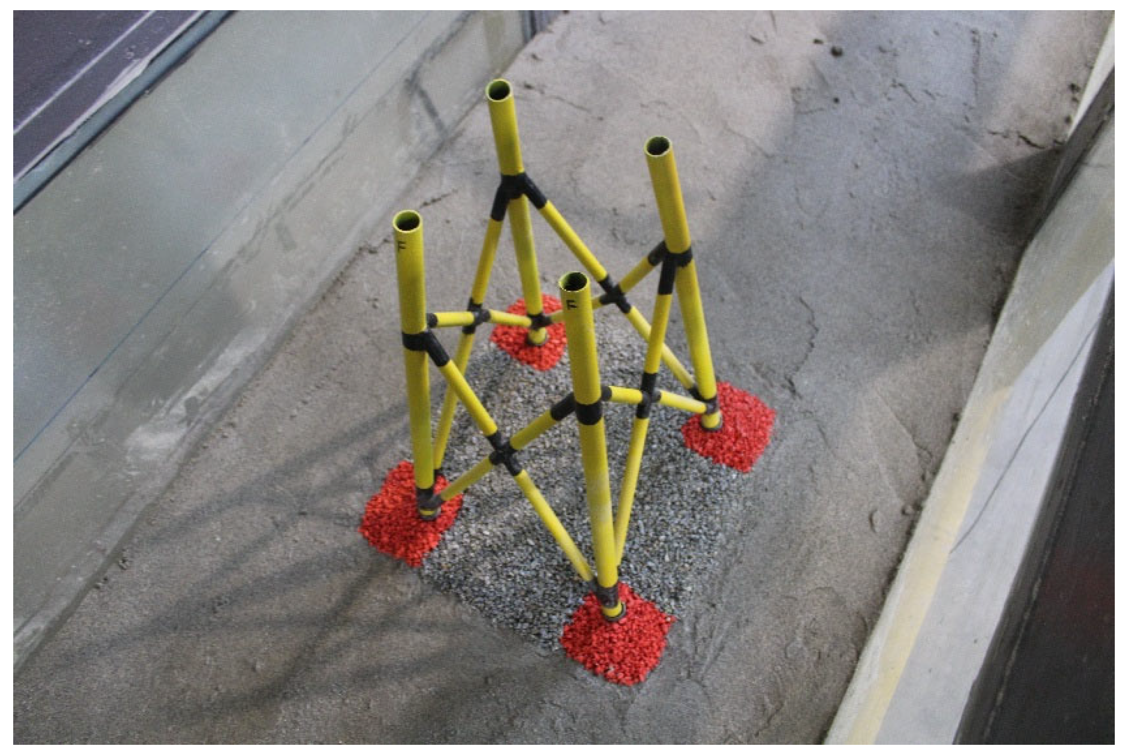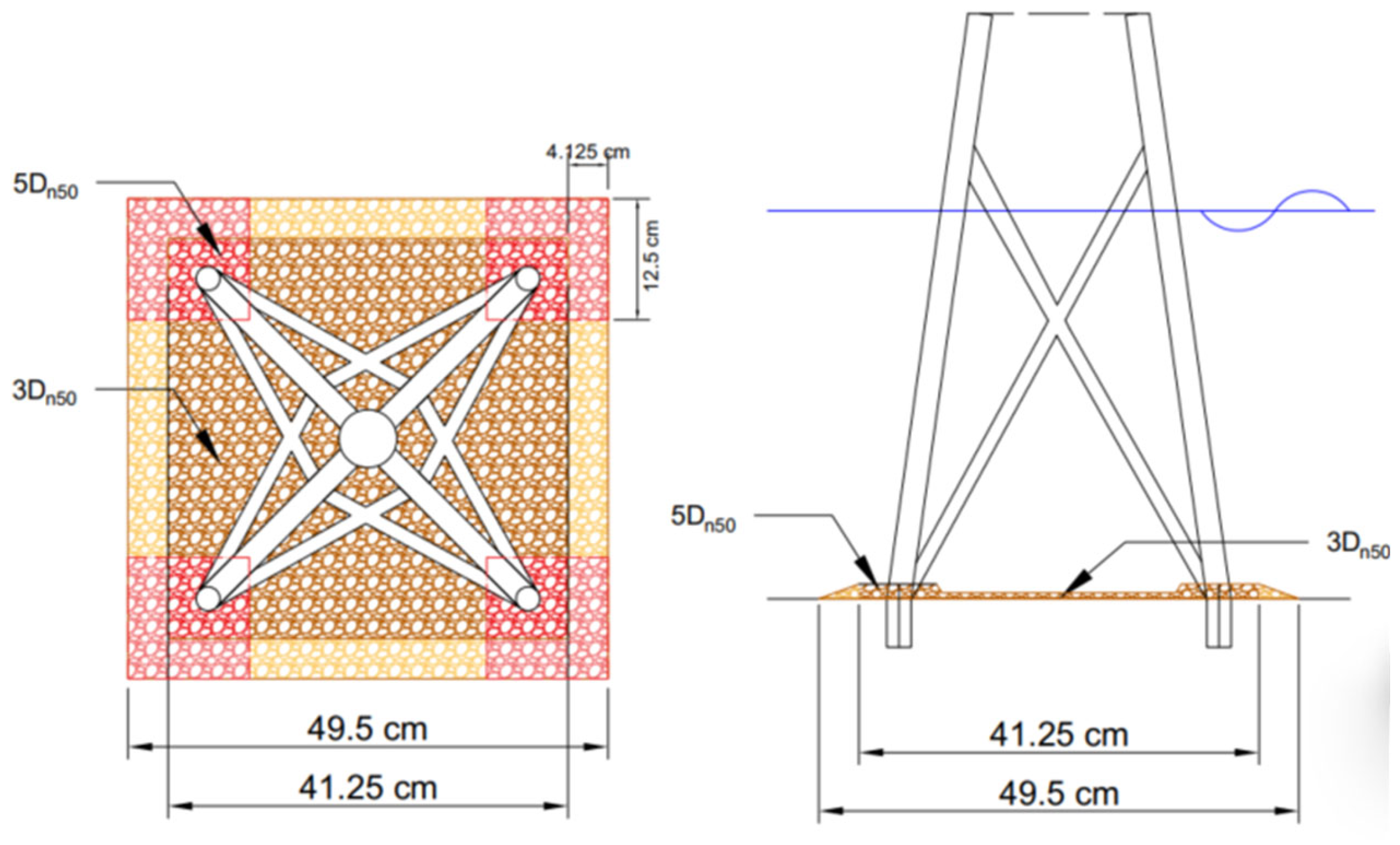 - It establishes a thorough experimental campaign that applies riprap scour protections designed according to recommendations found in the literature to the entire footprint area of a jacket foundation, to evaluate their performance and to compare the damage results with existing design criteria, developed for monopile foundations.