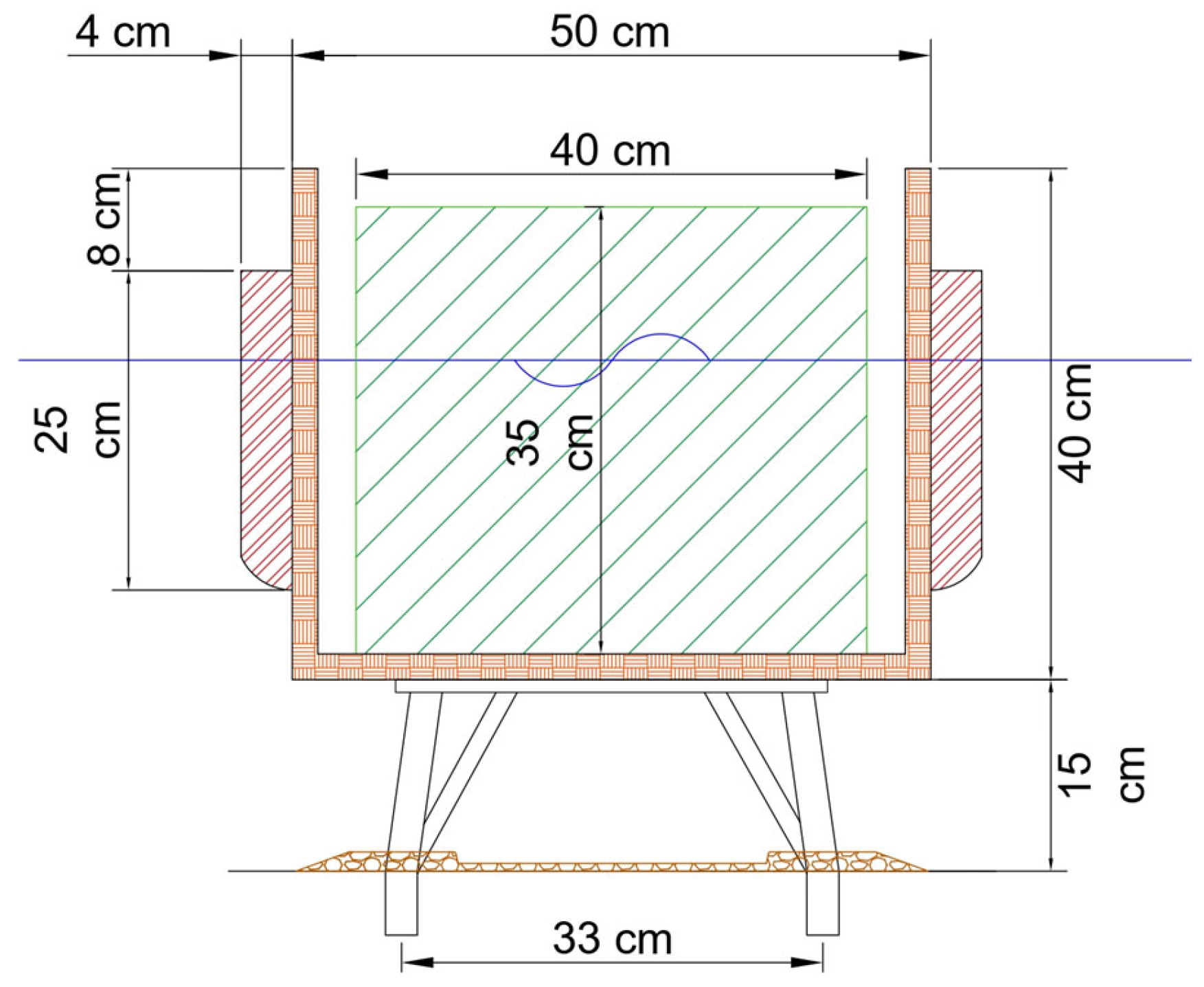 - OSWEC model: The WEC selected for the experimental study was modelled as a simplified oscillating paddle system. While macroscopically this reproduces the potential effects and influences of the device in enhancing flow and scour mechanisms, it does not fully capture the real effects of damping and control strategies of a full-scale device with a fully functional PTO system.