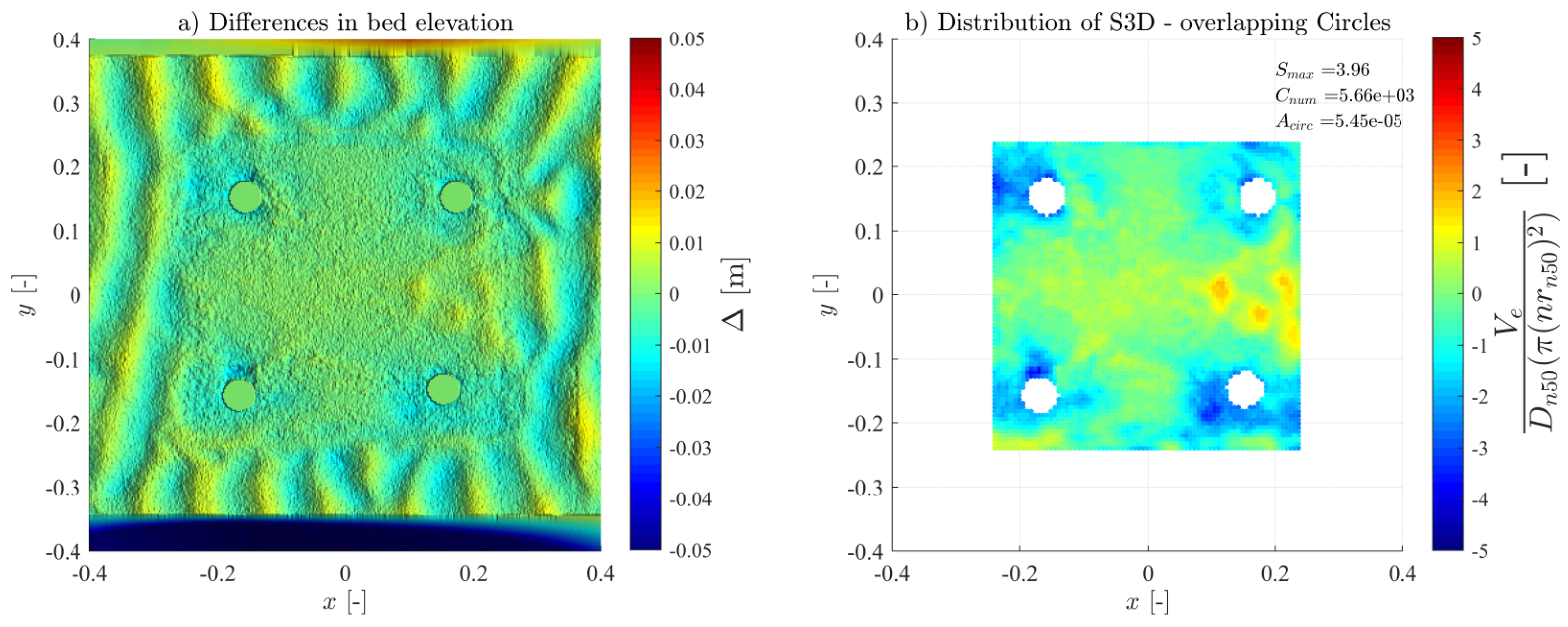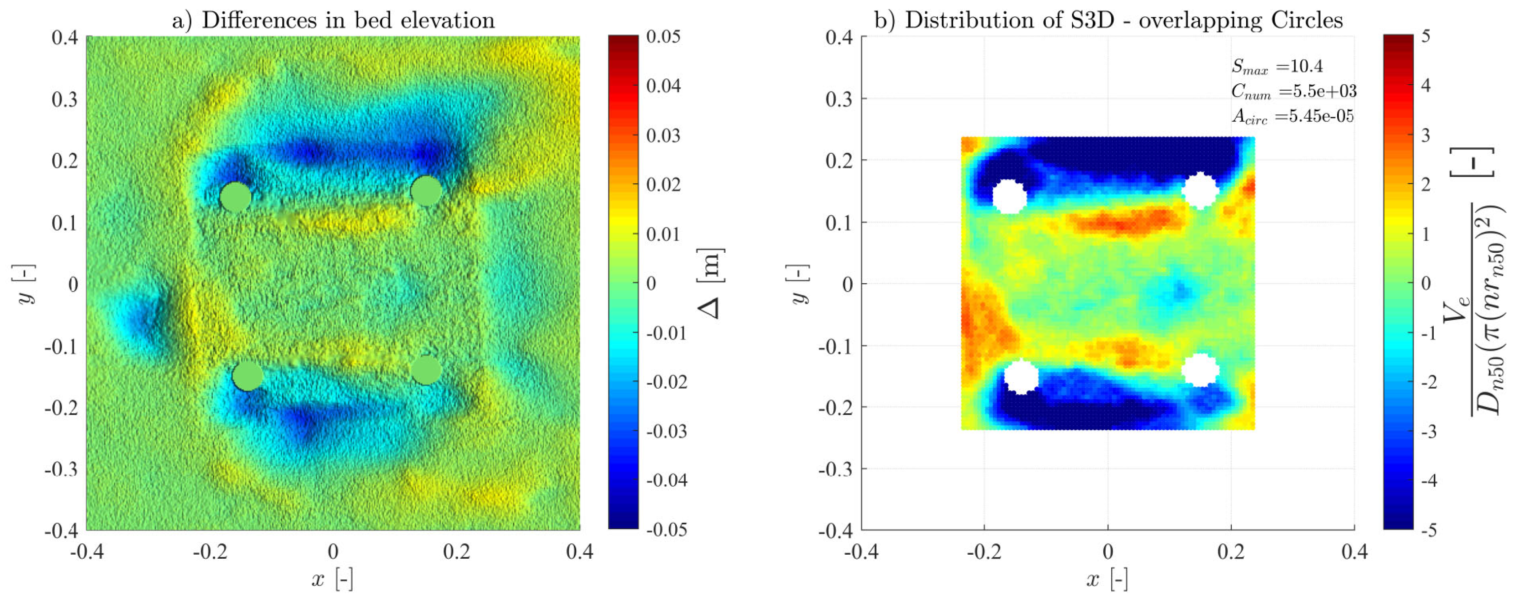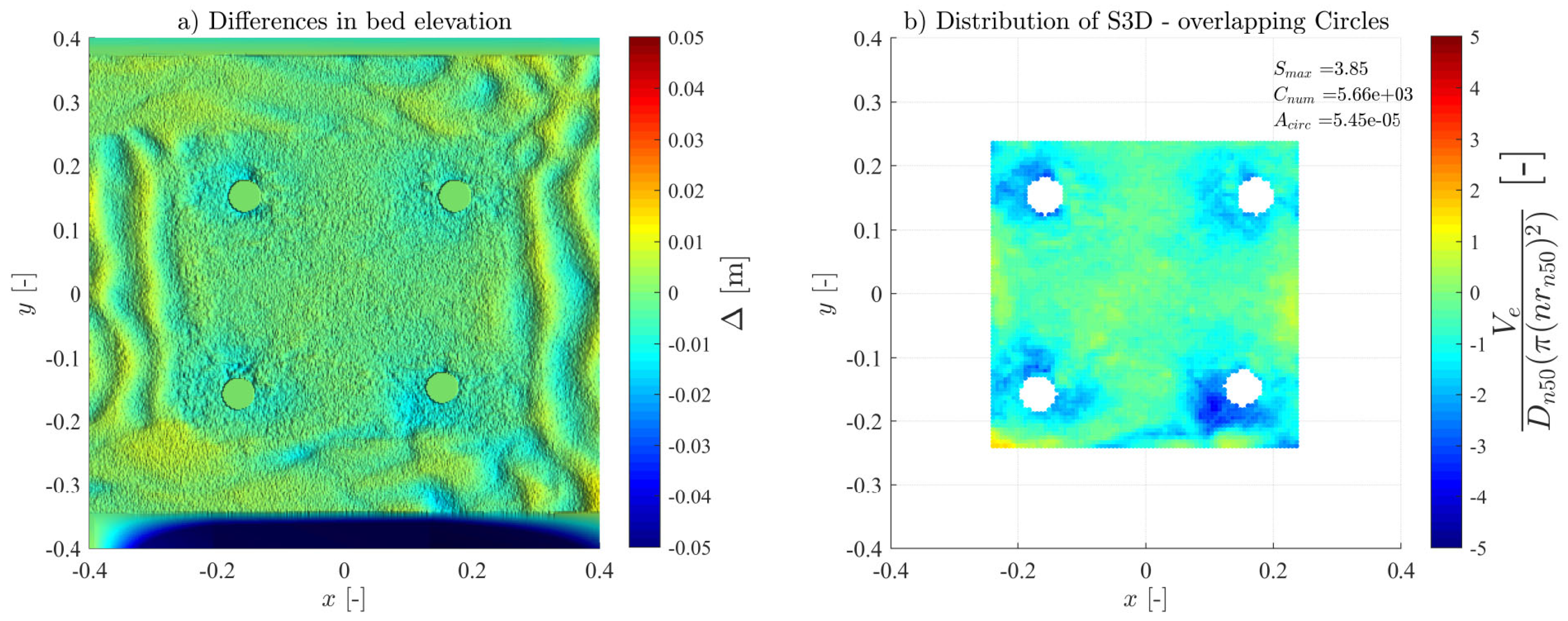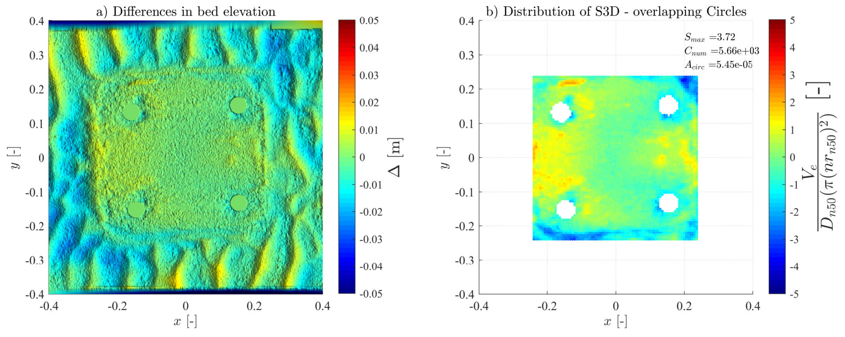 - Overlapping-circle 3D method implemented to a complex geometry foundation: the research successfully adapted and implemented the methodology developed by [34] to a jacket foundation, a structure with higher complexity when compared to a monopile, and to a square scour protection (different from the typical circular shape). The method demonstrated a high-resolution scour quantification capability through a highly accurate computation of S3D, thereby providing valuable insights into complex and hybrid configurations. Despite the sensitivity to the grid ratio, results suggest an ideal range between 1/8 and 1/4. However, low grid ratios present some difficulties in properly representing overlapping elements near the corners and around the piles in complex foundations/protections. Therefore, the 1/4 ratio remains the most reliable, consistent with the findings disclosed by [6,34];
