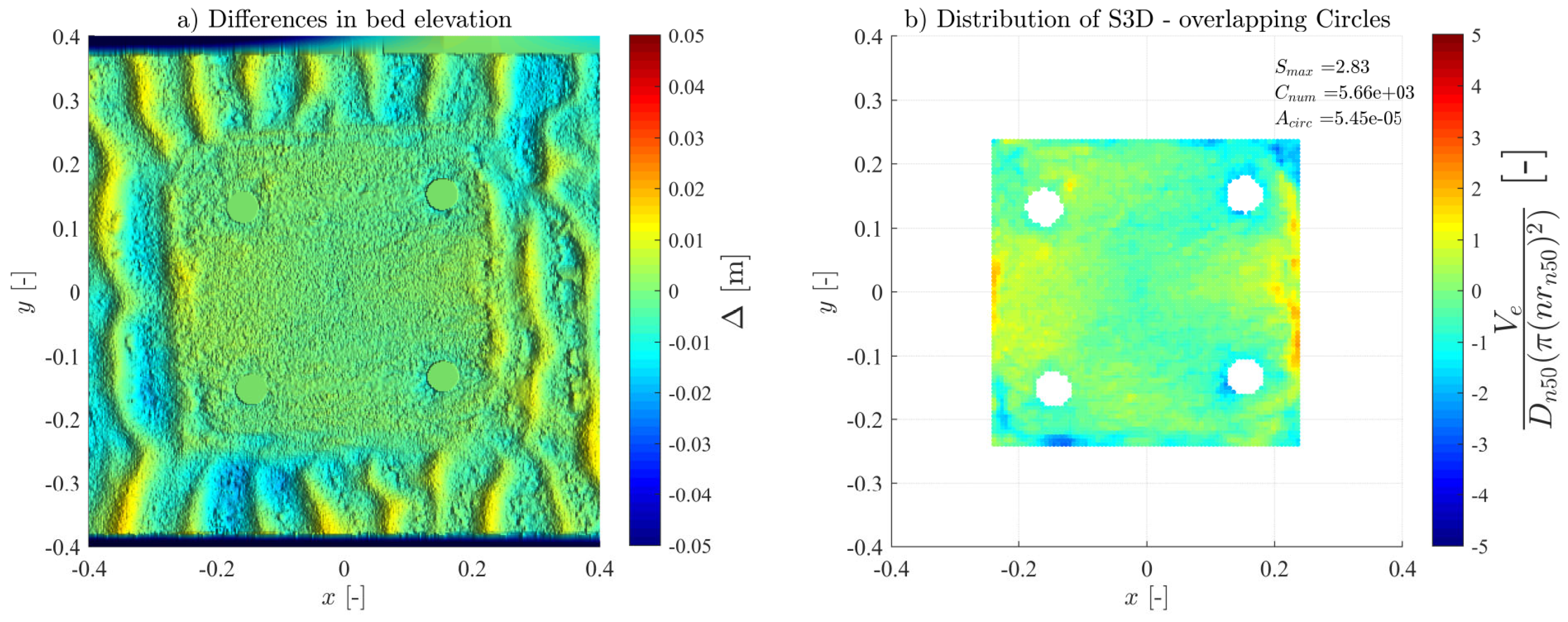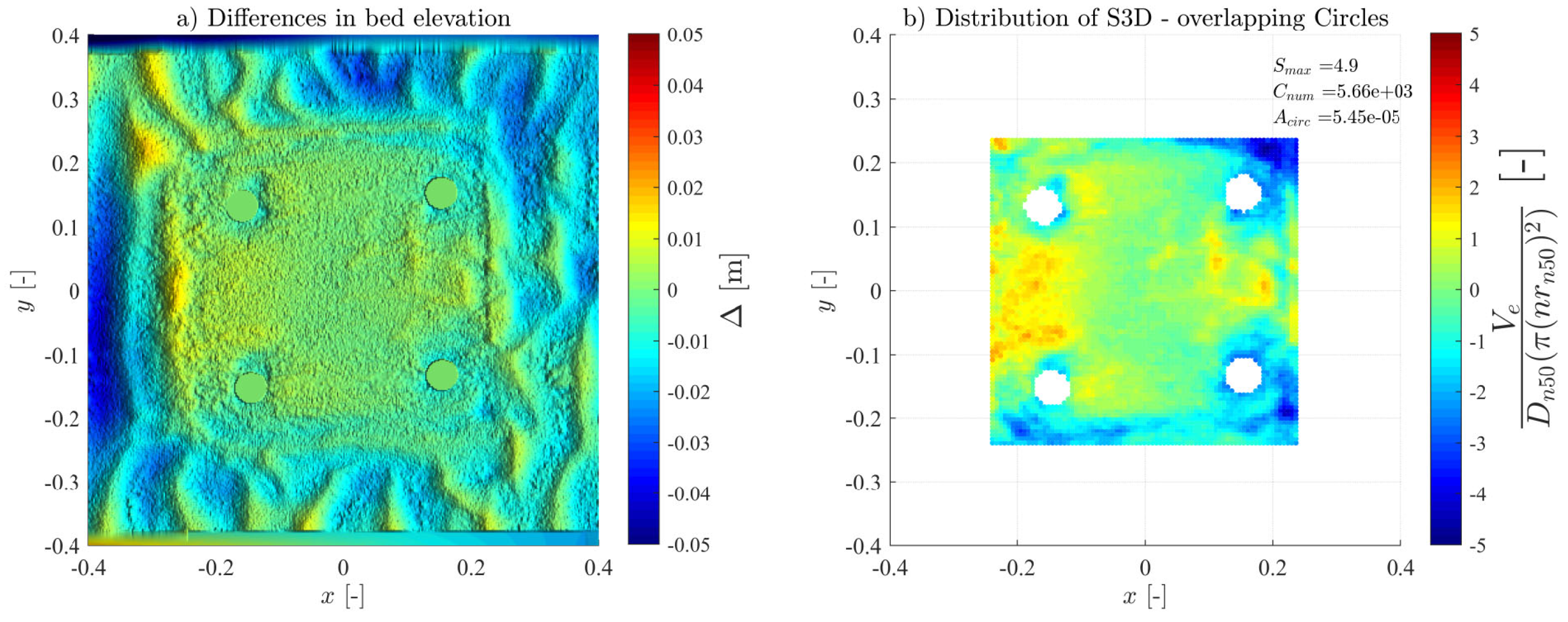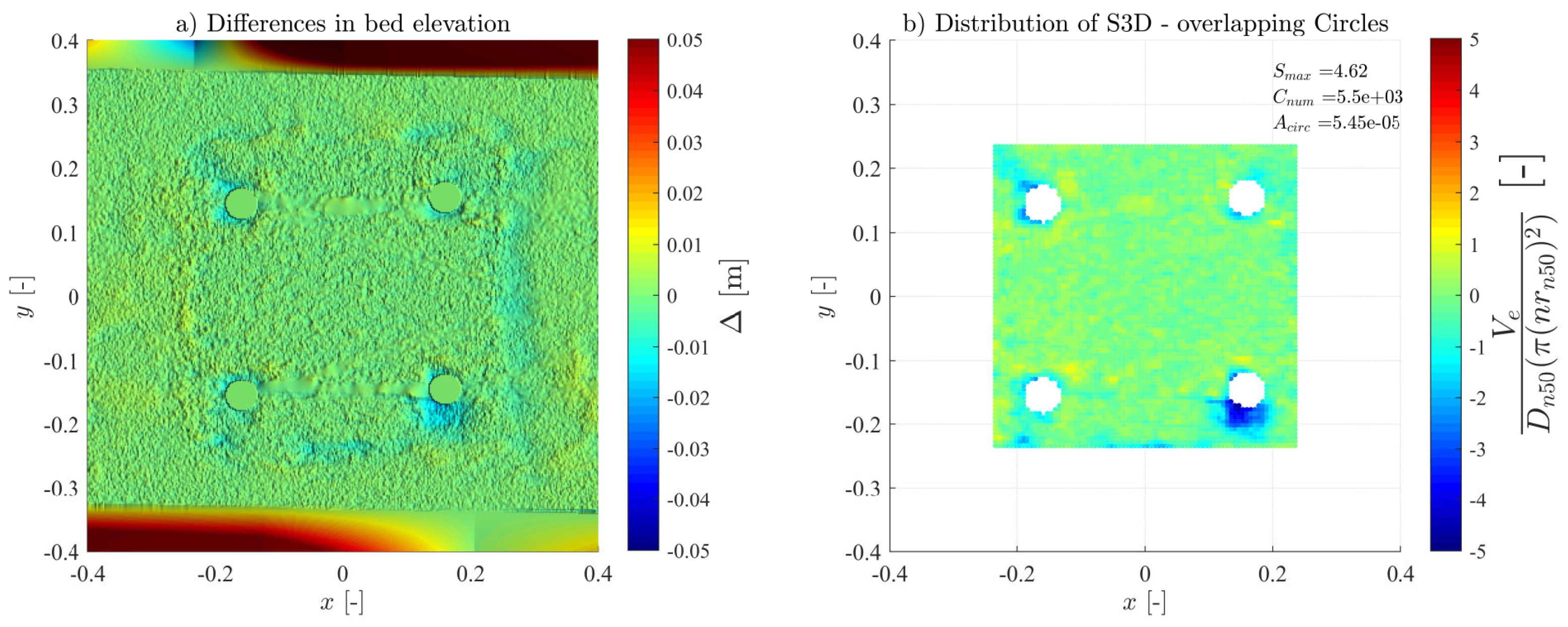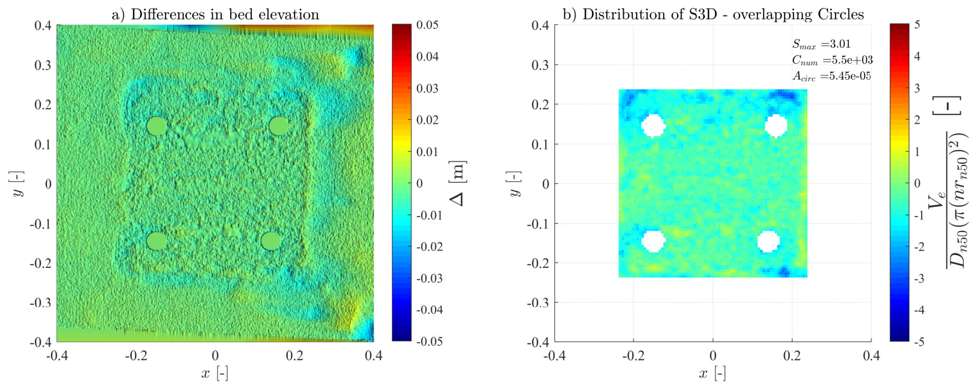 - Overlapping-circle 3D method implemented to a complex geometry foundation: the research successfully adapted and implemented the methodology developed by [34] to a jacket foundation, a structure with higher complexity when compared to a monopile, and to a square scour protection (different from the typical circular shape). The method demonstrated a high-resolution scour quantification capability through a highly accurate computation of S3D, thereby providing valuable insights into complex and hybrid configurations. Despite the sensitivity to the grid ratio, results suggest an ideal range between 1/8 and 1/4. However, low grid ratios present some difficulties in properly representing overlapping elements near the corners and around the piles in complex foundations/protections. Therefore, the 1/4 ratio remains the most reliable, consistent with the findings disclosed by [6,34];