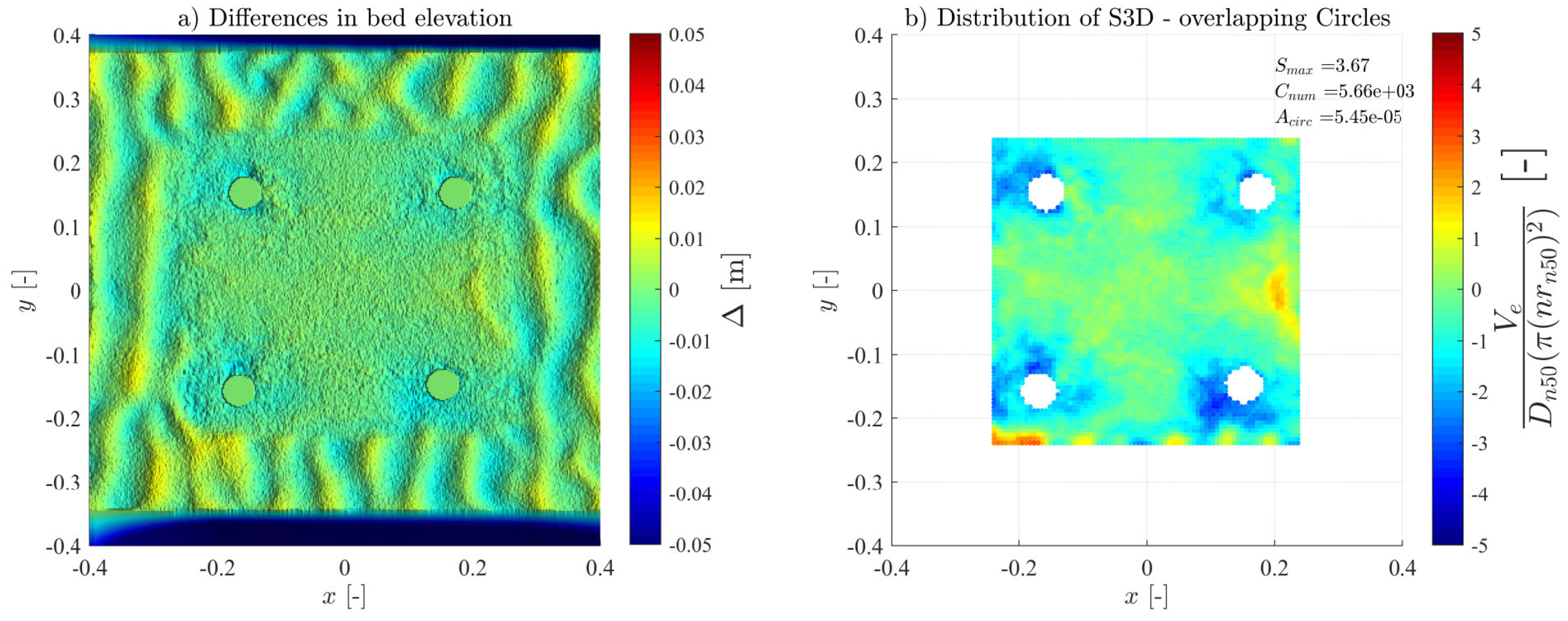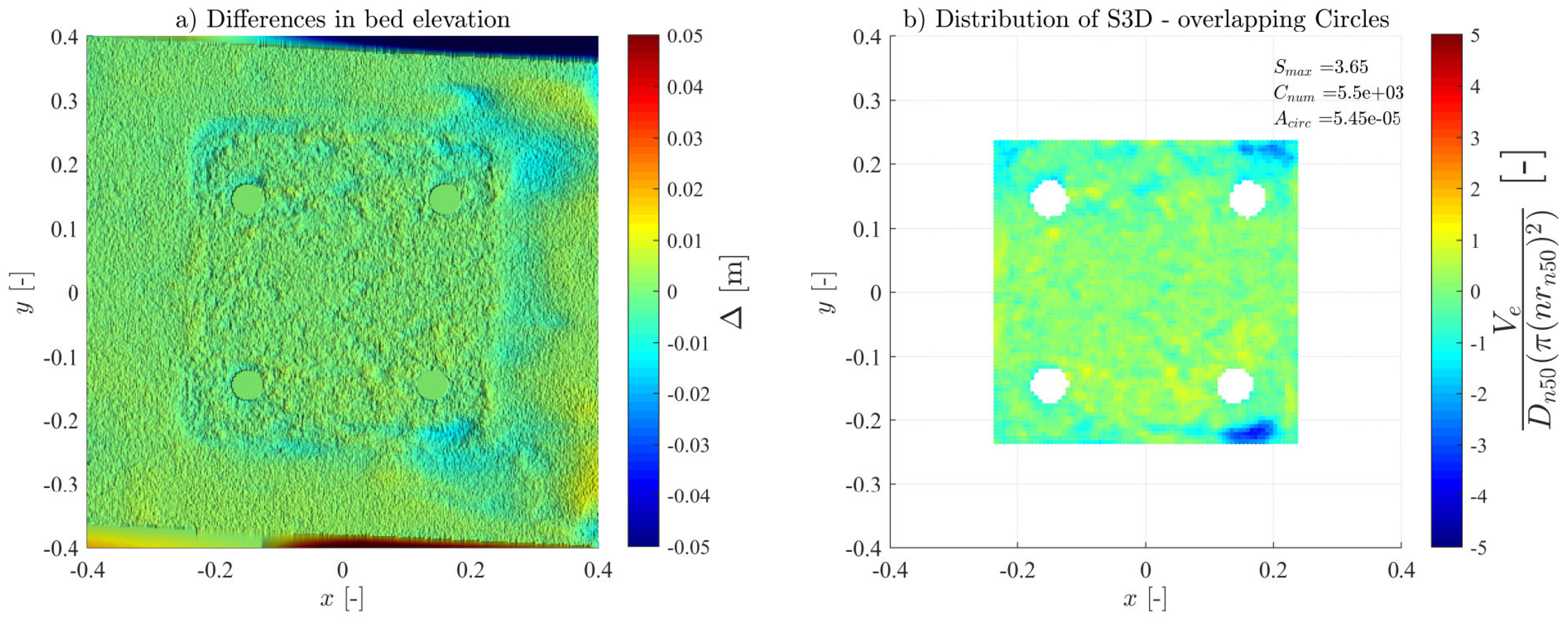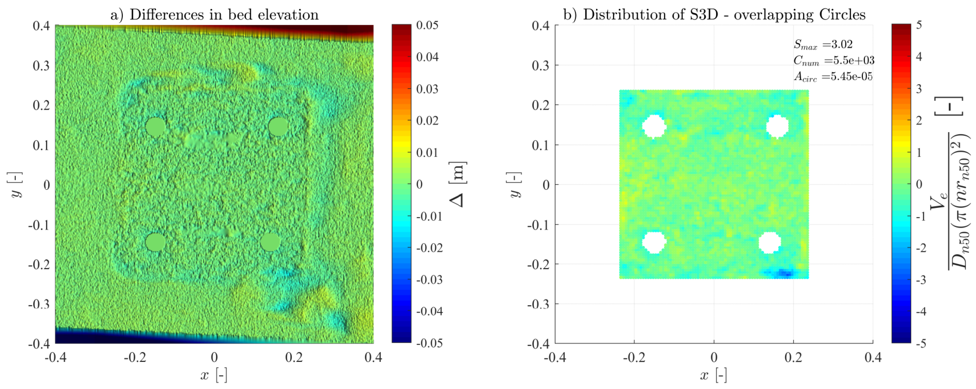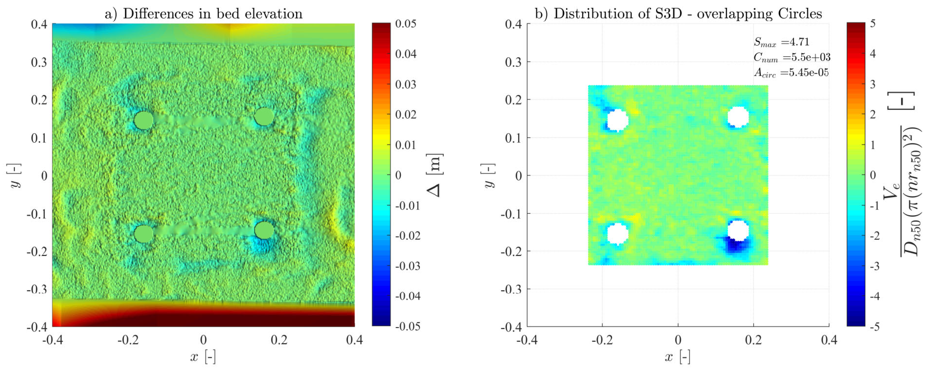 - Overlapping-circle 3D method implemented to a complex geometry foundation: the research successfully adapted and implemented the methodology developed by [34] to a jacket foundation, a structure with higher complexity when compared to a monopile, and to a square scour protection (different from the typical circular shape). The method demonstrated a high-resolution scour quantification capability through a highly accurate computation of S3D, thereby providing valuable insights into complex and hybrid configurations. Despite the sensitivity to the grid ratio, results suggest an ideal range between 1/8 and 1/4. However, low grid ratios present some difficulties in properly representing overlapping elements near the corners and around the piles in complex foundations/protections. Therefore, the 1/4 ratio remains the most reliable, consistent with the findings disclosed by [6,34];