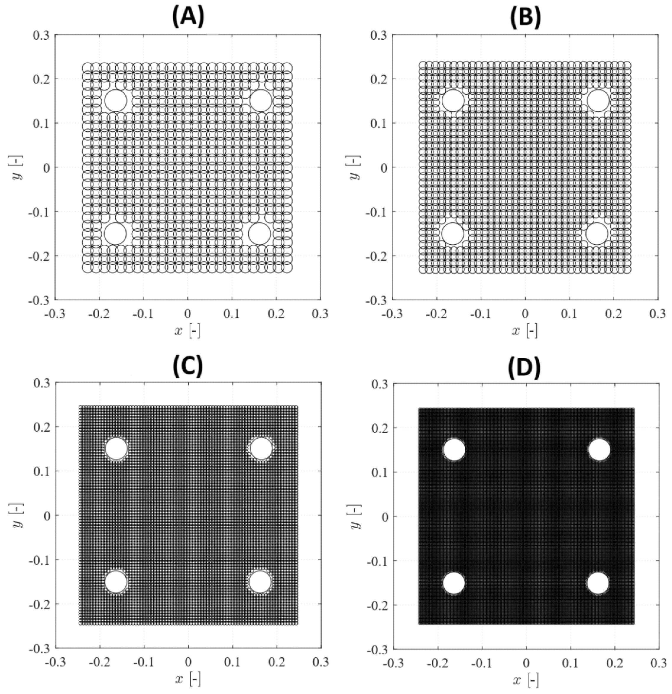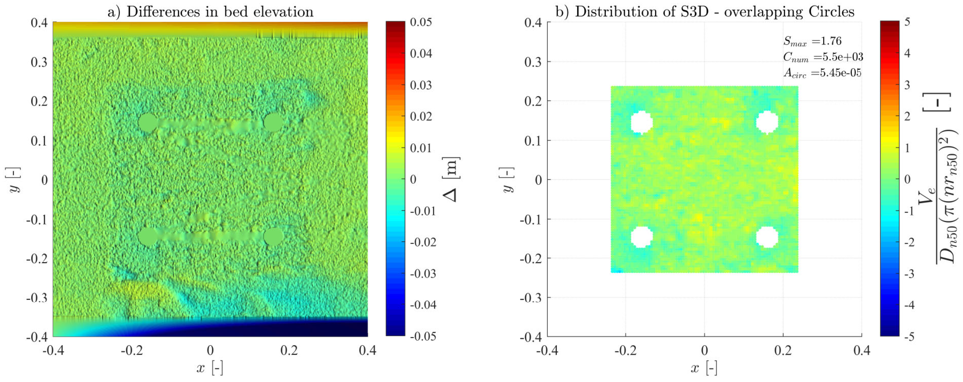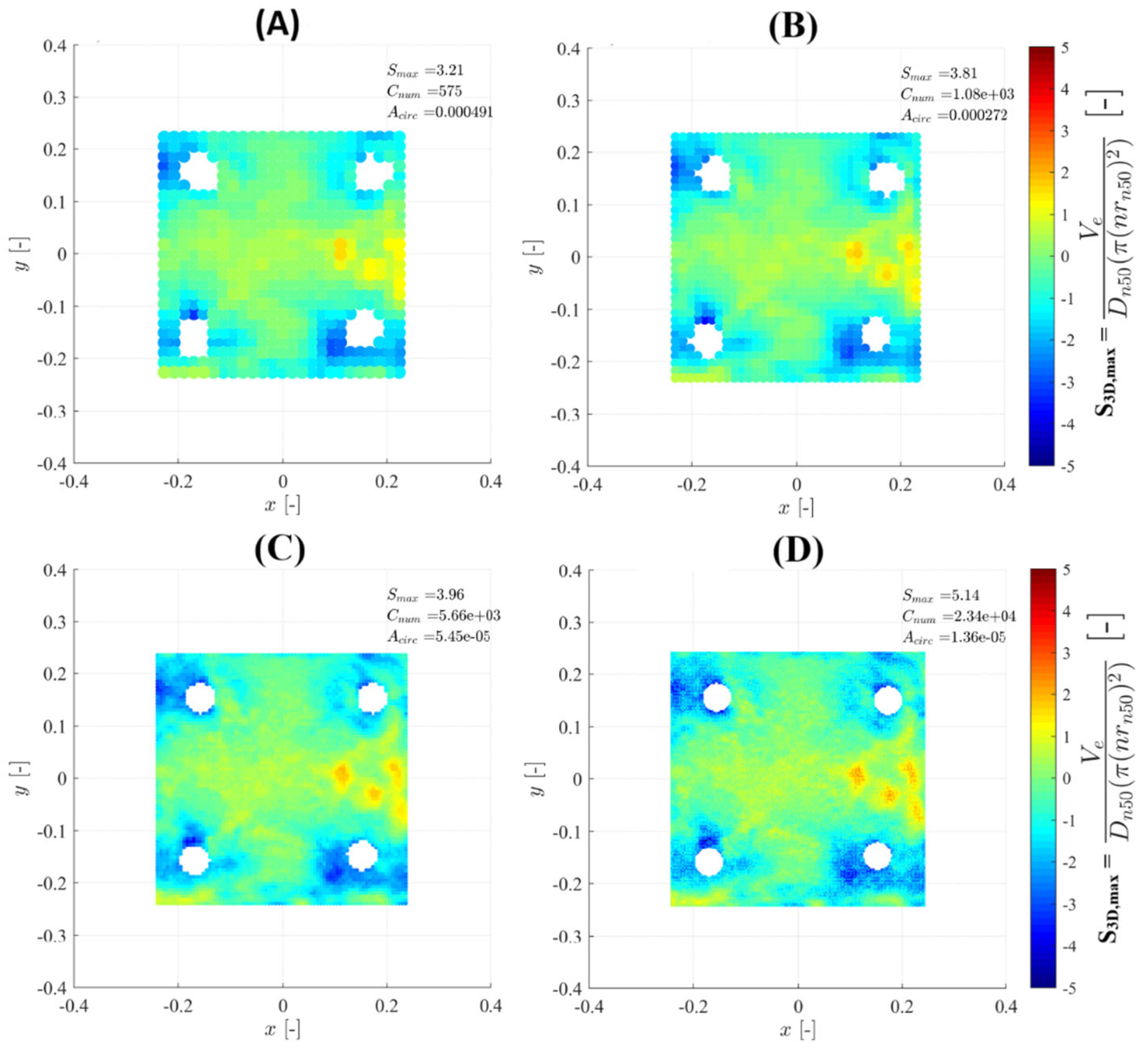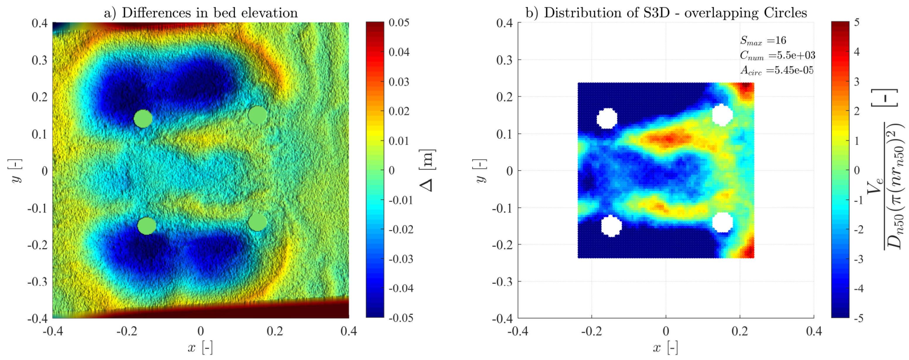 - Overlapping-circle 3D method implemented to a complex geometry foundation: the research successfully adapted and implemented the methodology developed by [34] to a jacket foundation, a structure with higher complexity when compared to a monopile, and to a square scour protection (different from the typical circular shape). The method demonstrated a high-resolution scour quantification capability through a highly accurate computation of S3D, thereby providing valuable insights into complex and hybrid configurations. Despite the sensitivity to the grid ratio, results suggest an ideal range between 1/8 and 1/4. However, low grid ratios present some difficulties in properly representing overlapping elements near the corners and around the piles in complex foundations/protections. Therefore, the 1/4 ratio remains the most reliable, consistent with the findings disclosed by [6,34];