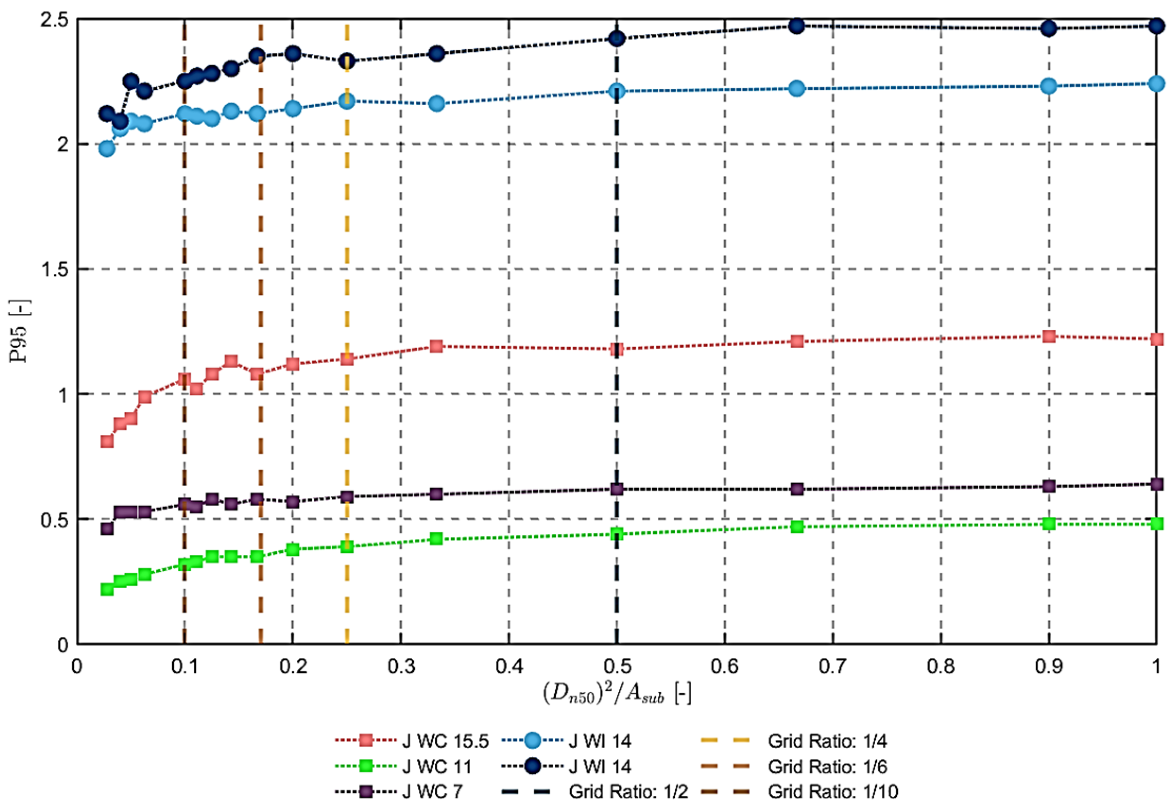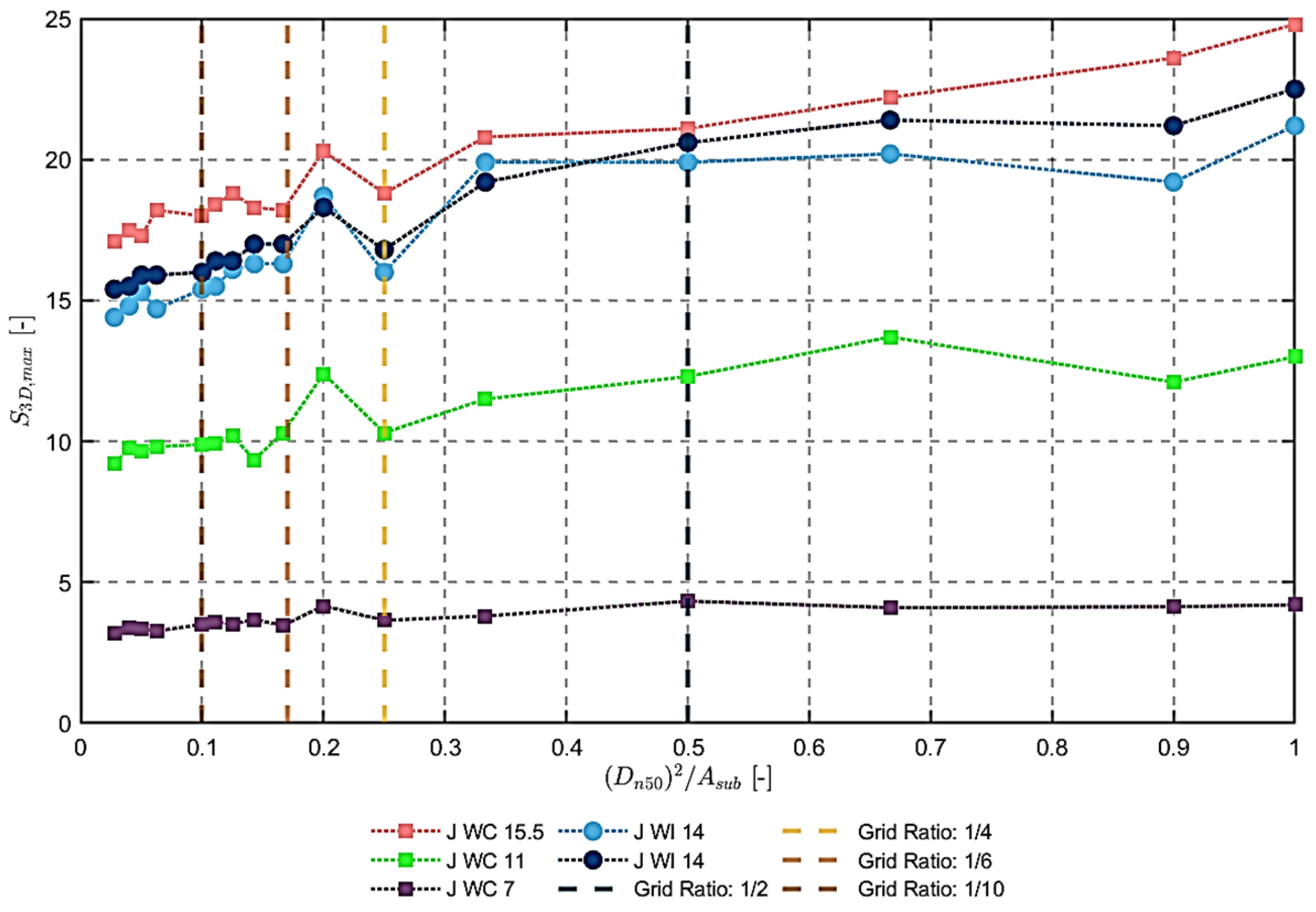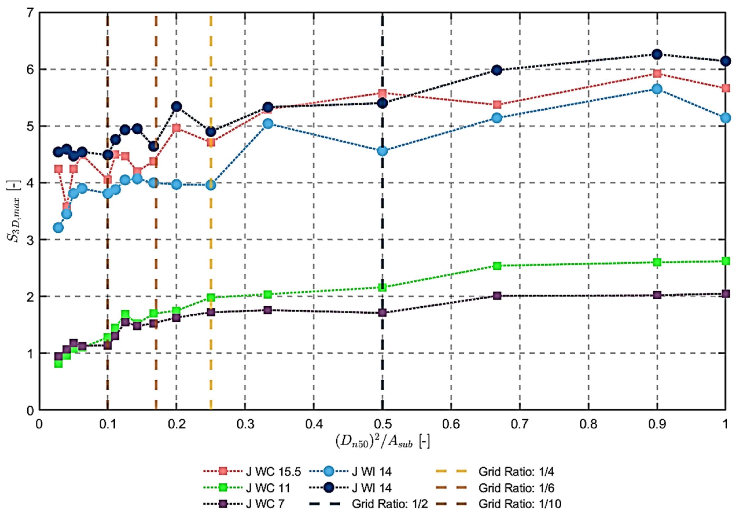 - Alternative scour metrics for scour protection performance: the S/ts and S3D/ns parameters, proposed as alternatives by [33] to better quantify and evaluate the performance of scour protections in complex offshore settings, can successfully identify when a protection is dynamic, closer to failure, and when failure occurs. These measurements shift the evaluation focus from the foundation to the armour layer itself, providing a clearer picture of relative performance. Both indicators outperform traditional parameters such as the S/D and the S3D > 1.0 threshold. However, the static limit may need to be reconsidered, as it can be overly conservative and result in thicker protections.
