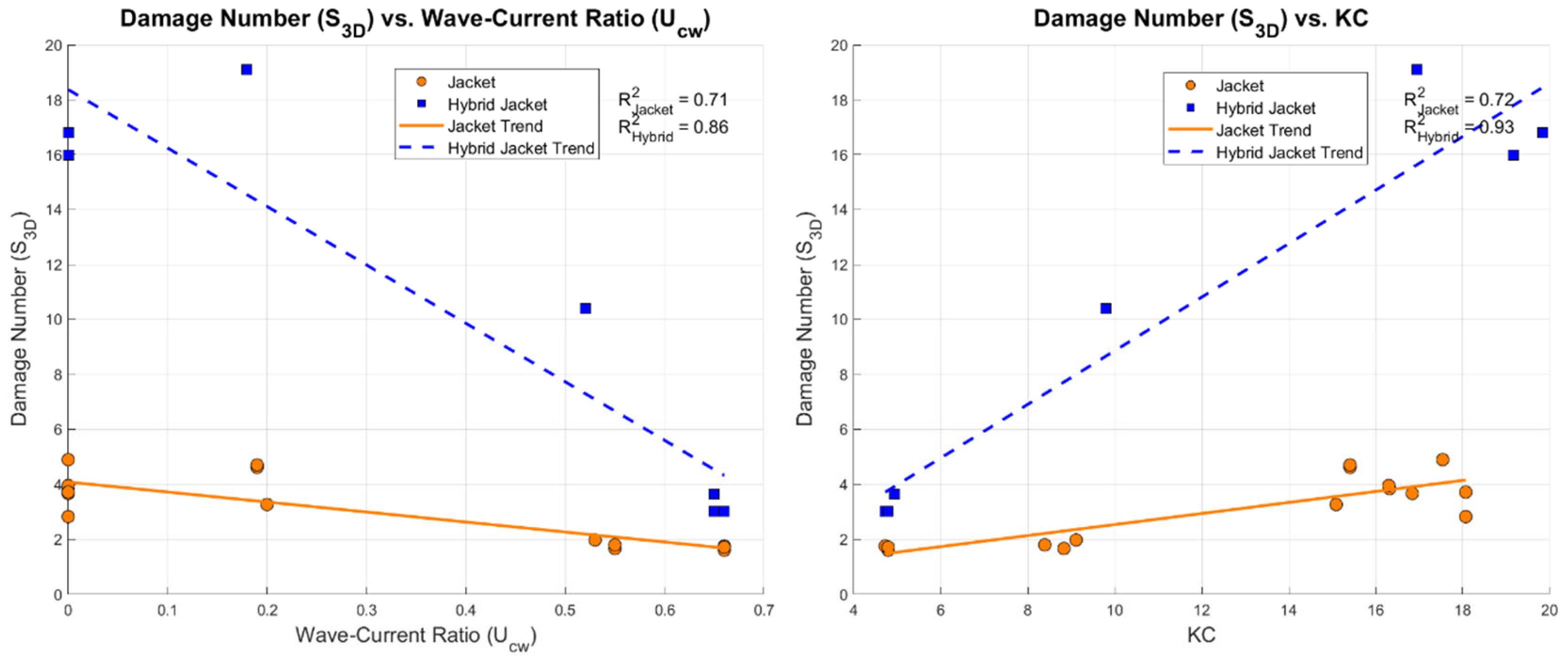 - Scour protection design predictive formulas limitations: the study’s findings raise some questions regarding the underestimation and application of current design standards, developed primarily for monopiles, which do not account for increased flow and structural complexity of other structures and hybrid configurations. Hybrid jackets failed prematurely, with massive damage rates, within the first 1000 waves. The results emphasise that currently, there is no methodology capable of effectively considering the additional loads caused by the interaction between sediment flow, WEC, and the structure.