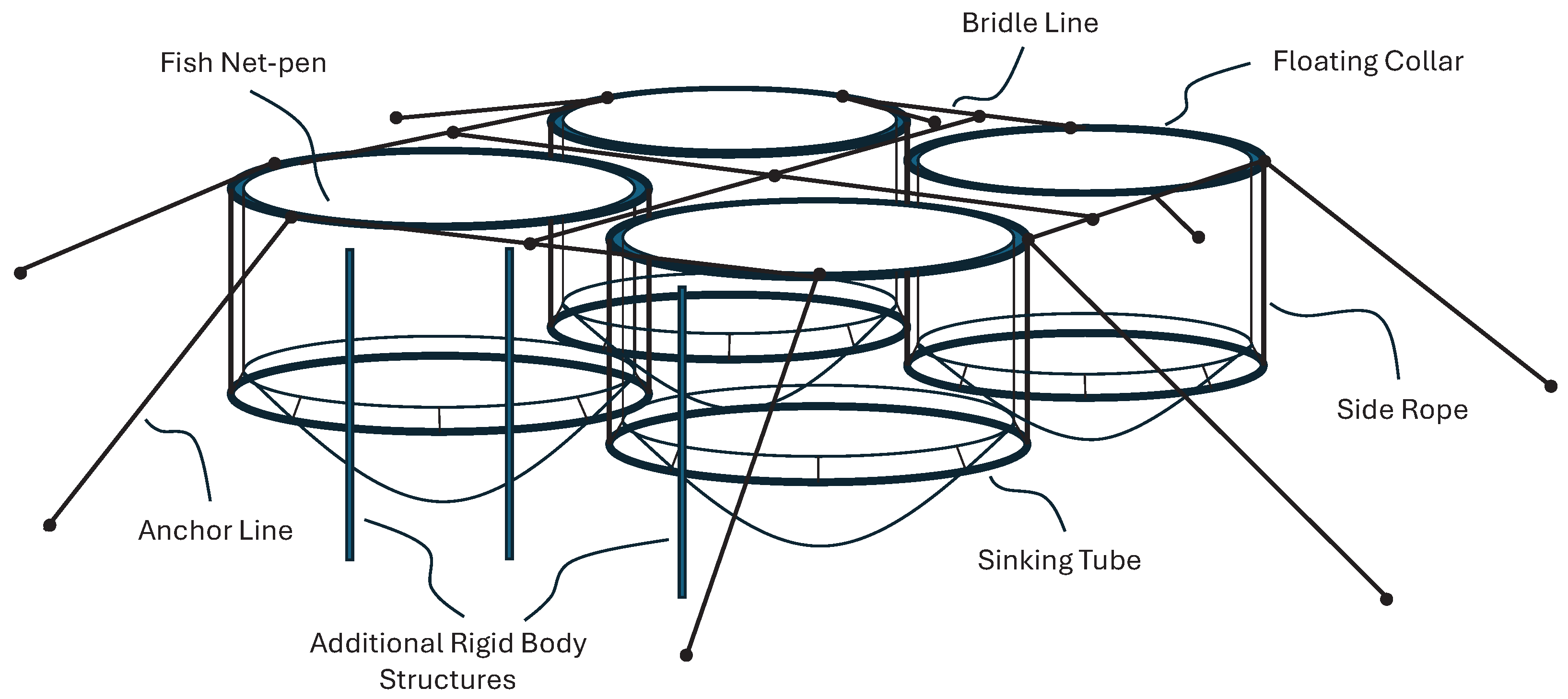 In this work, the operational definition of aquaculture infrastructure is the structure inside which fish (e.g., salmon) are cultivated. Generally, it consists of a floating collar, a fish net-pen, a sinker tube, a side rope, a mooring system, and a buoy. There are different types of aquaculture infrastructure, so not all aforementioned components are installed in all types. The following four types of aquaculture infrastructure are considered suitable for deploying the proposed cost-effective localisation system.