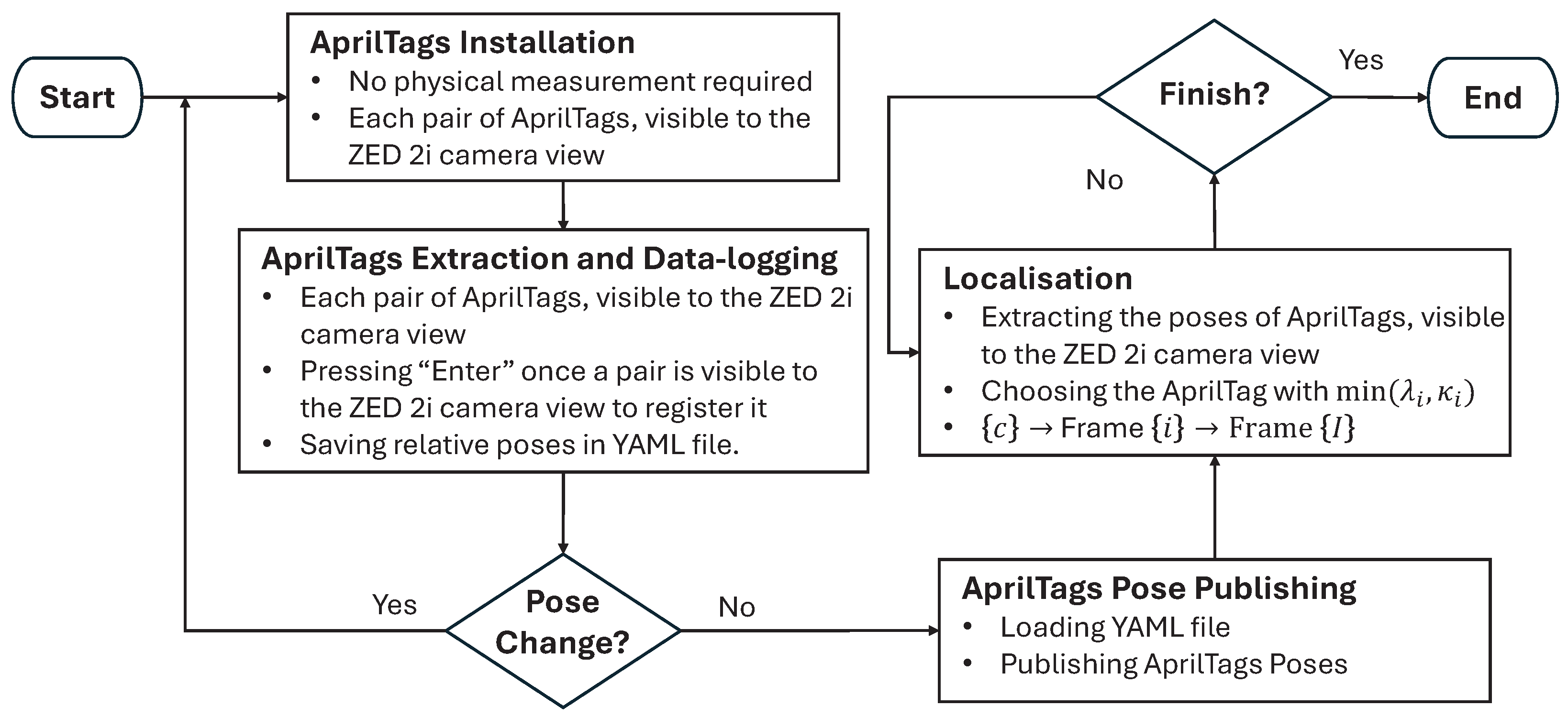 AprilTags extraction and data-logging of the relative poses of AprilTags can be carried out using the UUV’s camera. Alternatively, if a camera with better specifications (e.g., a high resolution, a larger field of view, or a high frame rate) is available, it can be used in place of the UUV’s camera. In either approach, the relative poses of AprilTags are stored in a YAML (Yet Another Markup Language) file at the end of the AprilTags extraction process. The stored YAML file can be utilised later for AprilTags pose publishing and localisation. The overall process of AprilTags extraction and data-logging is illustrated in