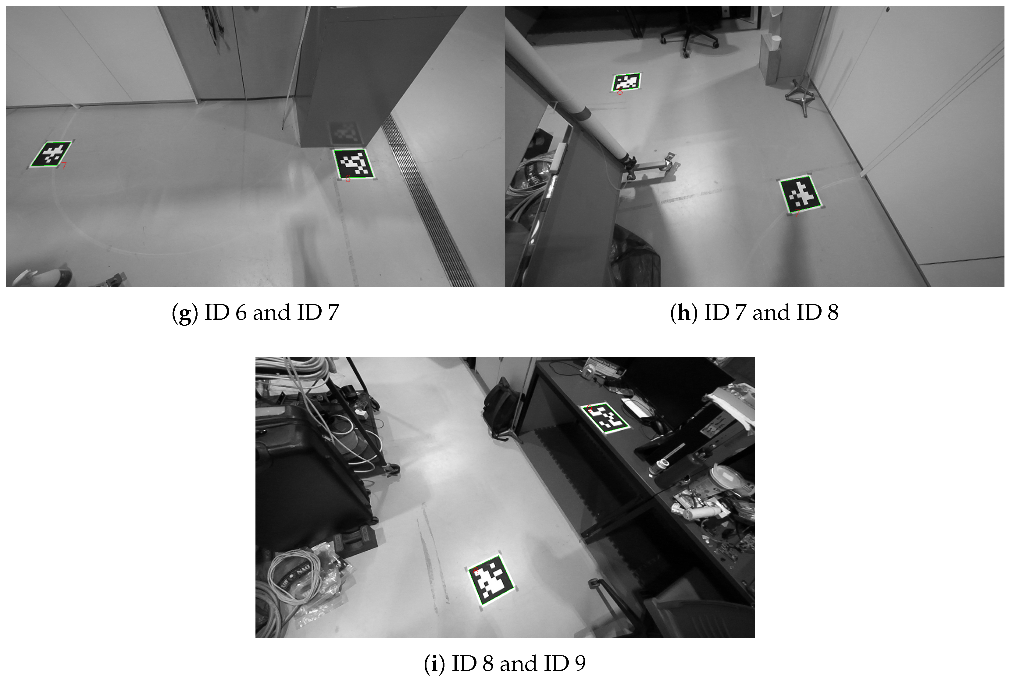 After all the aforementioned preliminary tests, 10 AprilTags are installed in the horizontal and vertical surfaces in the laboratory workspace of