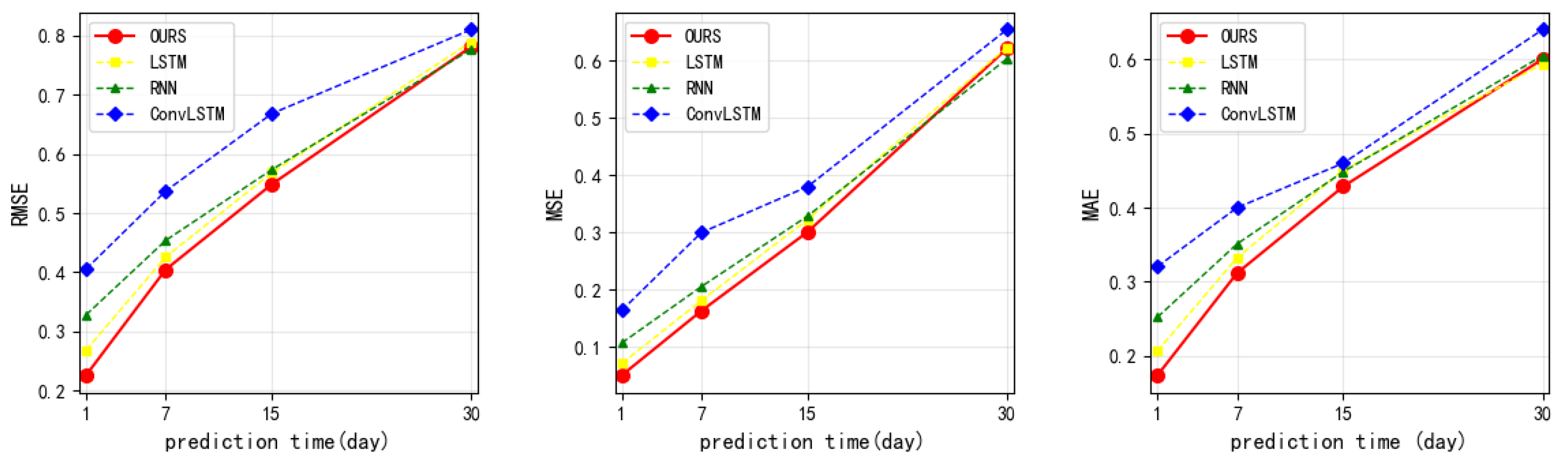Figure 3, which shows the error variations of different models under different forecasting horizons. The detailed analysis is provided as follows: First, from the perspective of prediction accuracy, the proposed model consistently outperforms the three baseline models across all forecasting horizons. For example, in terms of RMSE, the RMSE for one-day-ahead prediction is only 0.225, which is significantly lower than that of LSTM (0.268), RNN (0.328), and ConvLSTM (0.405). As the forecasting horizon extends to 7, 15, and 30 days, the RMSE of the proposed model remains at 0.404, 0.549, and 0.788, respectively, still maintaining a leading position and demonstrating strong long-term predictive capability. This advantage is also reflected in MSE and MAE metrics, indicating that the proposed model achieves superior overall error control.