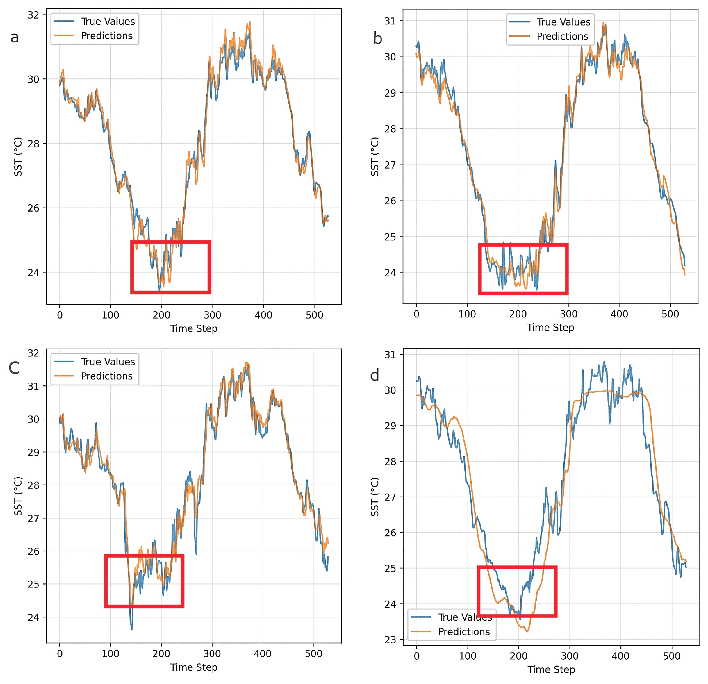 Figure 4 represent the predicted values and true values for the SST prediction task in one of the training processes using the proposed model, LSTM, ConvLSTM, and RNN models, respectively. The red boxes indicate areas with significant differences. The proposed model successfully captures the fluctuation trends of the true values, especially in the region highlighted by the red box. Its predicted curve closely matches the true value curve, demonstrating strong fitting ability in capturing temporal changes and temperature fluctuations. Compared to the other models, the proposed model performs more accurately in short-term predictions and in regions with rapid changes, as indicated by the red box, and effectively handles rapid temperature fluctuations. The LSTM model performs well in most time steps, but has larger errors in the red box region. Although LSTM is suitable for handling long sequences, its performance declines when facing more complex temperature variations, especially for high-frequency fluctuations. Similarly, ConvLSTM combines the advantages of convolution and LSTM, showing some advantages in capturing spatial features and temporal dependencies, but still faces difficulties in predicting sudden fluctuations. The RNN model, on the other hand, has poor overall fitting performance across all time steps, especially in areas with significant temperature fluctuations. Compared to the other models, the RNN’s predicted curve deviates significantly from the true values and cannot effectively track rapid temperature changes. The RNN model clearly shows limitations in capturing long-term dependencies and local changes.