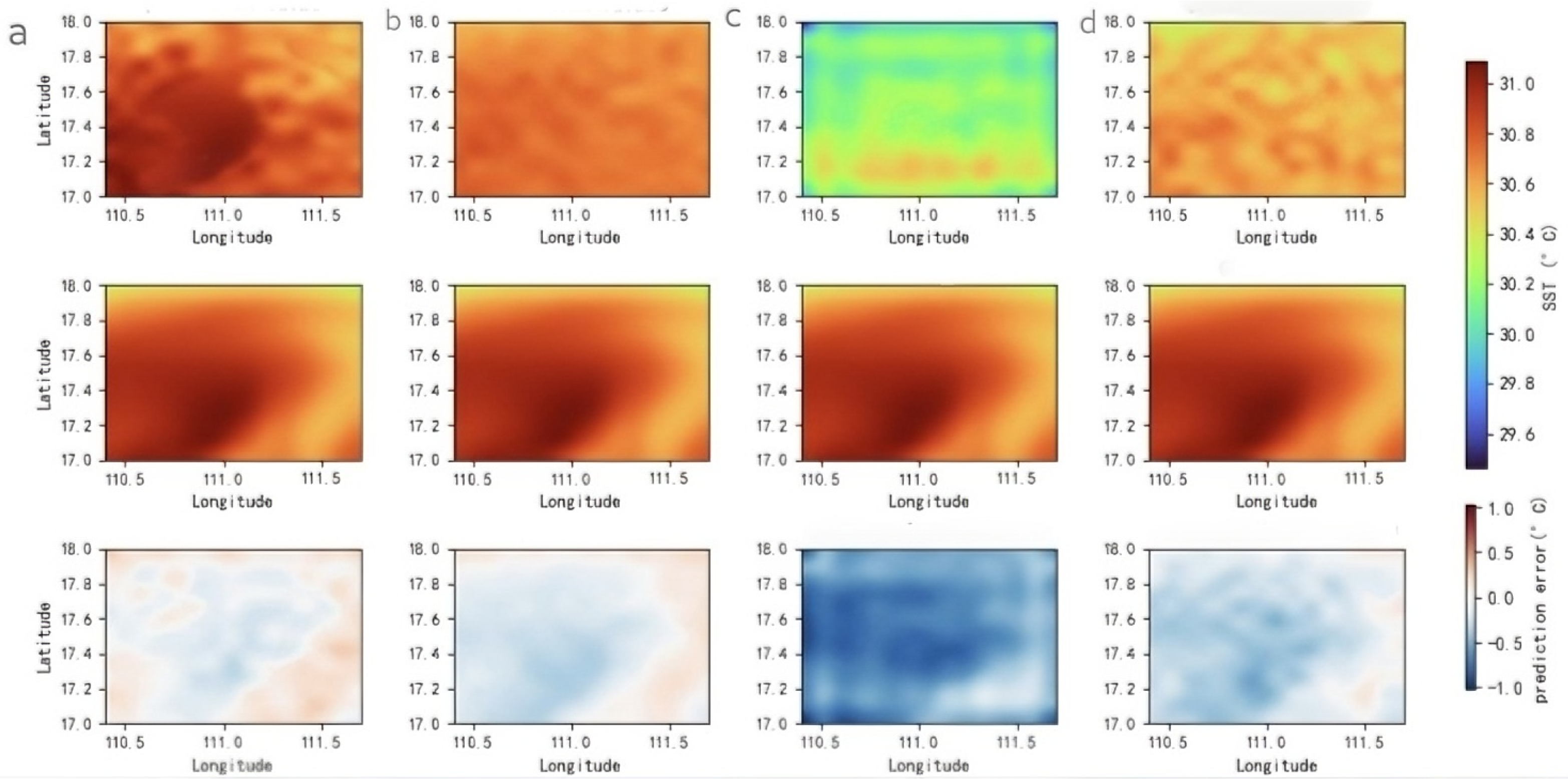 Figure 5 visualizes the prediction results and errors, demonstrating the model’s ability to extract and predict the spatial features of SST.