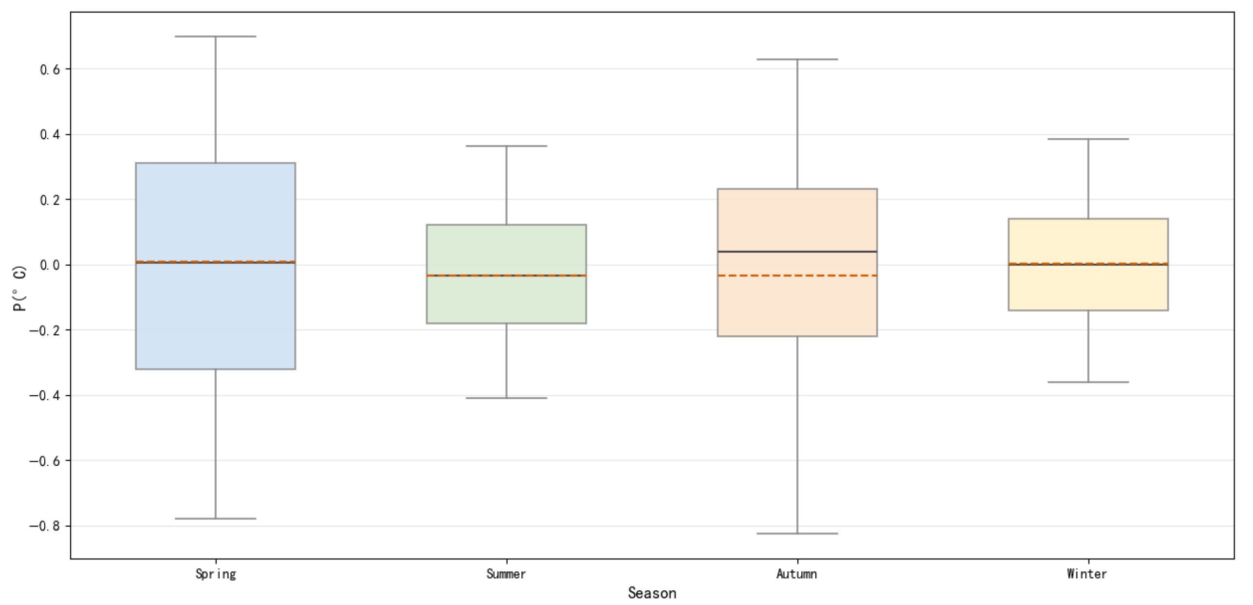 The prediction error in the Bohai Sea is the highest, with an RMSE of 0.642, and both MSE and MAE are significantly higher than in other regions. Analysis reveals that the Bohai Sea may be affected by stronger pollution, weather influences, and other factors, leading to errors in data collection. Noisy data can impact the model’s learning process, resulting in larger errors. Additionally, the Bohai Sea, located in northern China, experiences strong seasonal and extreme climate phenomena, which cause significant fluctuations in SST. The presence of industrial, fishery activities, and coastal cities around the Bohai Sea may lead to significant human impacts on seawater temperature changes. For the model, these human factors are usually difficult to model accurately, which in turn leads to increased errors.