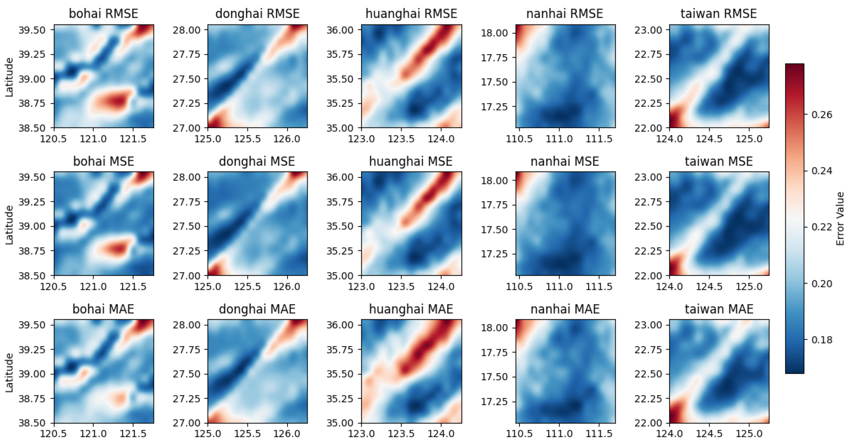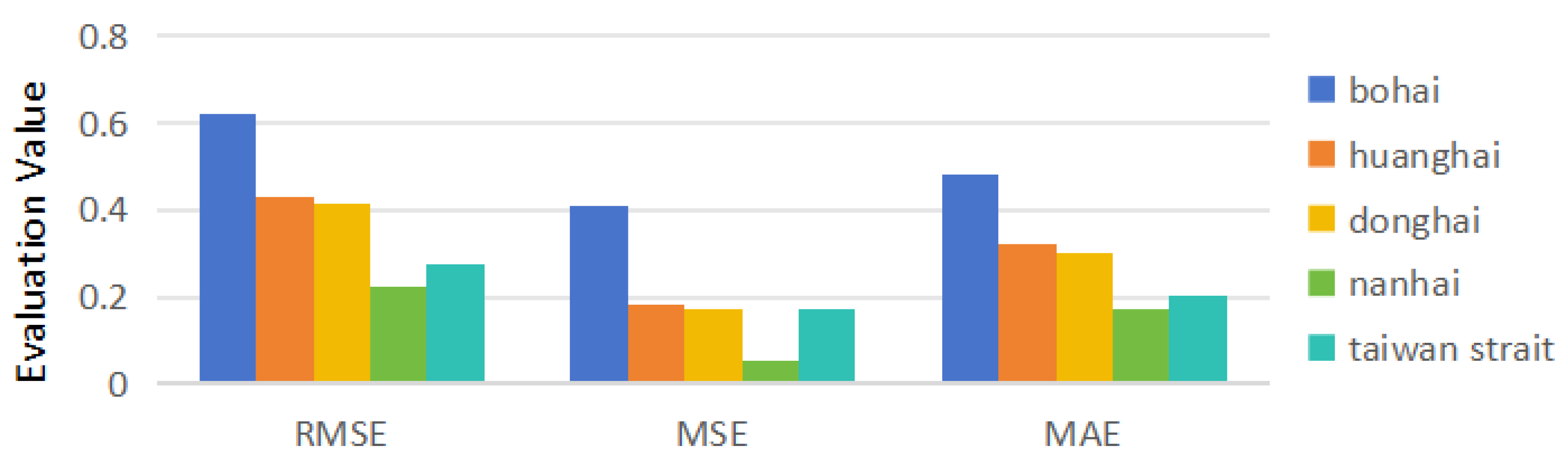 To comprehensively evaluate the generalization capability and robustness of the proposed model under different geographical regions, climate patterns, and dynamic environments, five representative offshore regions of China were selected for experiments: the Bohai Sea, the Yellow Sea, the East China Sea, the South China Sea, and the Taiwan Strait. These regions are distributed across temperate, subtropical, and tropical seas, featuring significant climatic differences and diverse oceanographic dynamics. Therefore, the experiments are both representative and broadly applicable. The experimental results are shown in