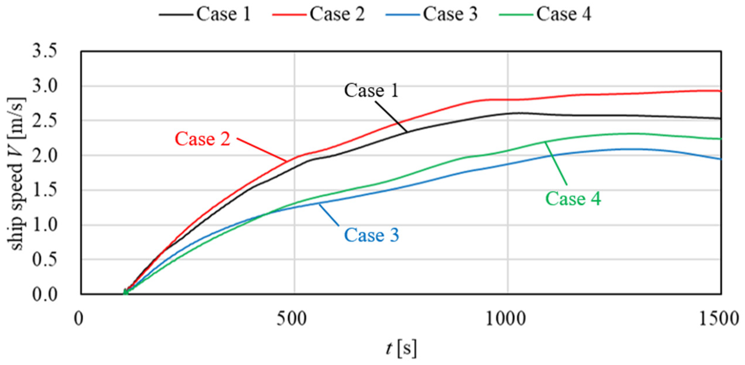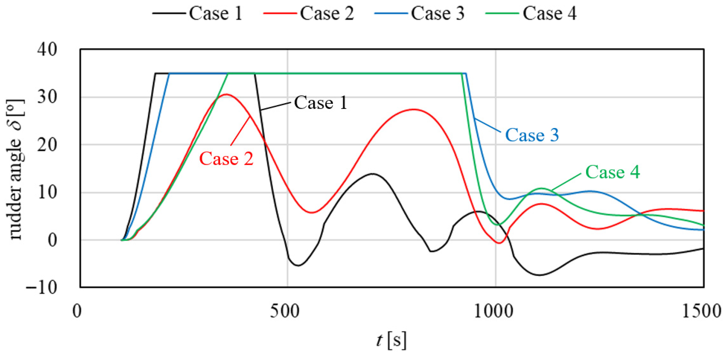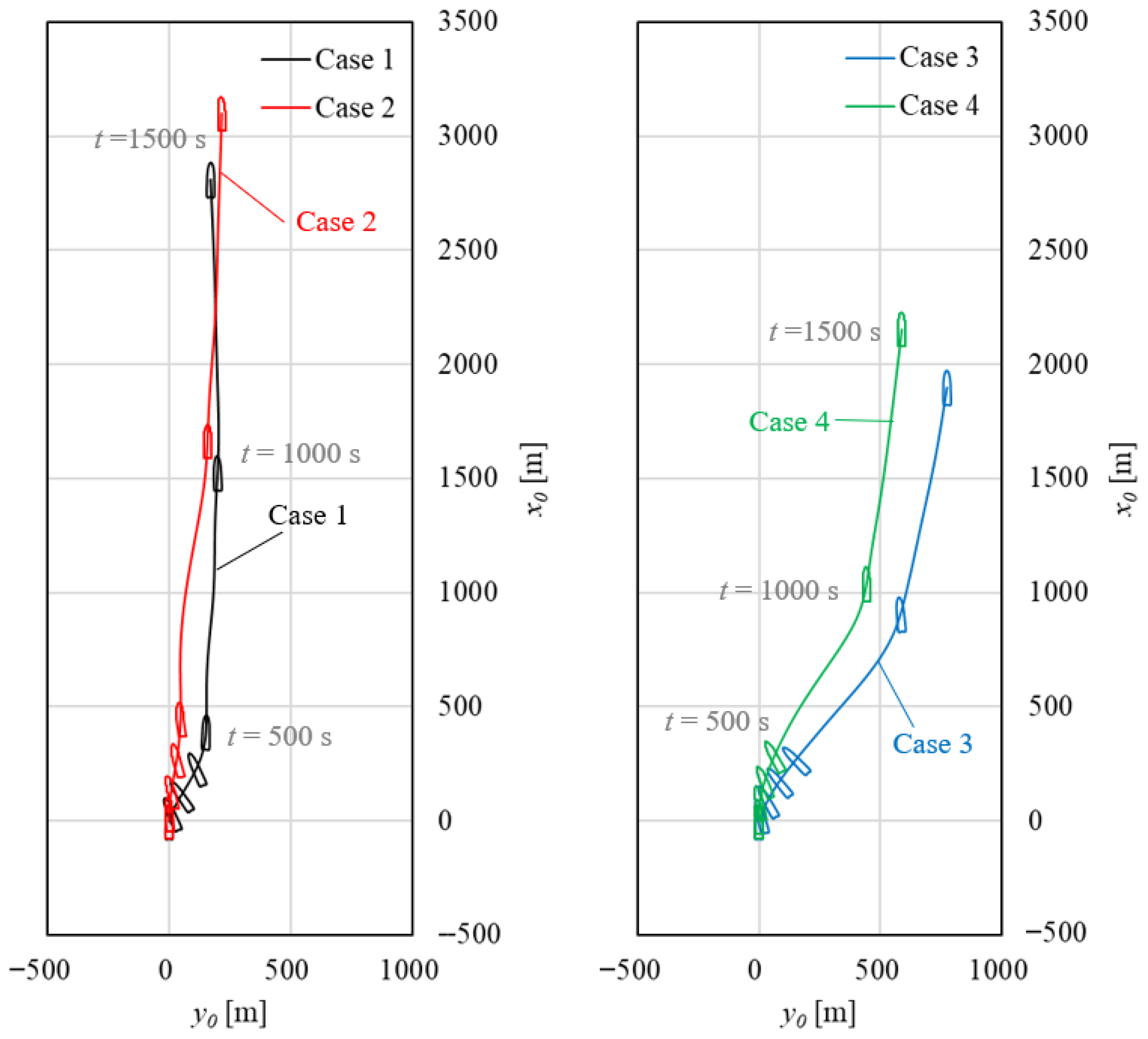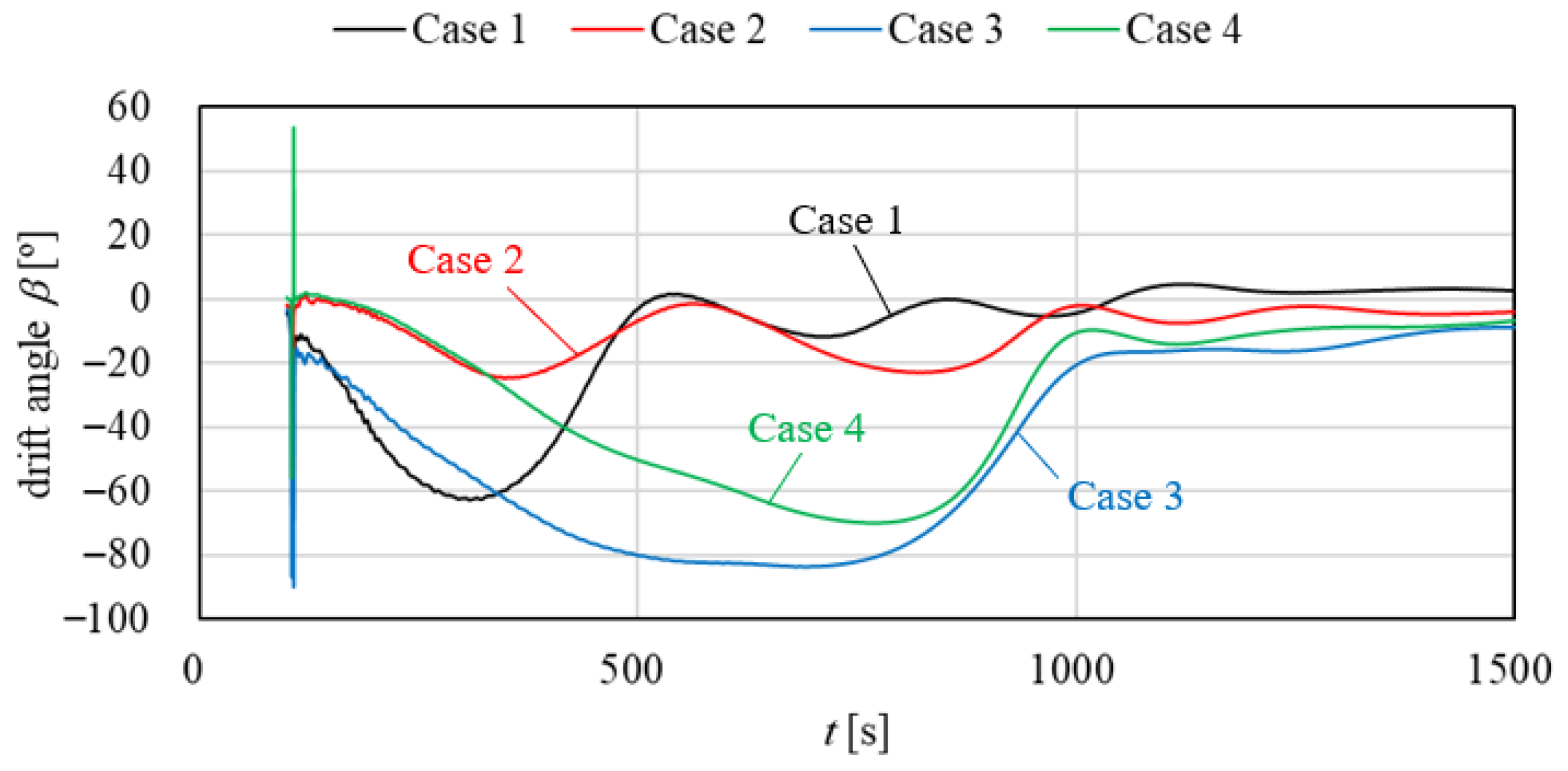 | Favorable tendencies | Tends to converge to a larger-magnitude steady-state drift (leeway) angle than Case 4 under the present conditions | Tends to achieve a higher steady-state speed |