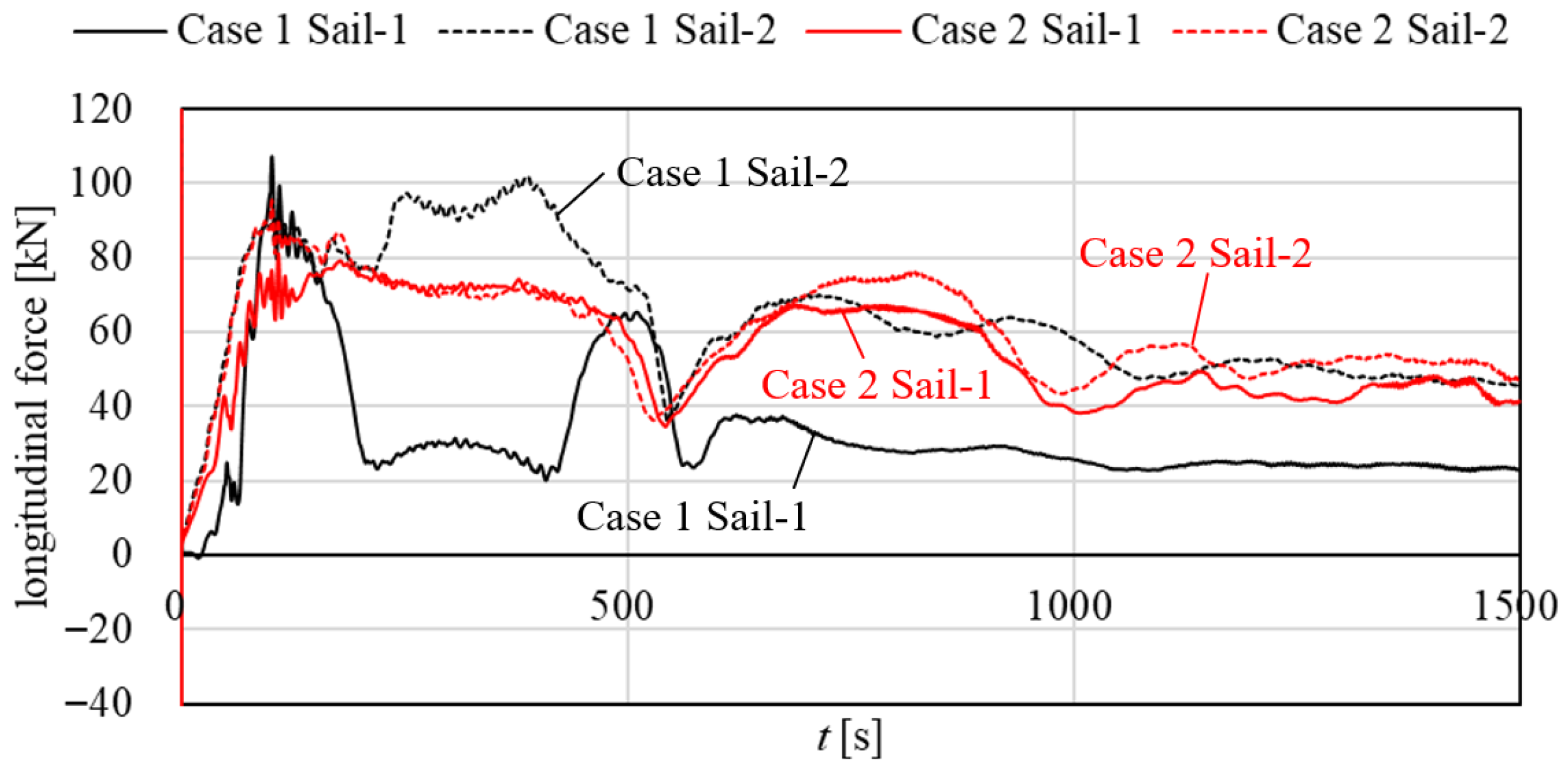 Time histories of the longitudinal force (force in the -direction) acting on each wing sail for Cases 1 and 2.