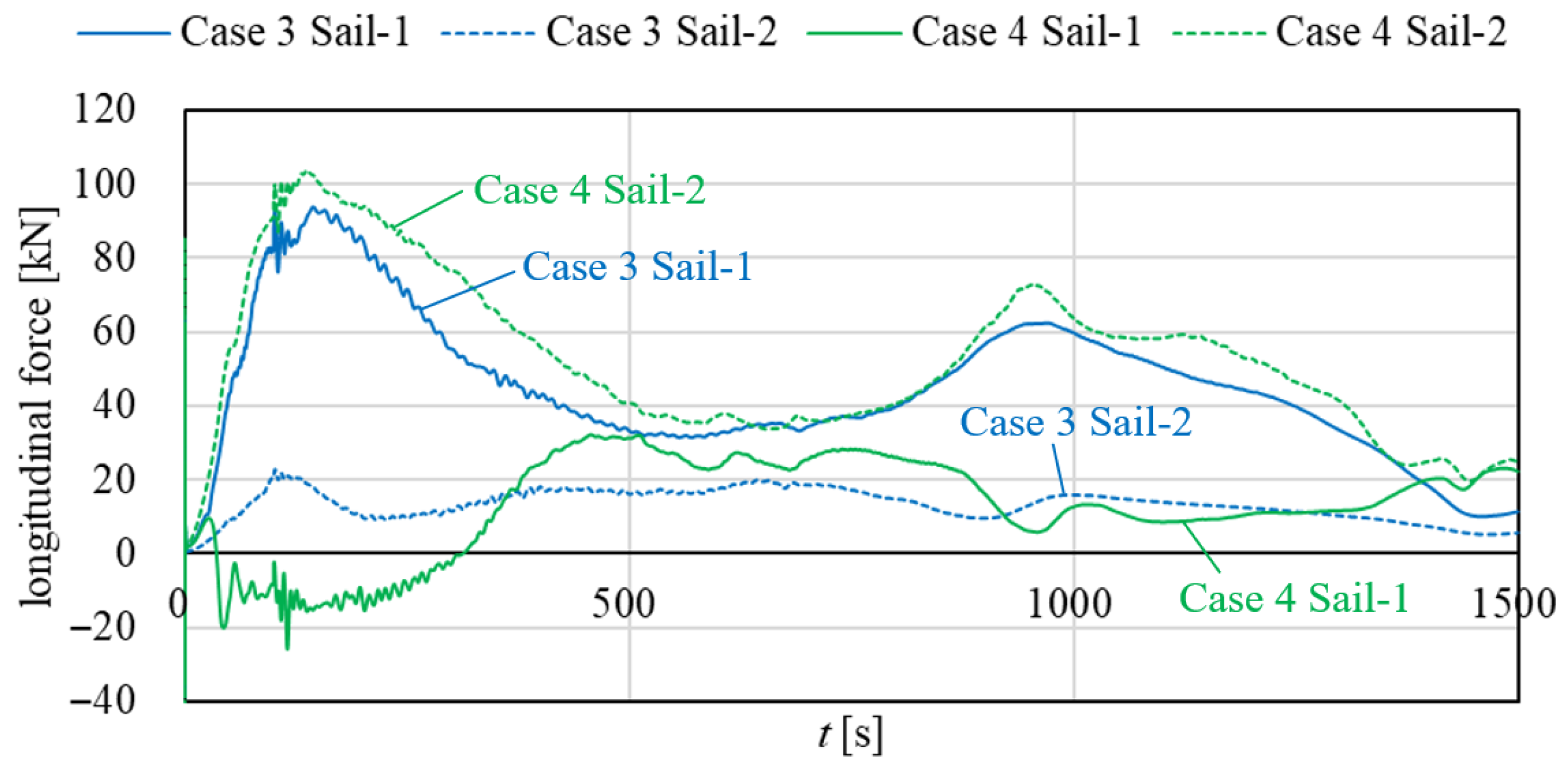 Time histories of the longitudinal force (force in the -direction) acting on each wing sail for Cases 3 and 4.