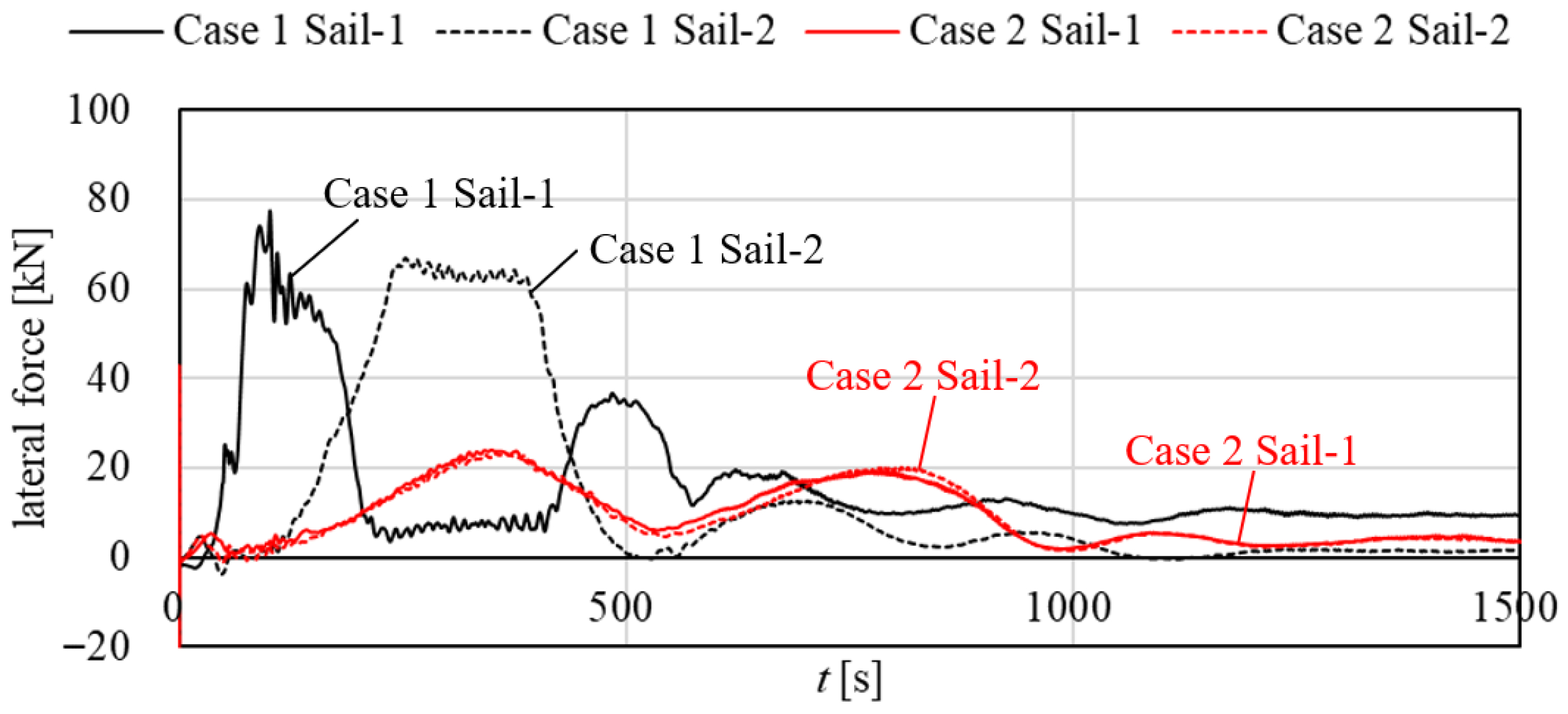 Time histories of the lateral force (force in the -direction) acting on each wing sail for Cases 1 and 2.
