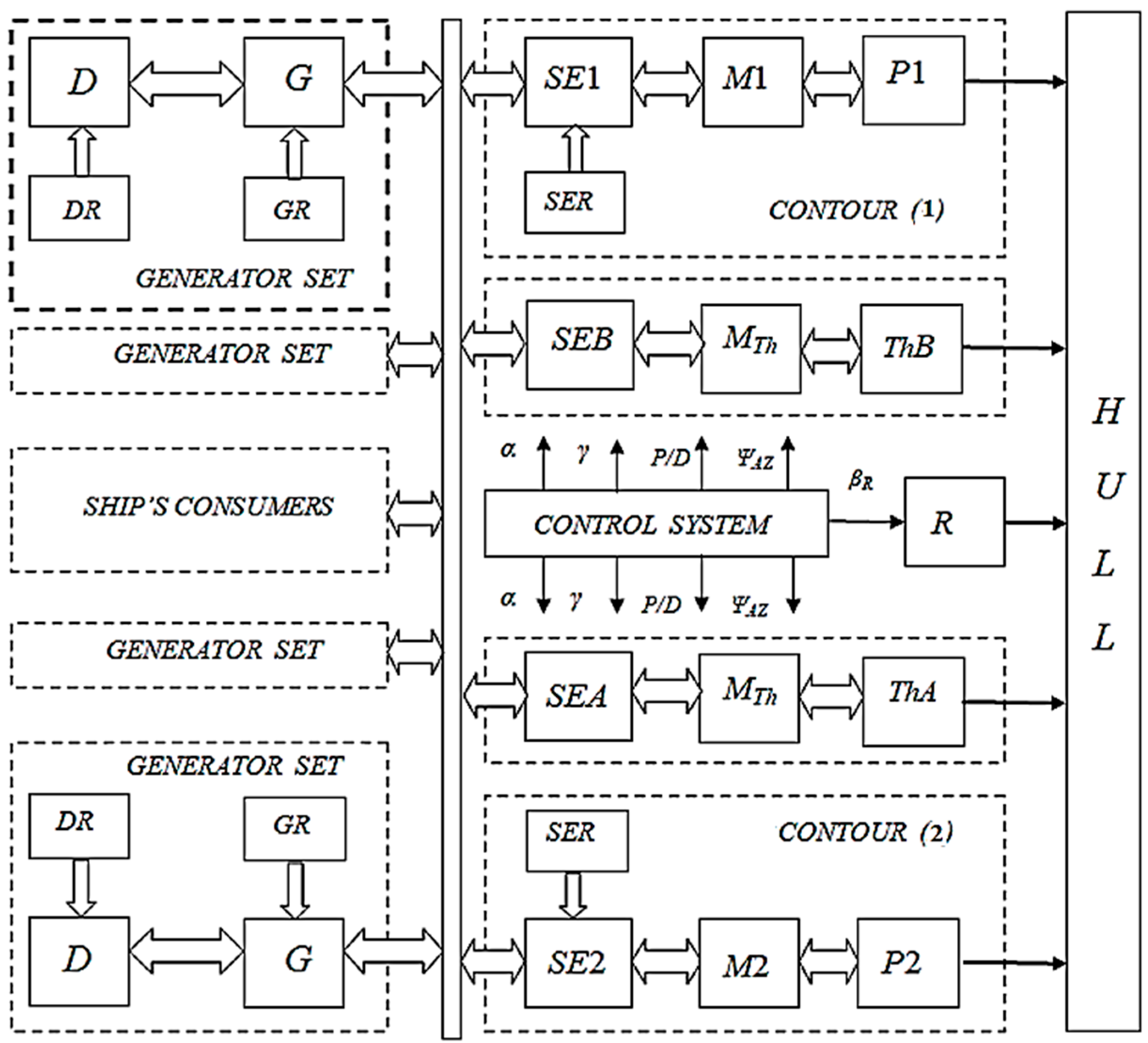 - Power circuits of steering devices, which include: voltage converters (SEA, SEB), asynchronous squirrel-cage electric motors (MThA, MThB) and adjustable pitch steering propellers (ThA, ThB);
