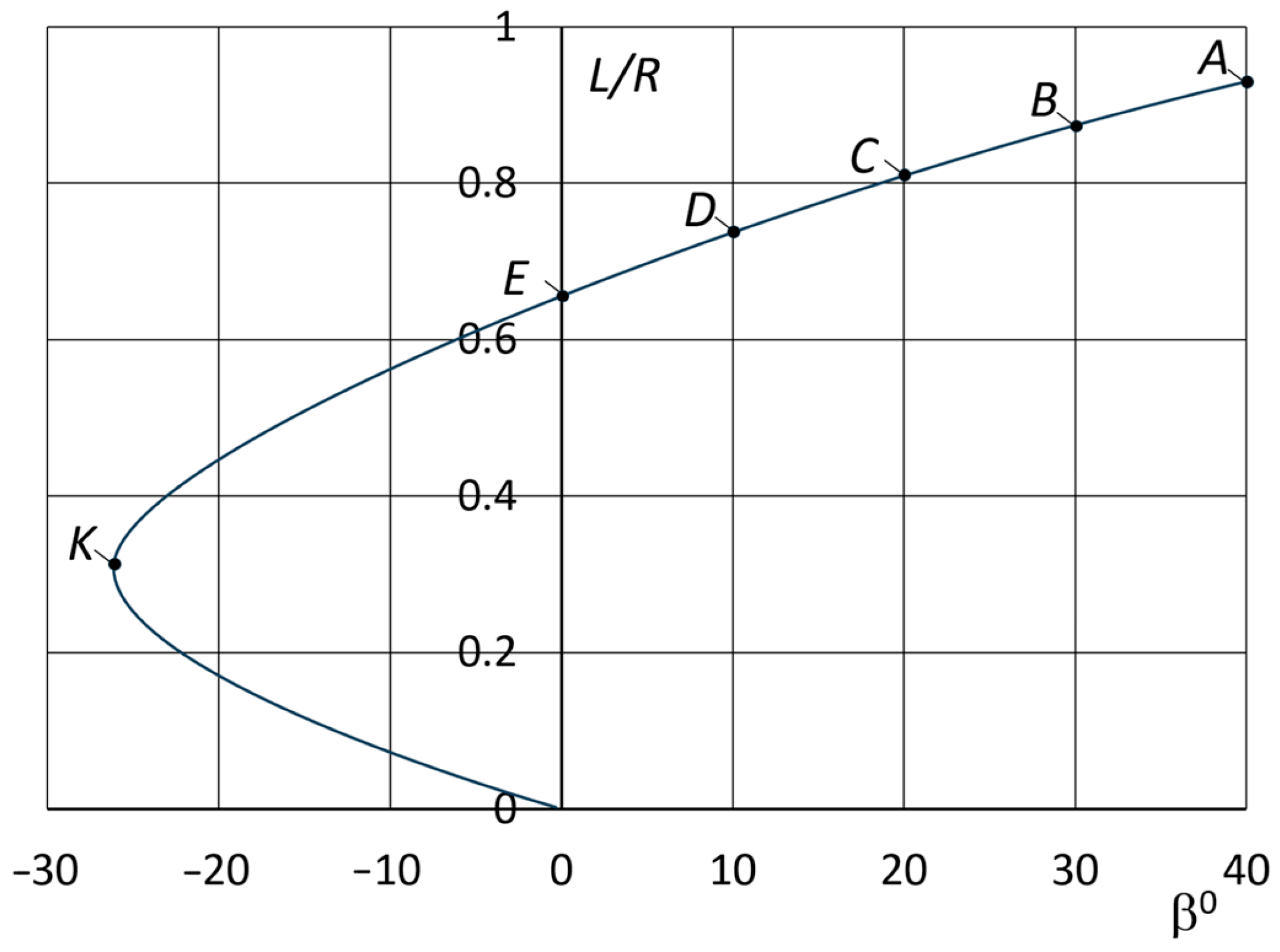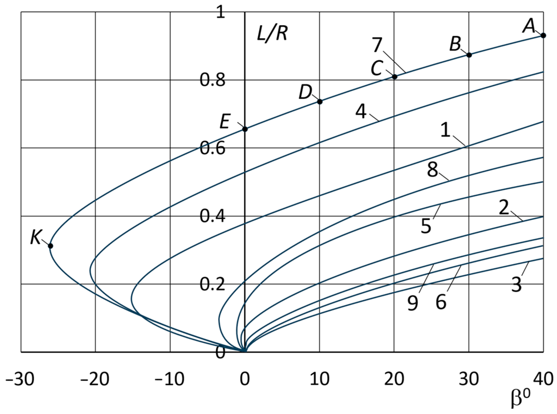| β = 40° | β = 30° | β = 20° | β = 10° | β = 0° | βcr | (L/R) βcr | ||