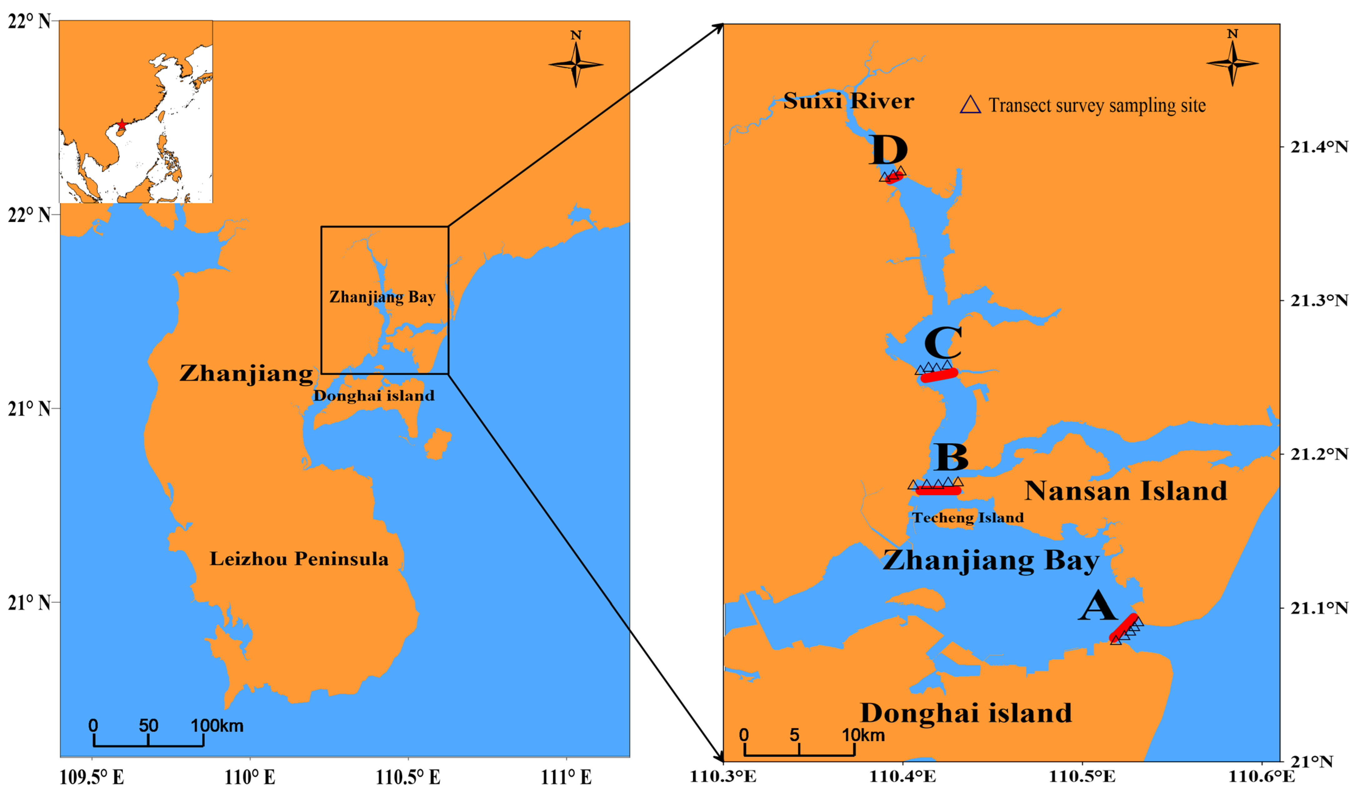 - Wang, S.; Zhou, F.; Chen, F.; Meng, Y.; Zhu, Q. Spatiotemporal Distribution Characteristics of Nutrients in the Drowned Tidal Inlet under the Influence of Tides: A Case Study of Zhanjiang Bay, China. Int. J. Environ. Res. Public Health 2021, 18, 2089. [Google Scholar] [CrossRef]