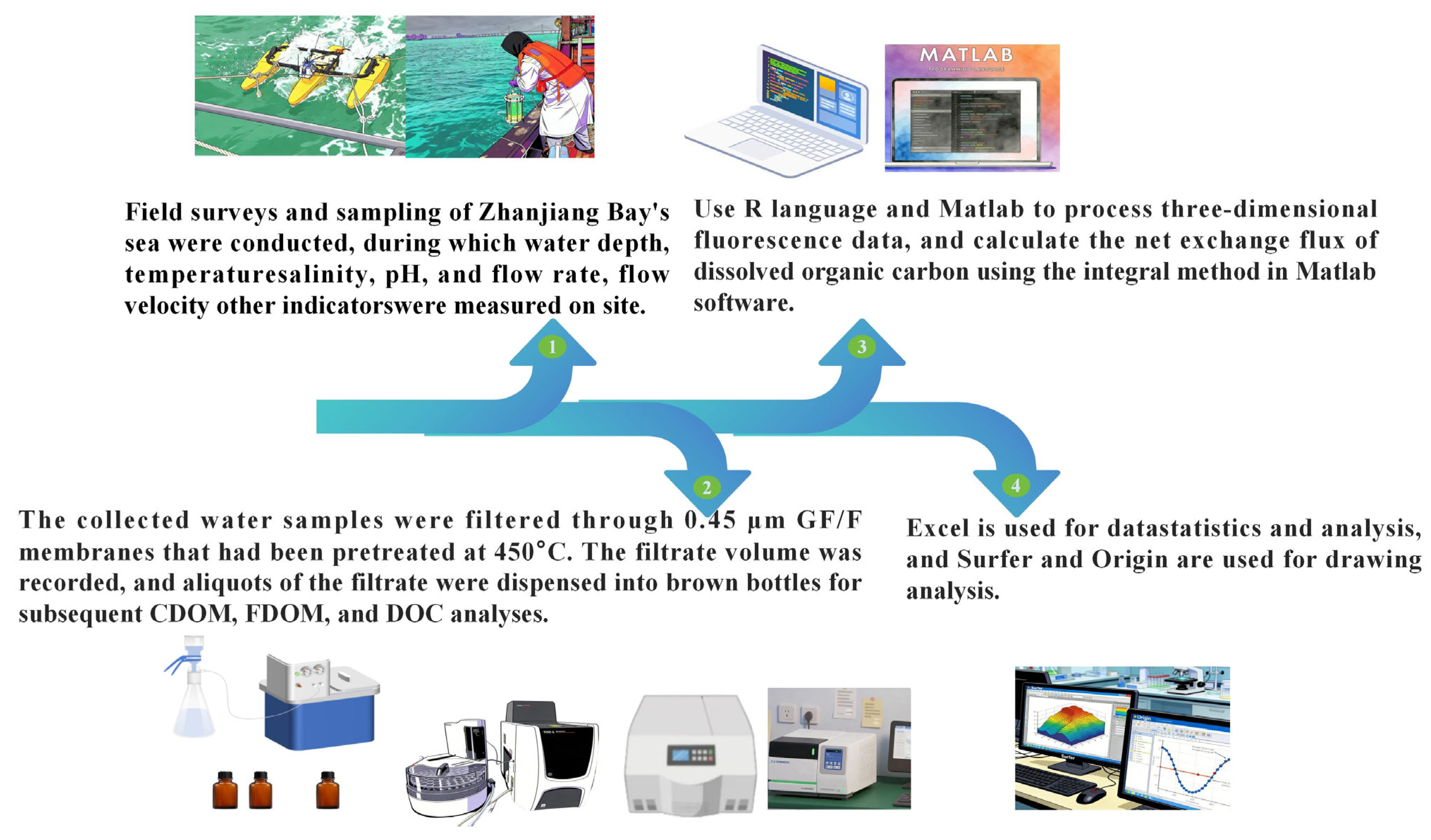 - Wang, C.; Jiang, K.; Wang, X.; Huang, P.; Liu, P.; Chen, F.; Jin, G. Human-driven spatial and temporal contrasts in dissolved organic matter from submarine groundwater discharge and river runoff to Zhanjiang Bay, northern South China sea. Mar. Environ. Res. 2025, 210, 107340. [Google Scholar] [CrossRef] [PubMed]