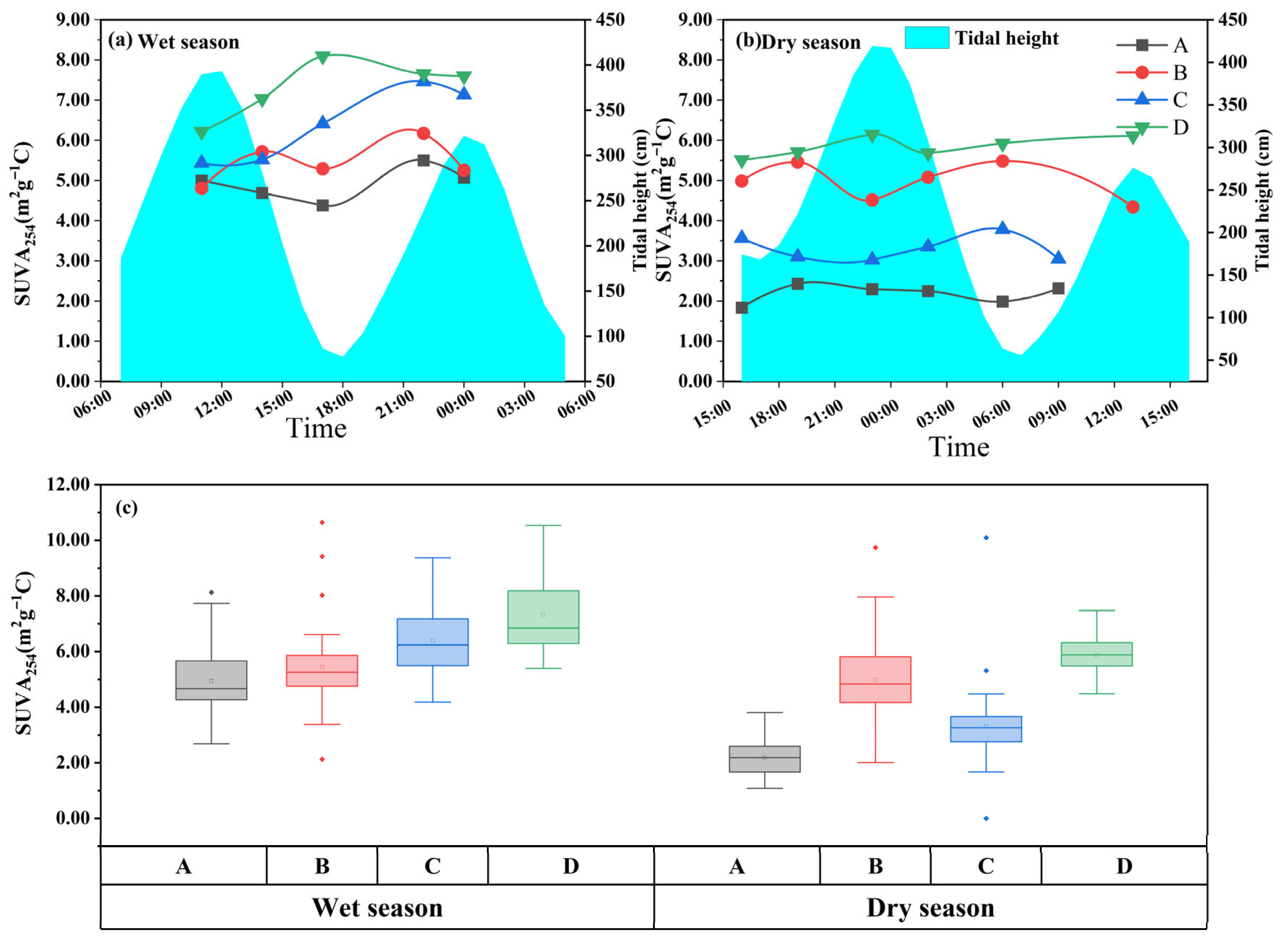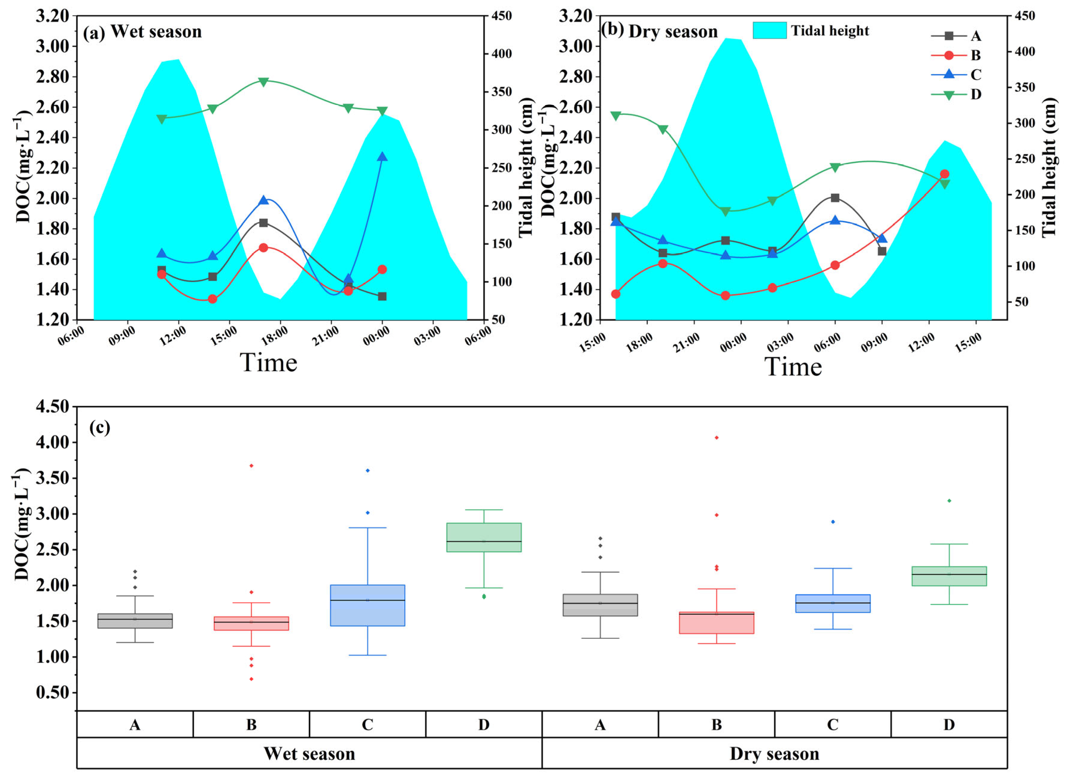 3.2. Characteristics of DOC Under Tidal Dynamic Changes